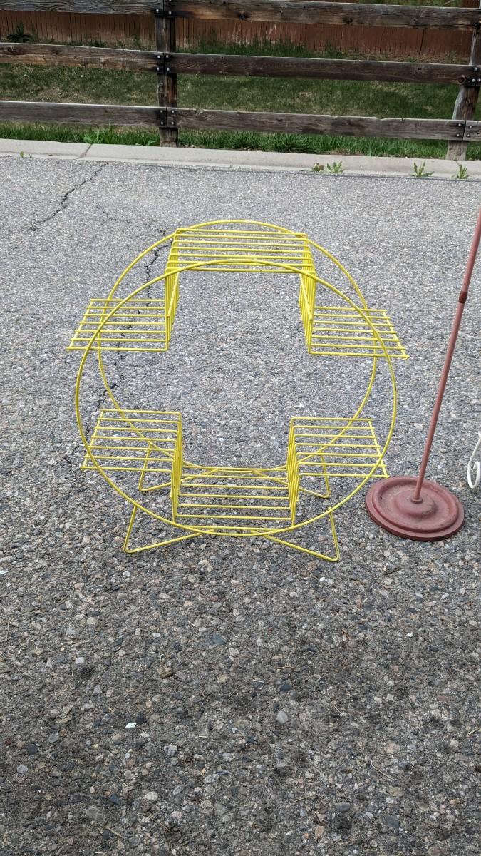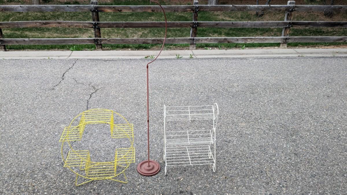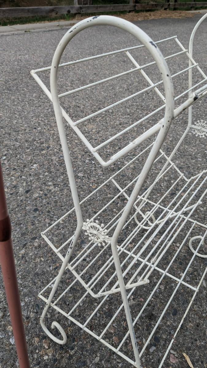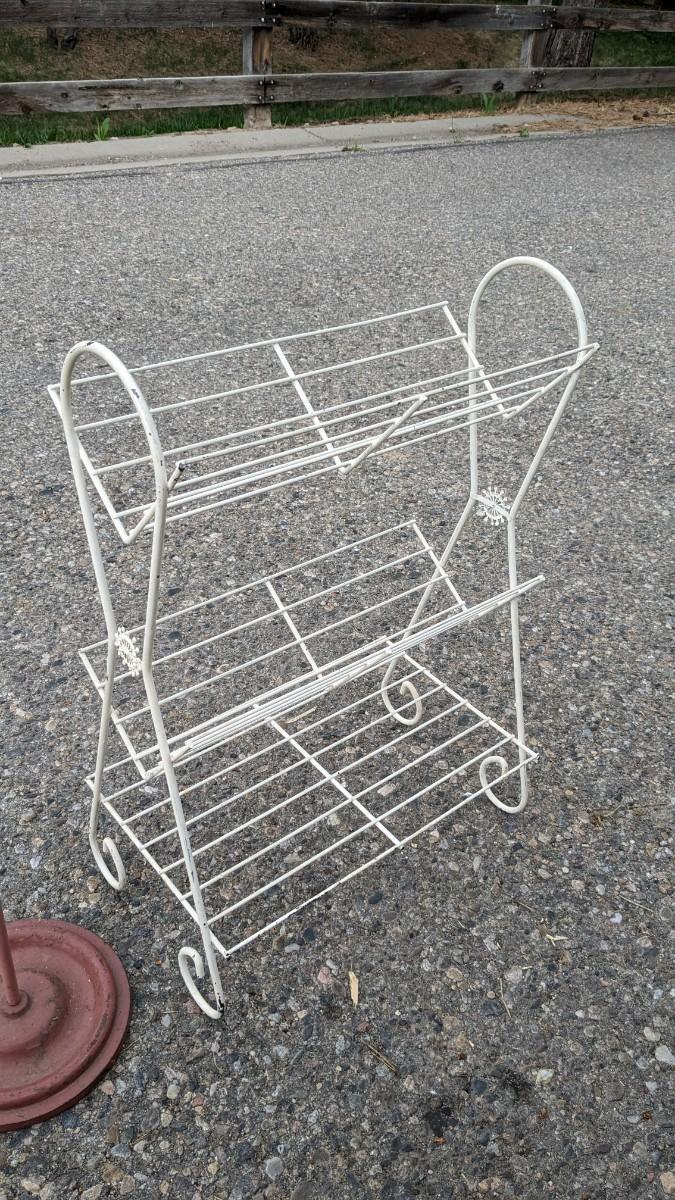 quintessential round plant stand, lovely media rack with floral accents, and pink free standing plant hanger/birdcage stand. No shipping.