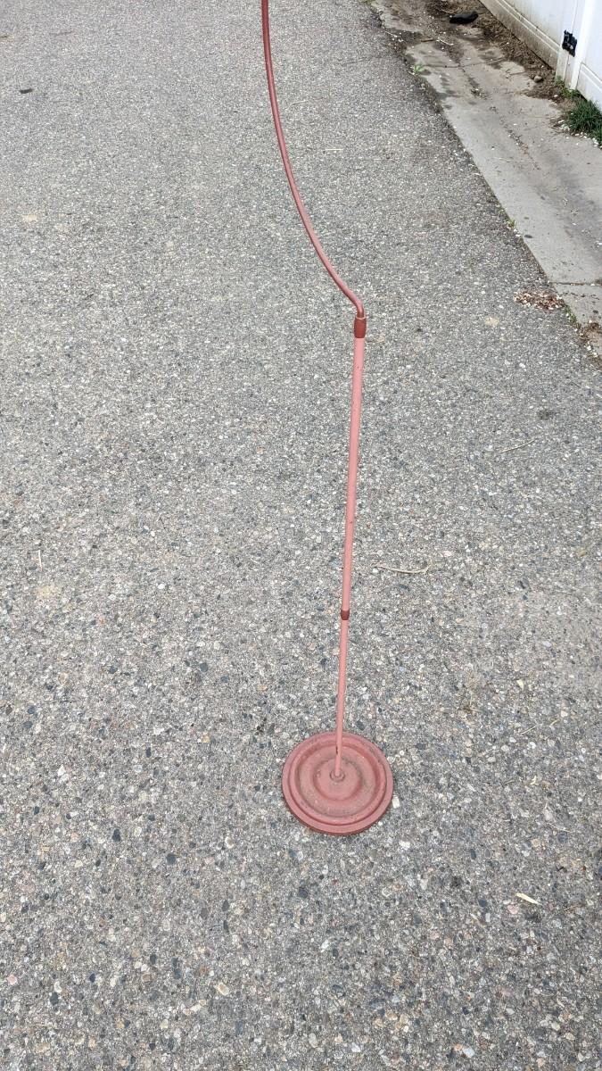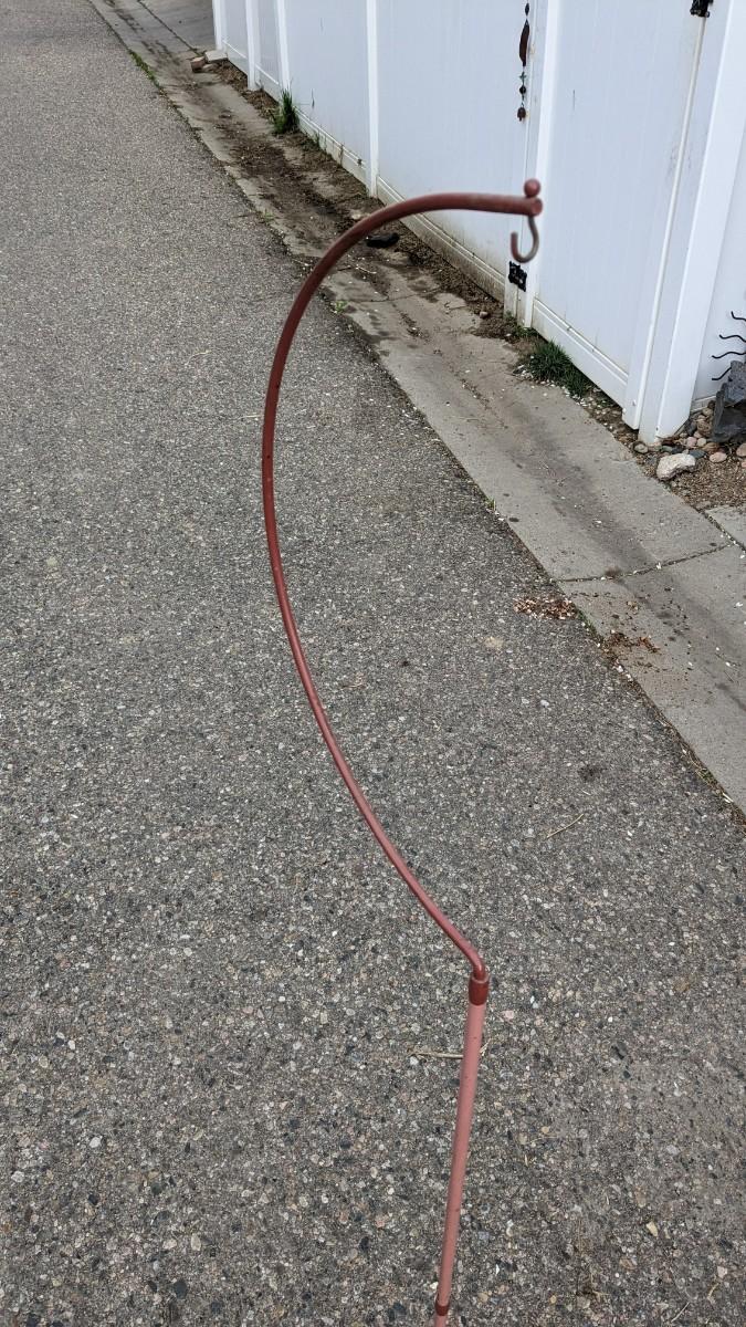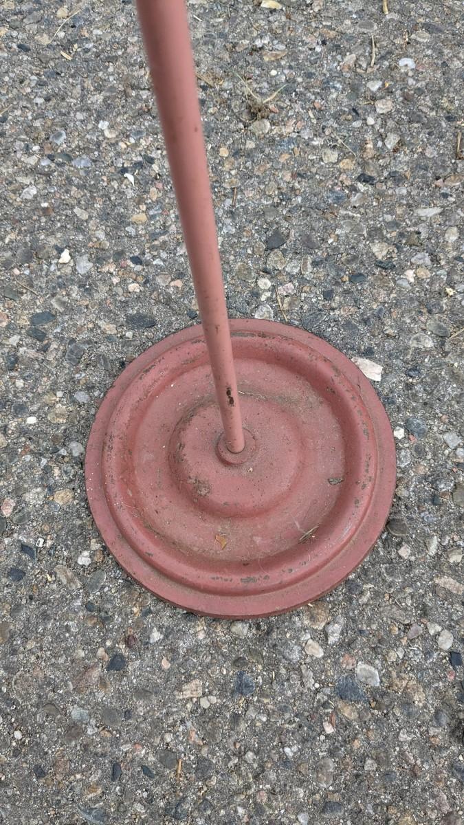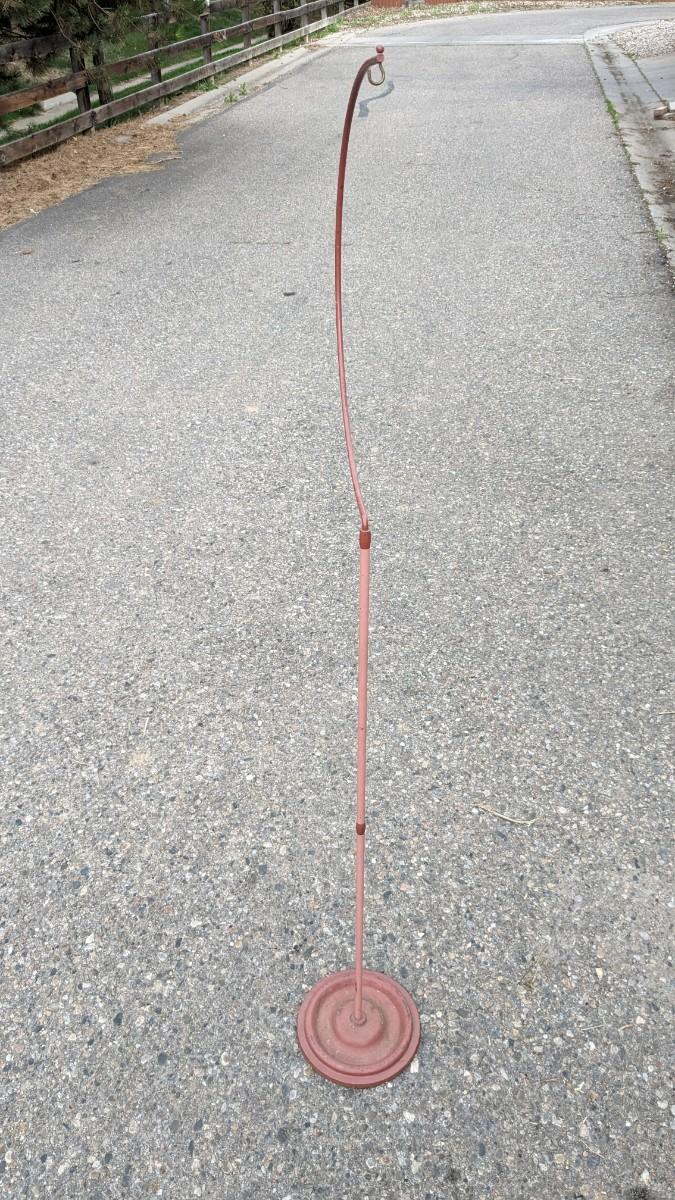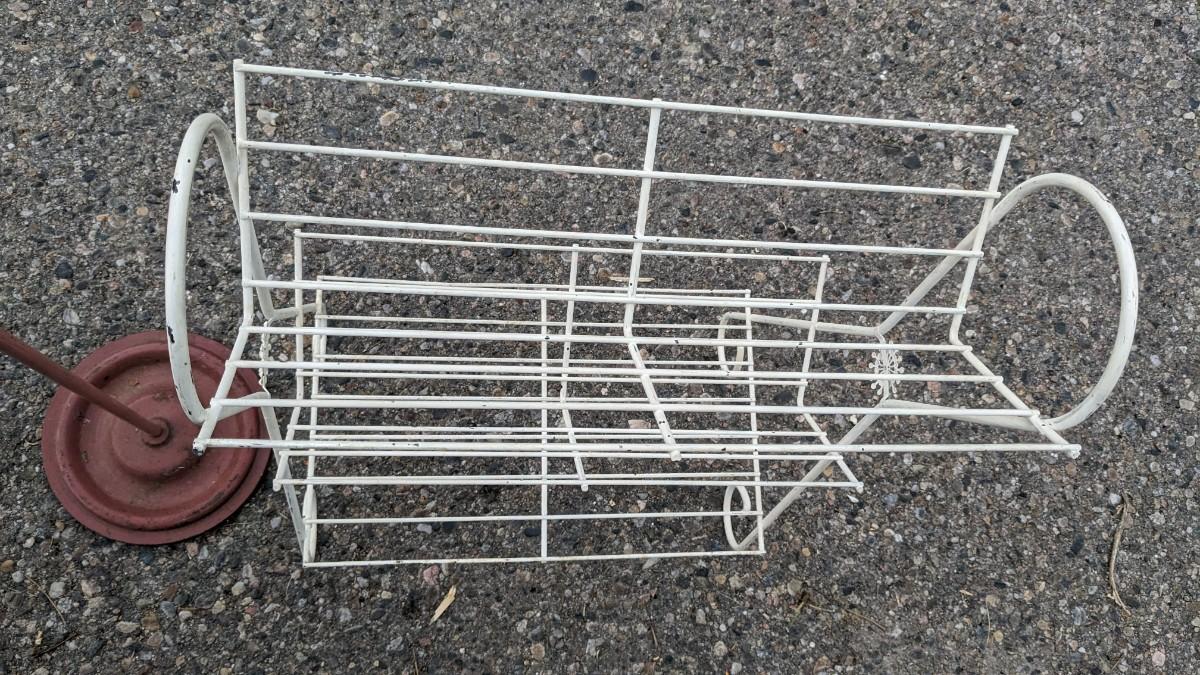 quintessential round plant stand, lovely media rack with floral accents, and pink free standing plant hanger/birdcage stand. No shipping.