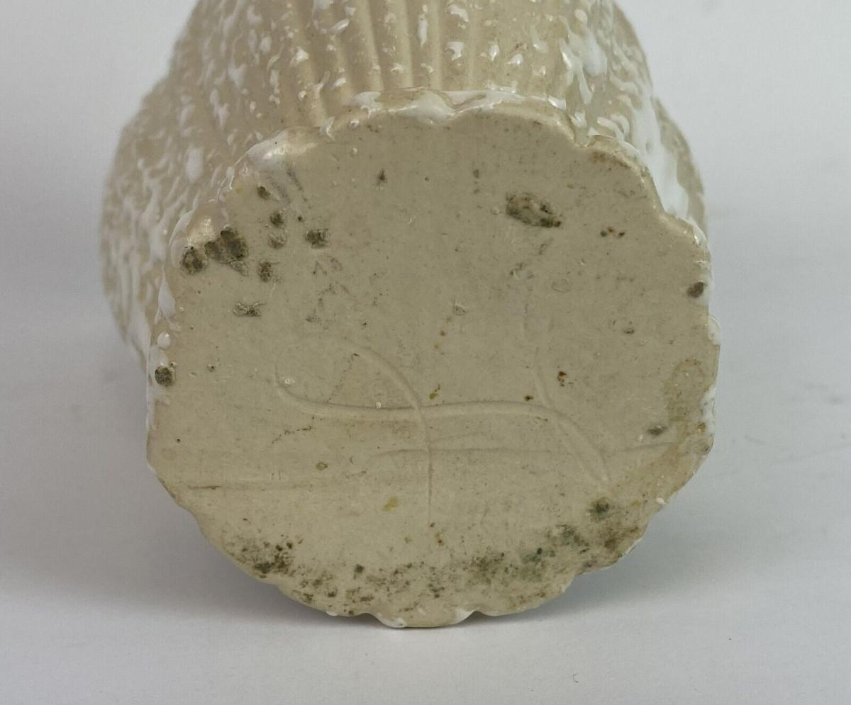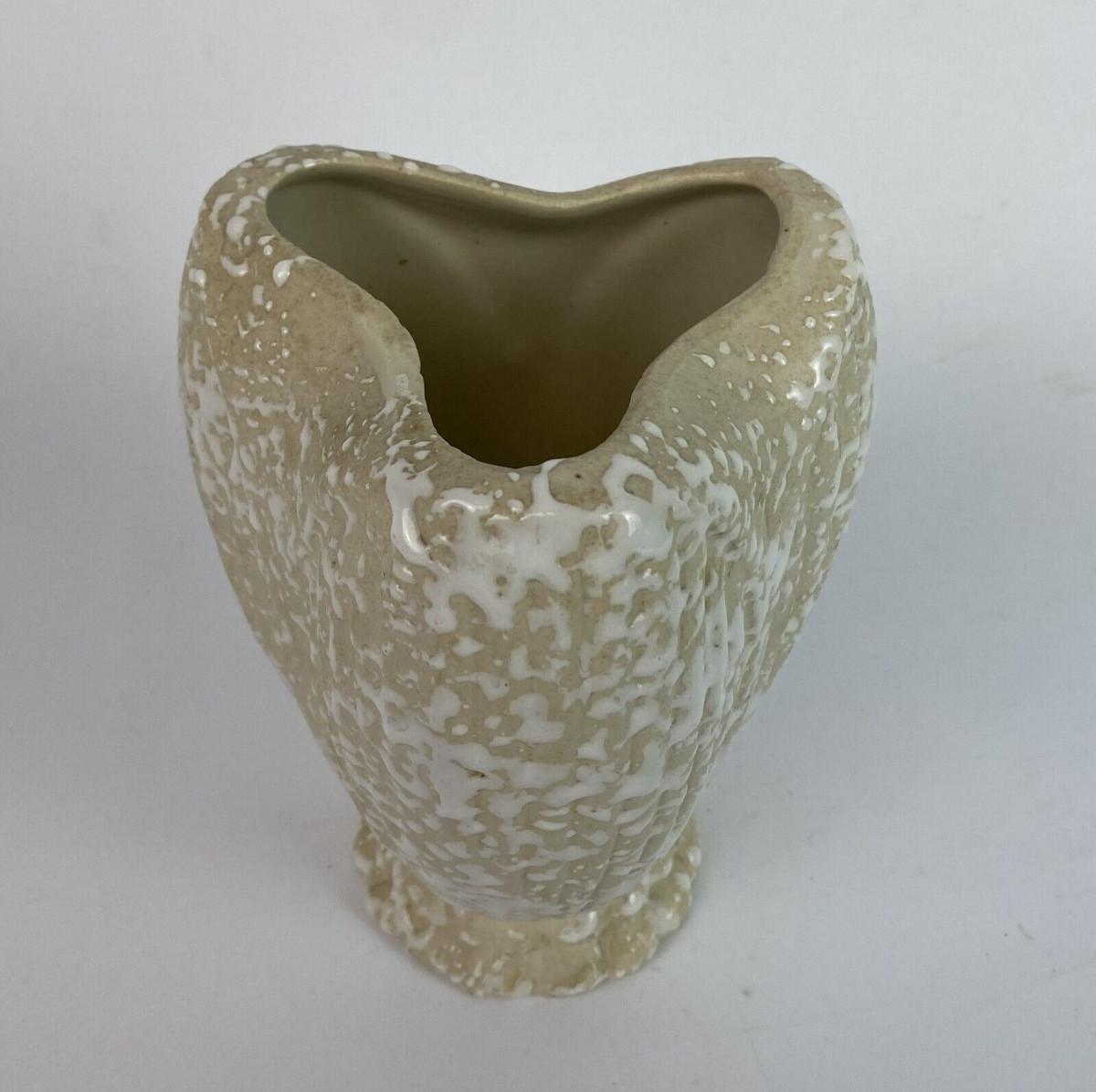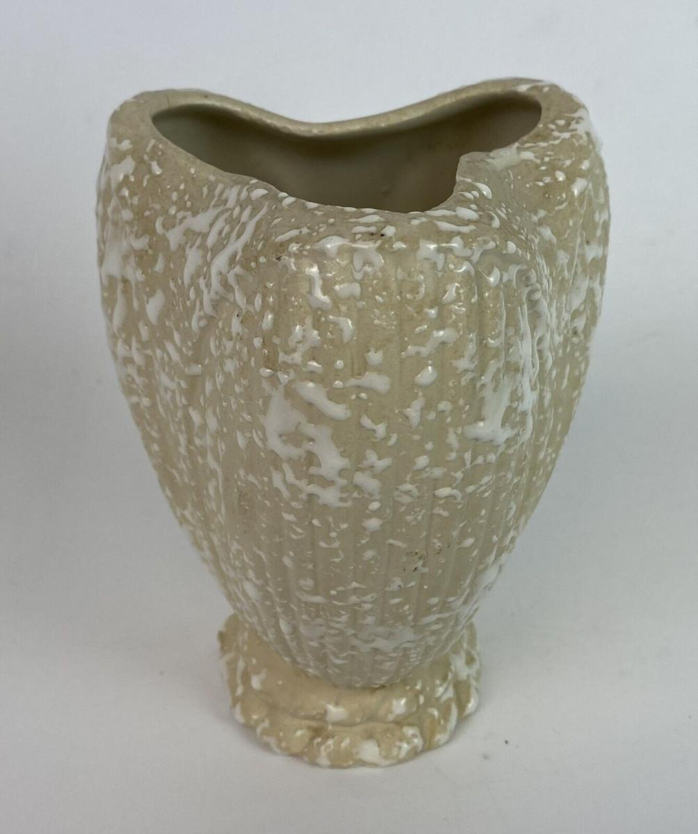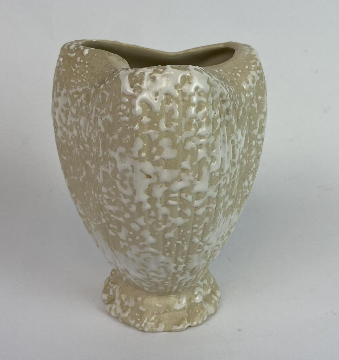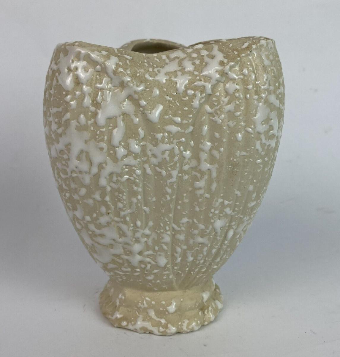 Excellent condition on this 6 inch tall vase from the Mid Century. Popcorn or spatter finish. Taupe...Ribbed. Three-sided...No chips or cracks...Possibly a piece of Savoy China?
