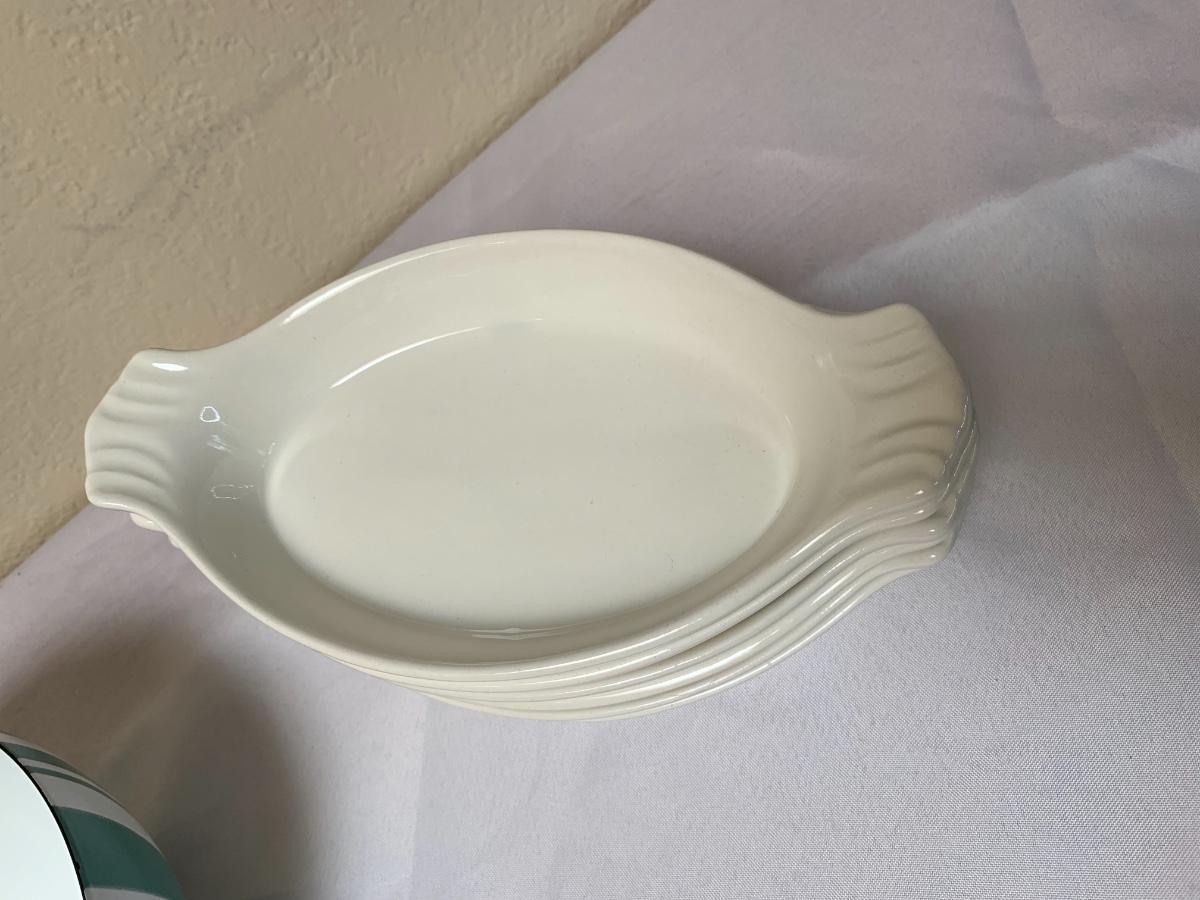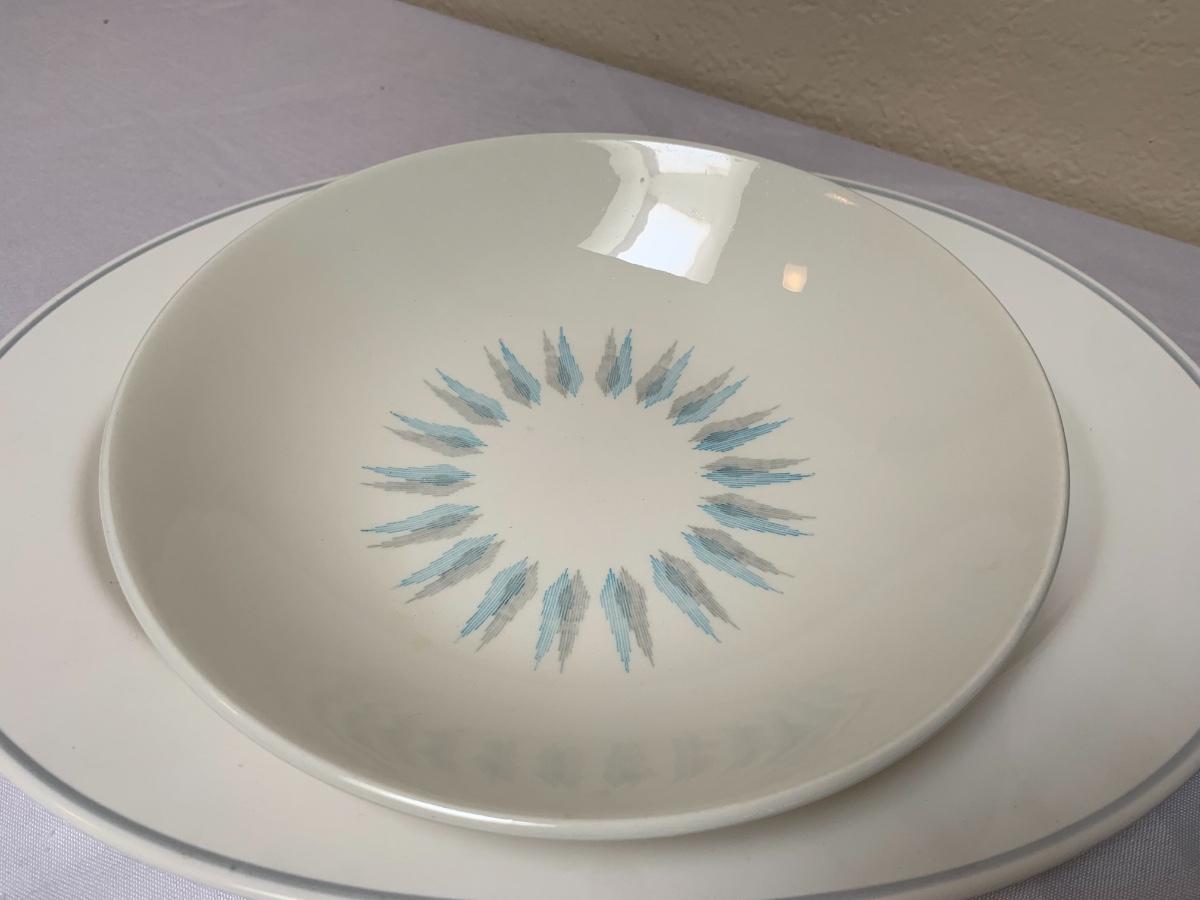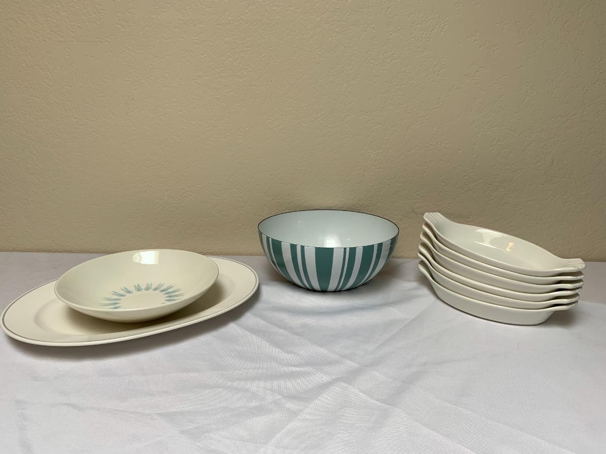 Mid Century lot includes, Catherine Holmes aqua and white enamel bowl, one pfaltzgraff serving platter, atomic serving bowl unsigned, 6 ivory colored made in the USA bakers. All in good condition