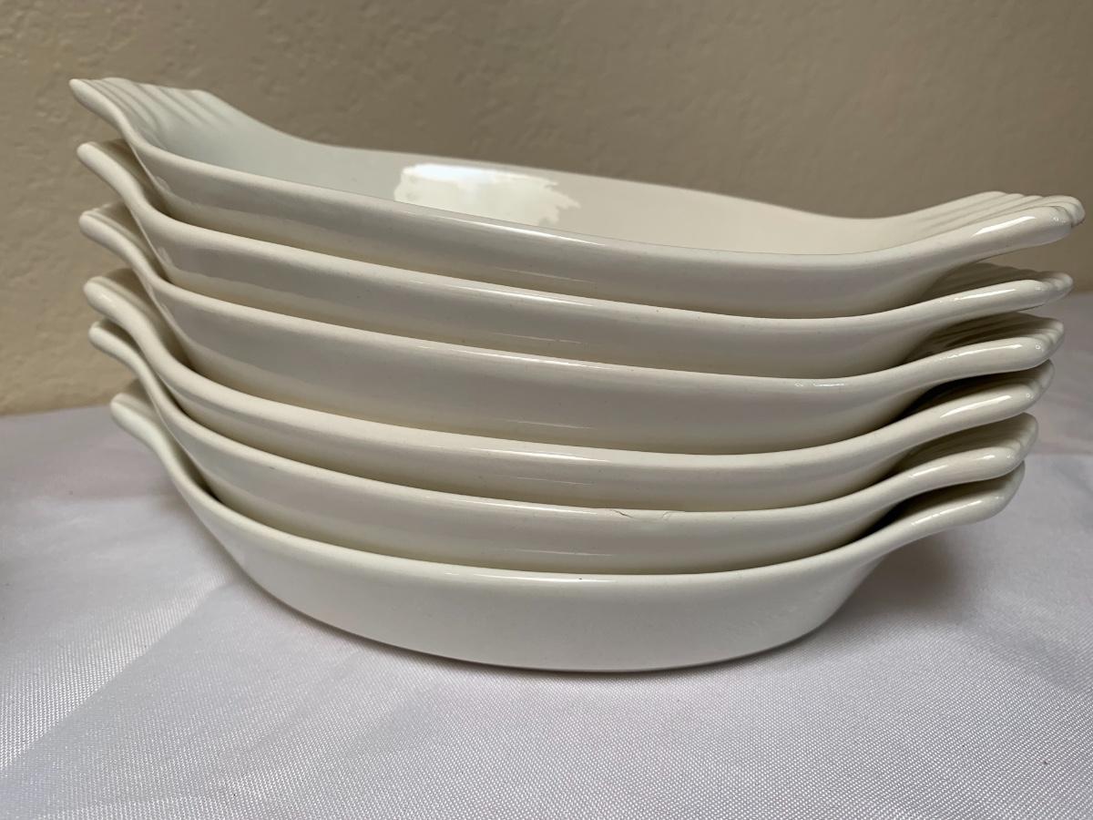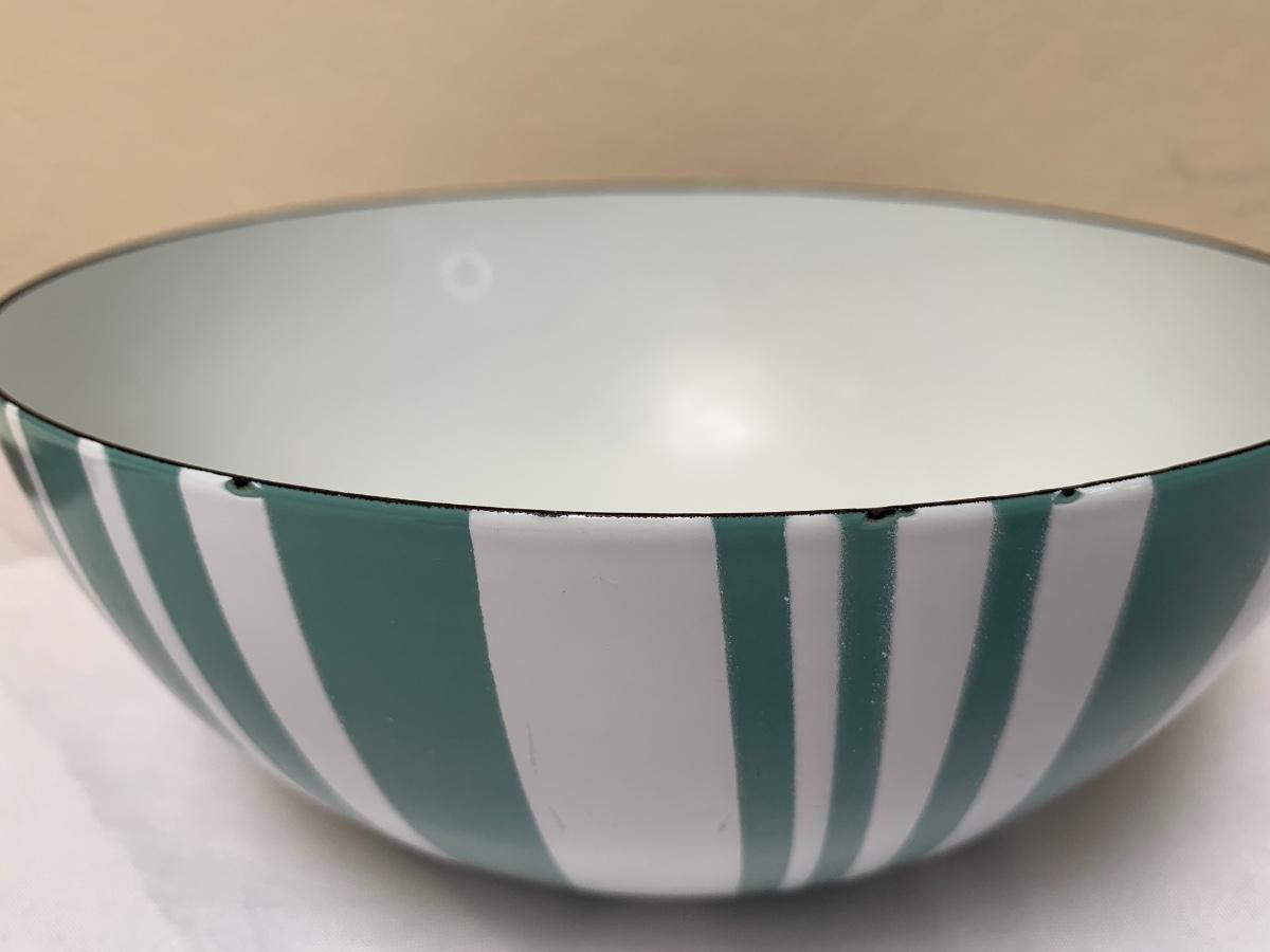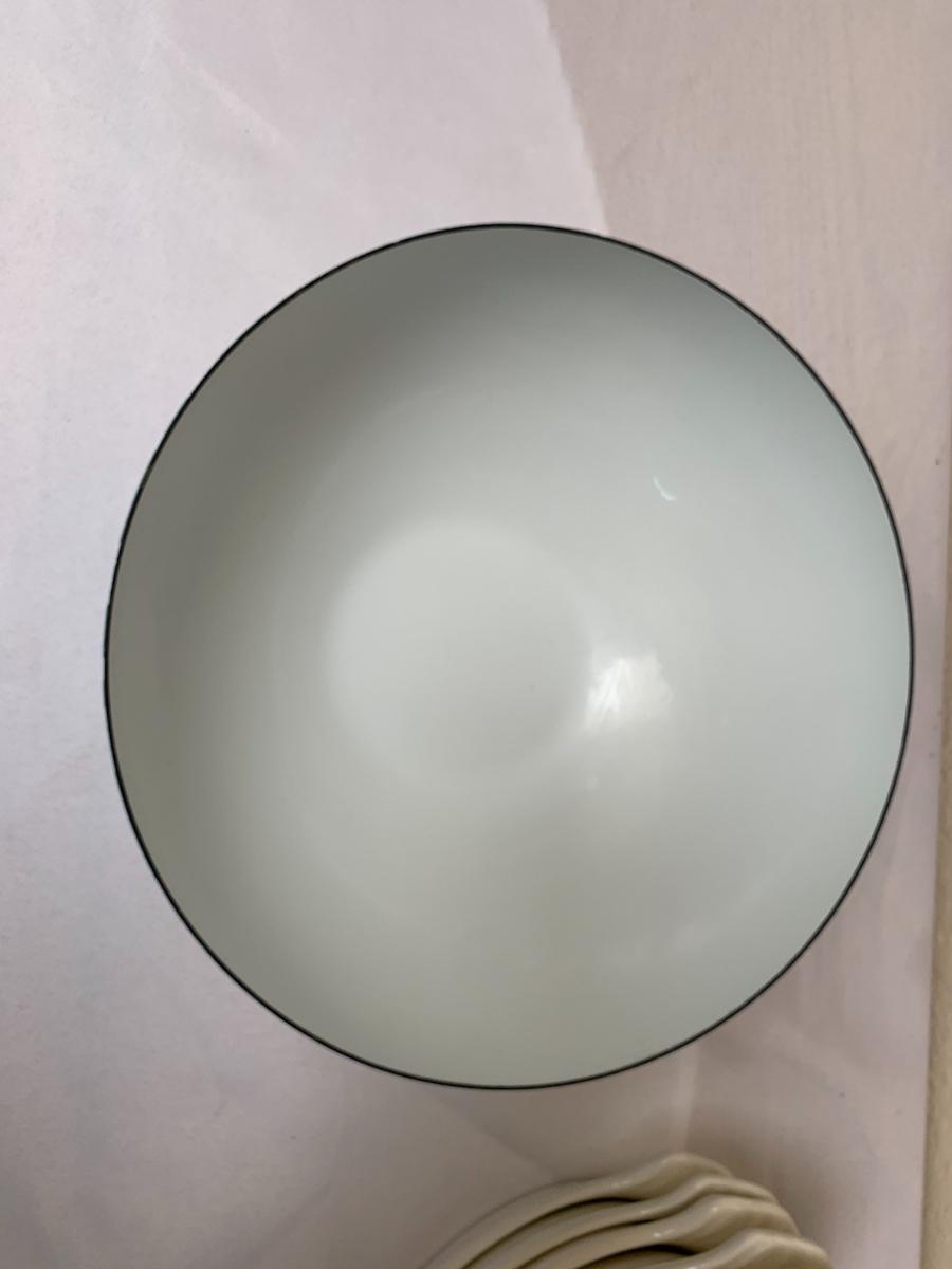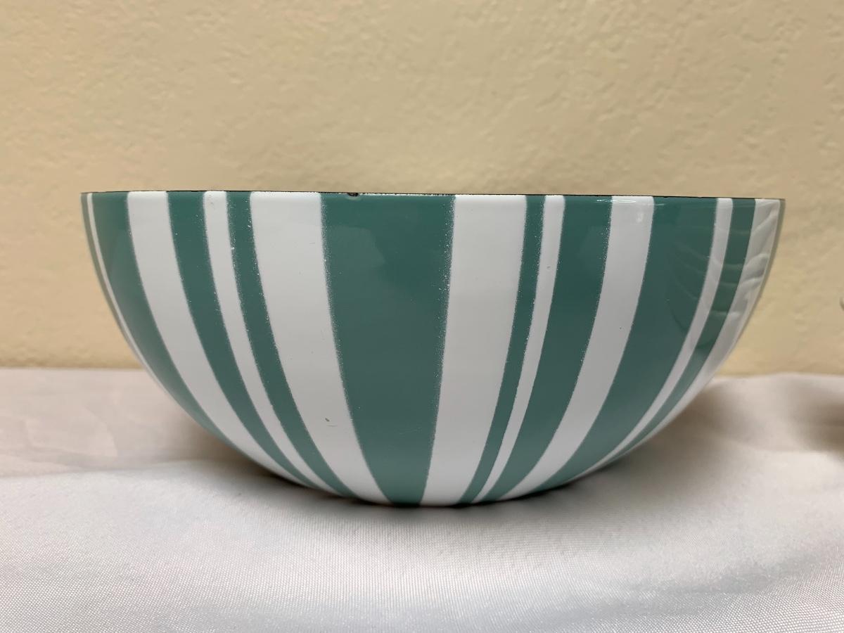 Mid Century lot includes, Catherine Holmes aqua and white enamel bowl, one pfaltzgraff serving platter, atomic serving bowl unsigned, 6 ivory colored made in the USA bakers. All in good condition