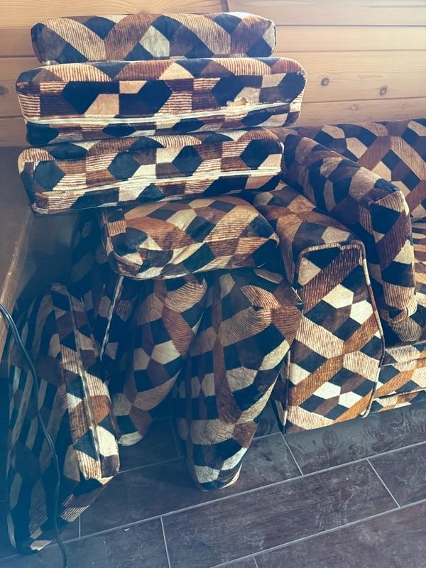 What a great mid-century vibe this sofa has! We believe there were originally 2 identical sofa's because there are double the amount of cushions needed so you can take them all (fabric) or just the best ones.