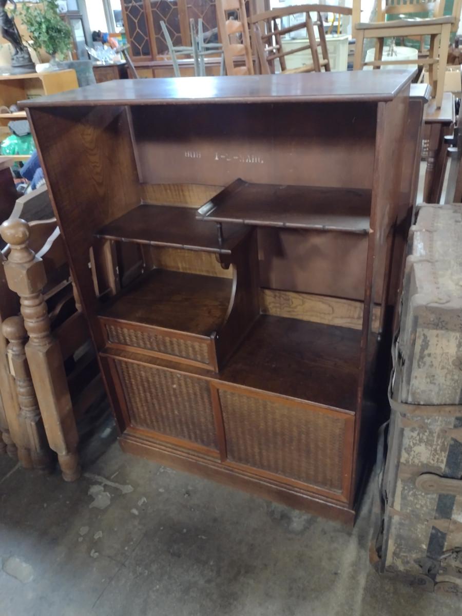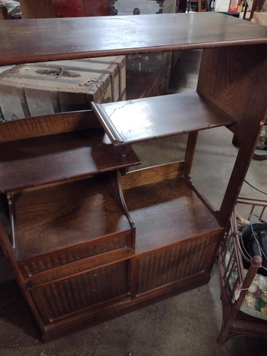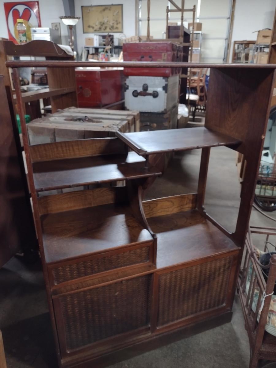 Mid Century Solid Wood Book Case Display Stand with Open Back. With sliding bottom doors and drawer. Approx 32" wide, 14" deep, 44 1/2" tall.