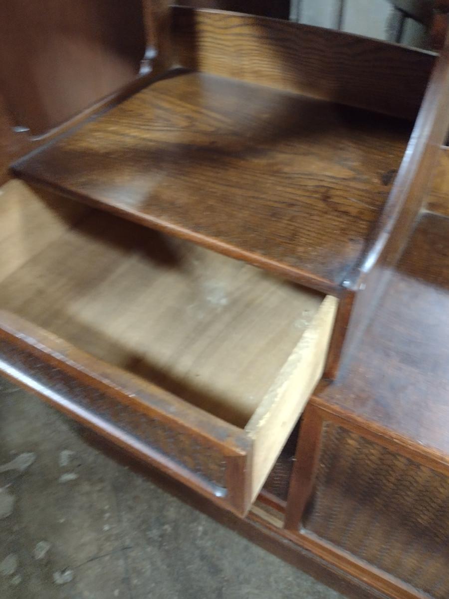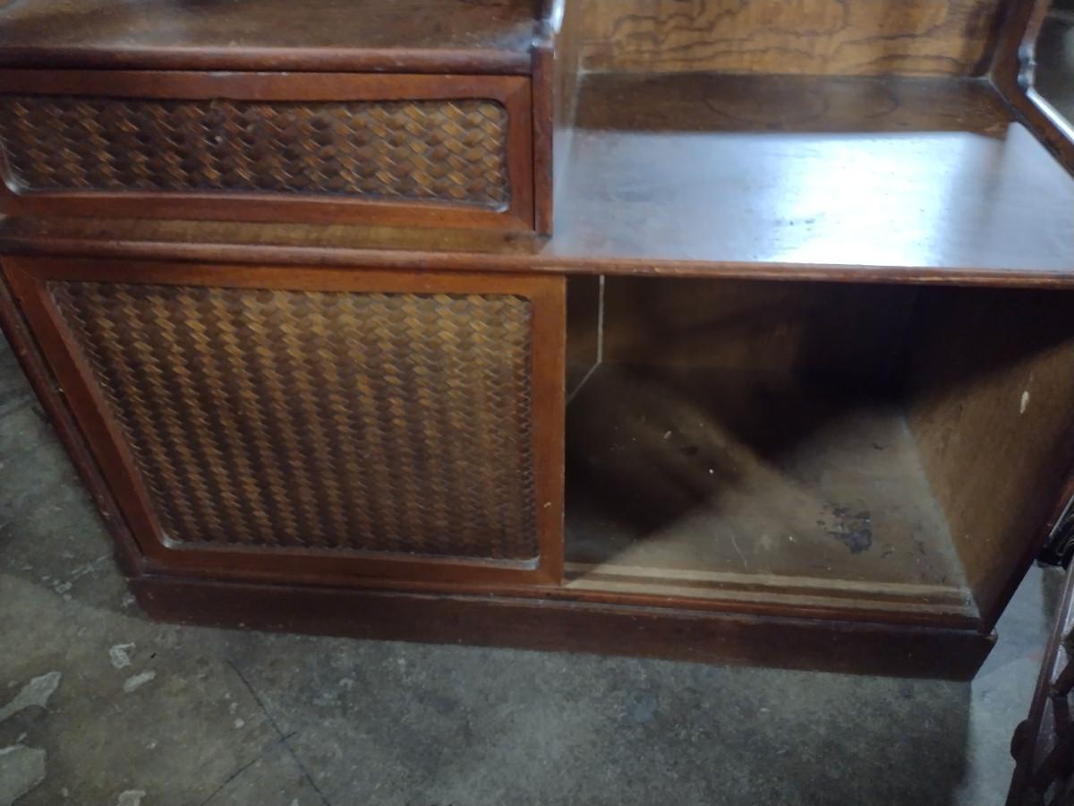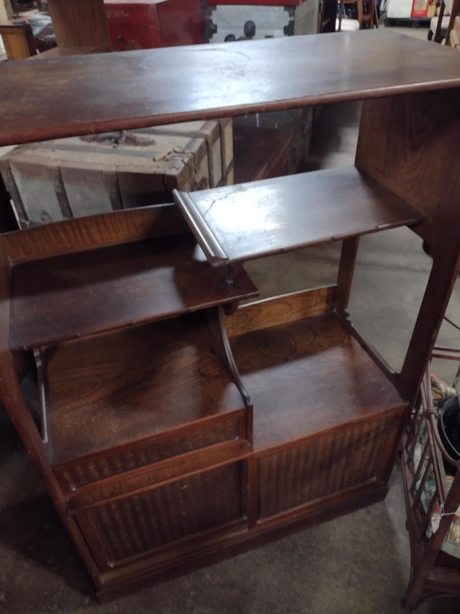 Mid Century Solid Wood Book Case Display Stand with Open Back. With sliding bottom doors and drawer. Approx 32" wide, 14" deep, 44 1/2" tall.