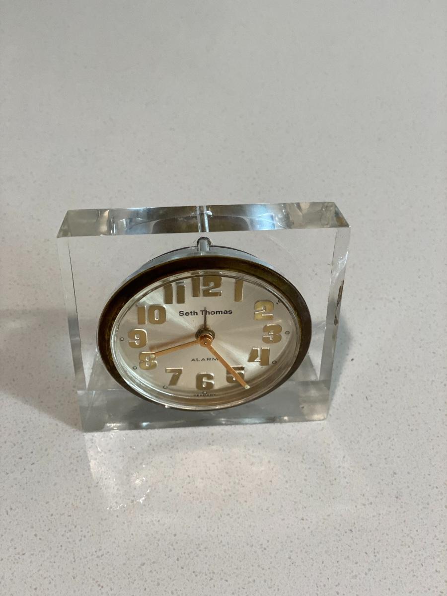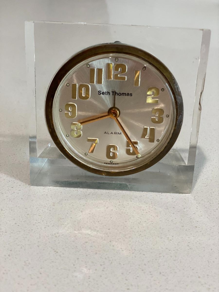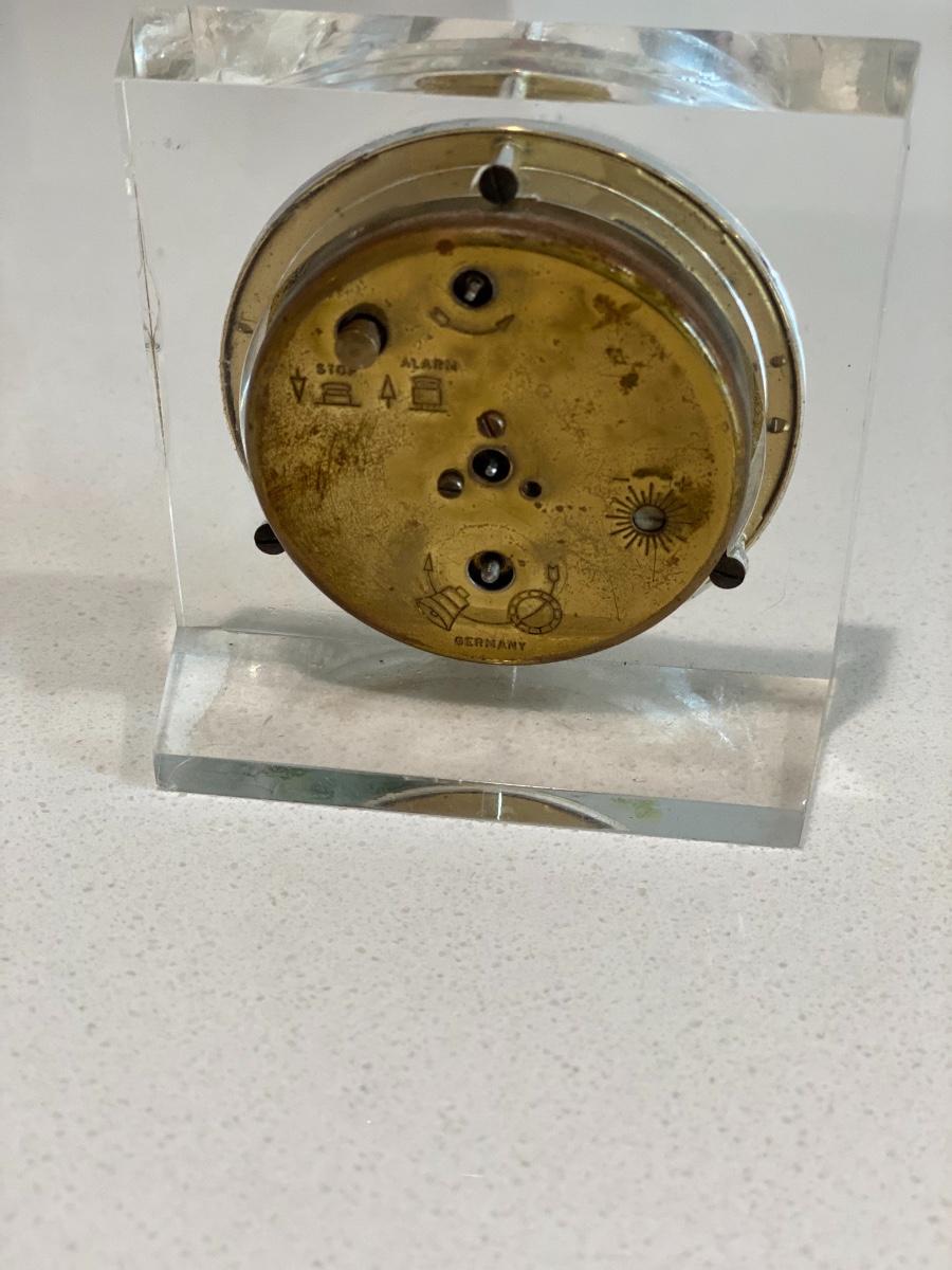 Mid Century Square Clear Lucite Acrylic Seth Thomas Desk Alarm Clock. Small wind up alarm clock made in Germany.