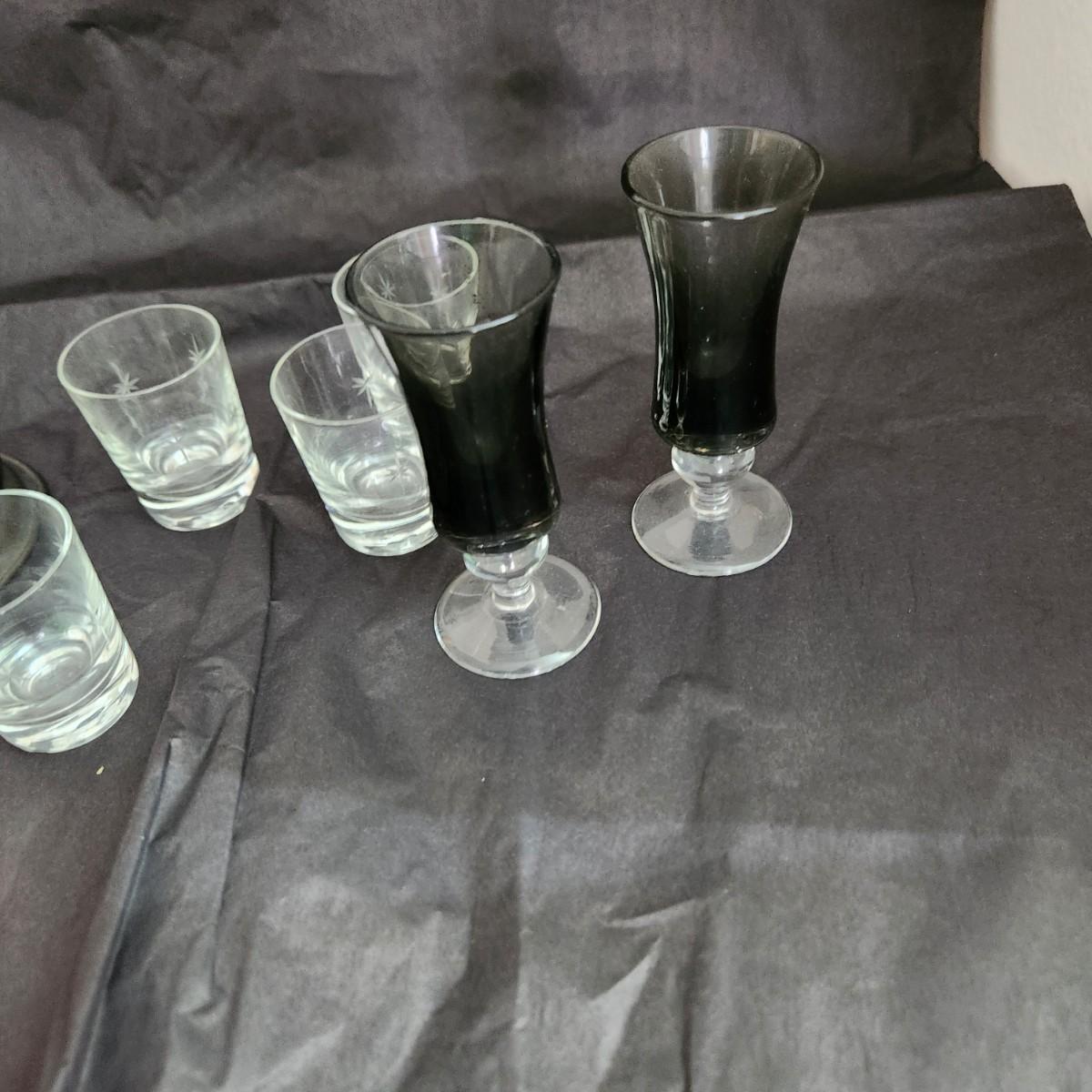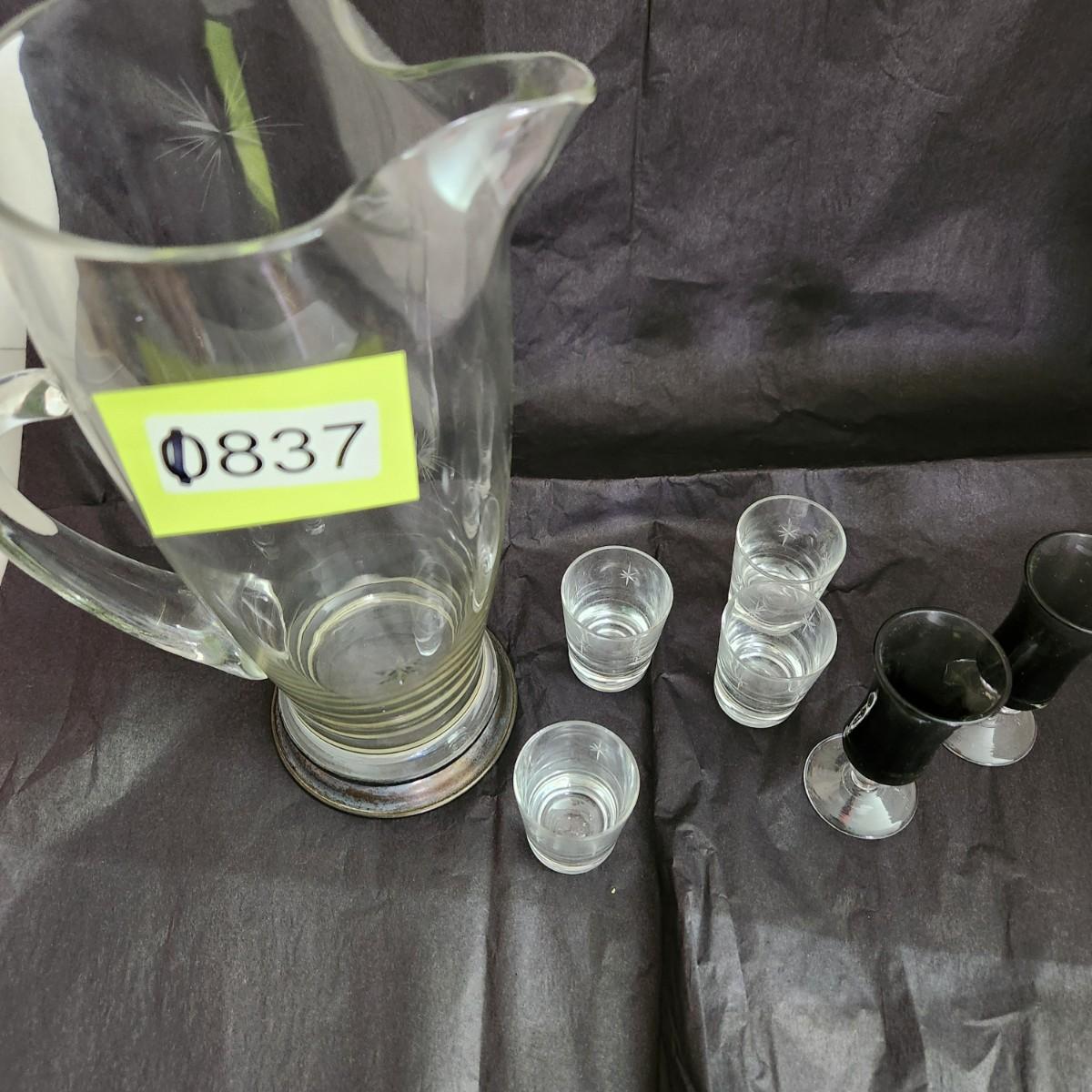 Mid Century Starburst Glass Pitcher Shot Glasses Smoked Glasses