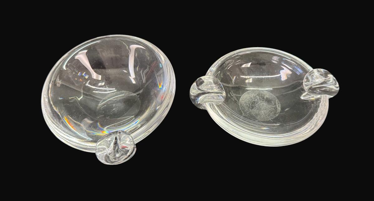 Two pieces. These are great examples of Steuben mid-century ashtrays. Each is signed. Measurement: 5"L (each). [CS]