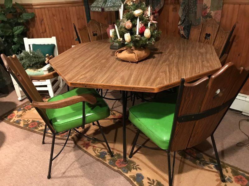 This octagon table and 4 chairs are supported by cast iron legs and frame and wood back so they are very heavy. Green vinyl upholstery may have gotten a couple small nicks while being transported. All items SOLD AS IS, AS SHOWN and subject to reserve bid. Unsold items will be relisted. Pick-Up only on Monday May 20th between 3-6 PM