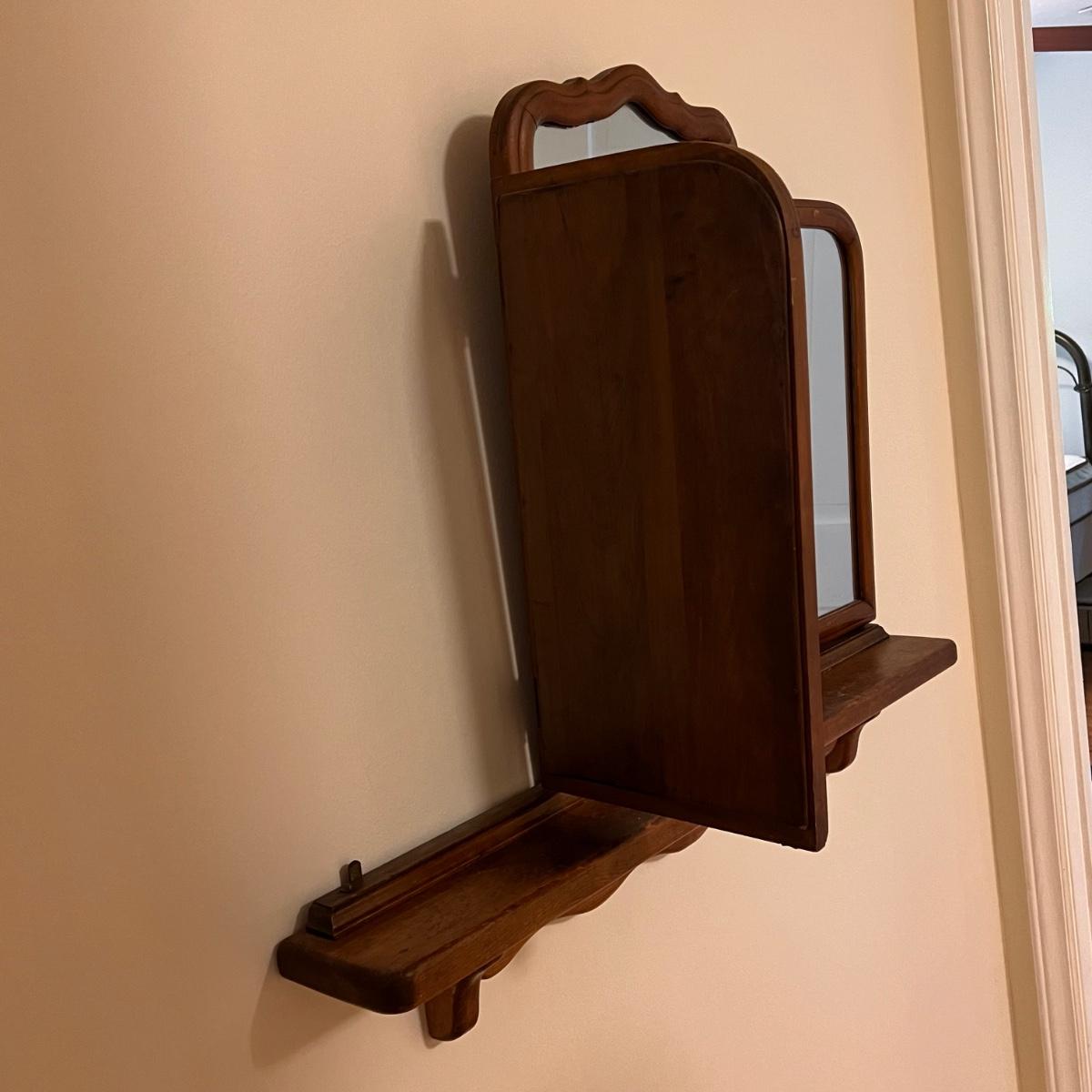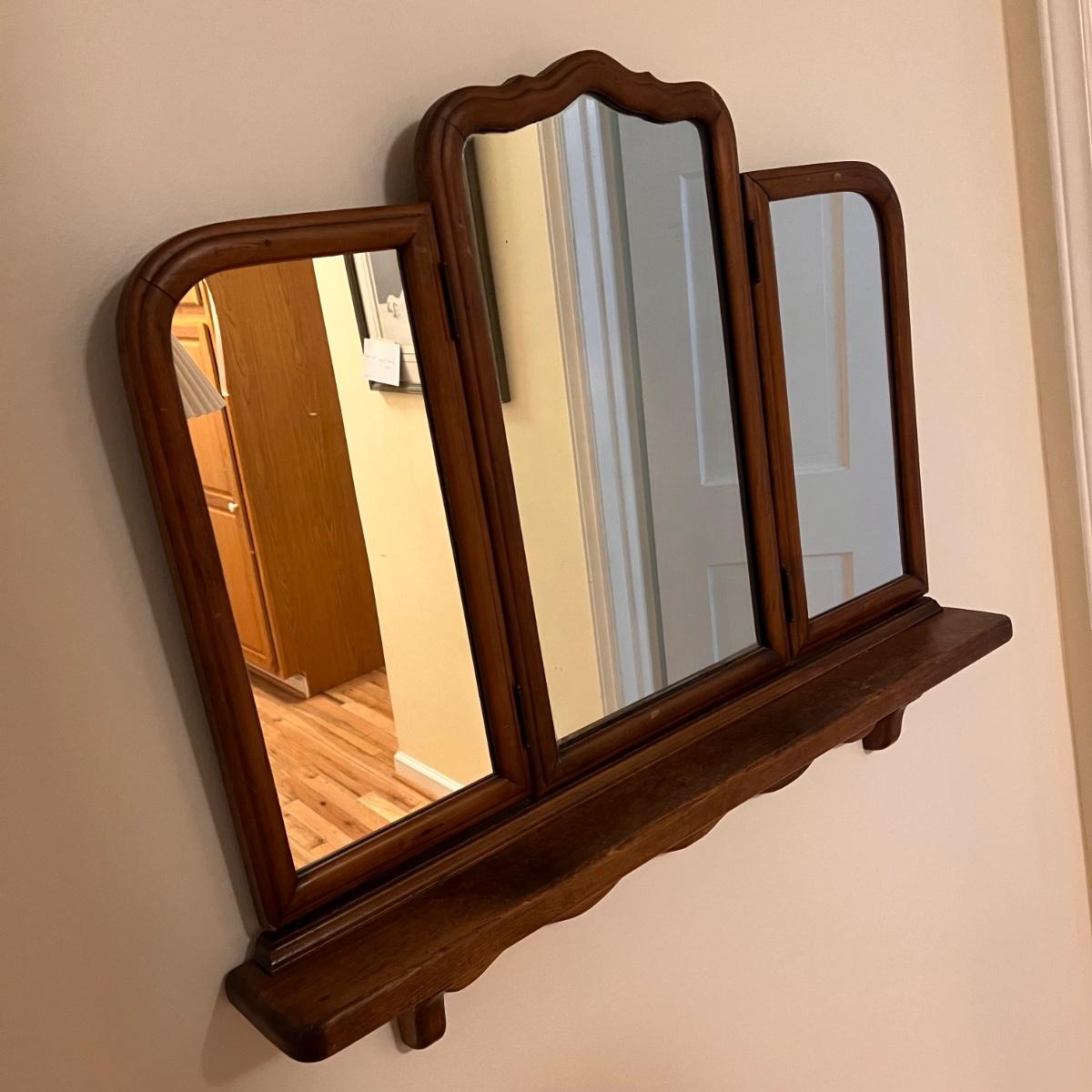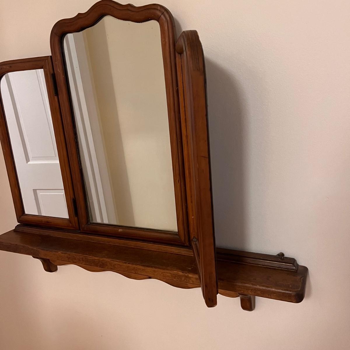 This lot included one mid century trifold mirror with a shelf. The mirror extends on both sides - see pictures included. The left mirror was replaced recently according to previous owners. When the mirror is fully opened, it measures 36” x 27”H. Winning bidder must remove the mirror from the wall and that will require a Phillips head screwdriver. Shipping available.