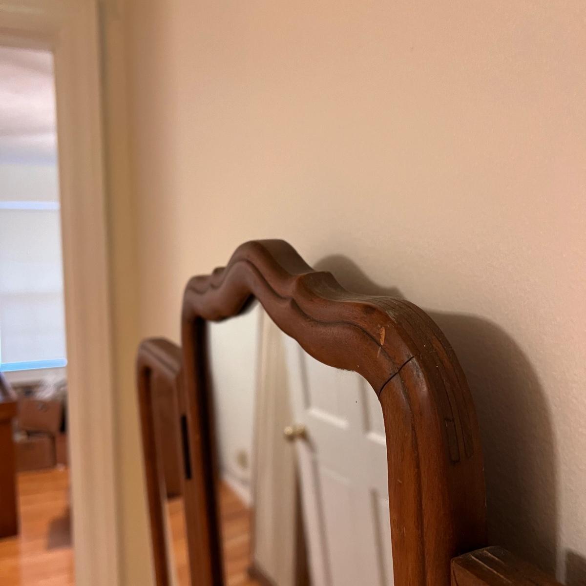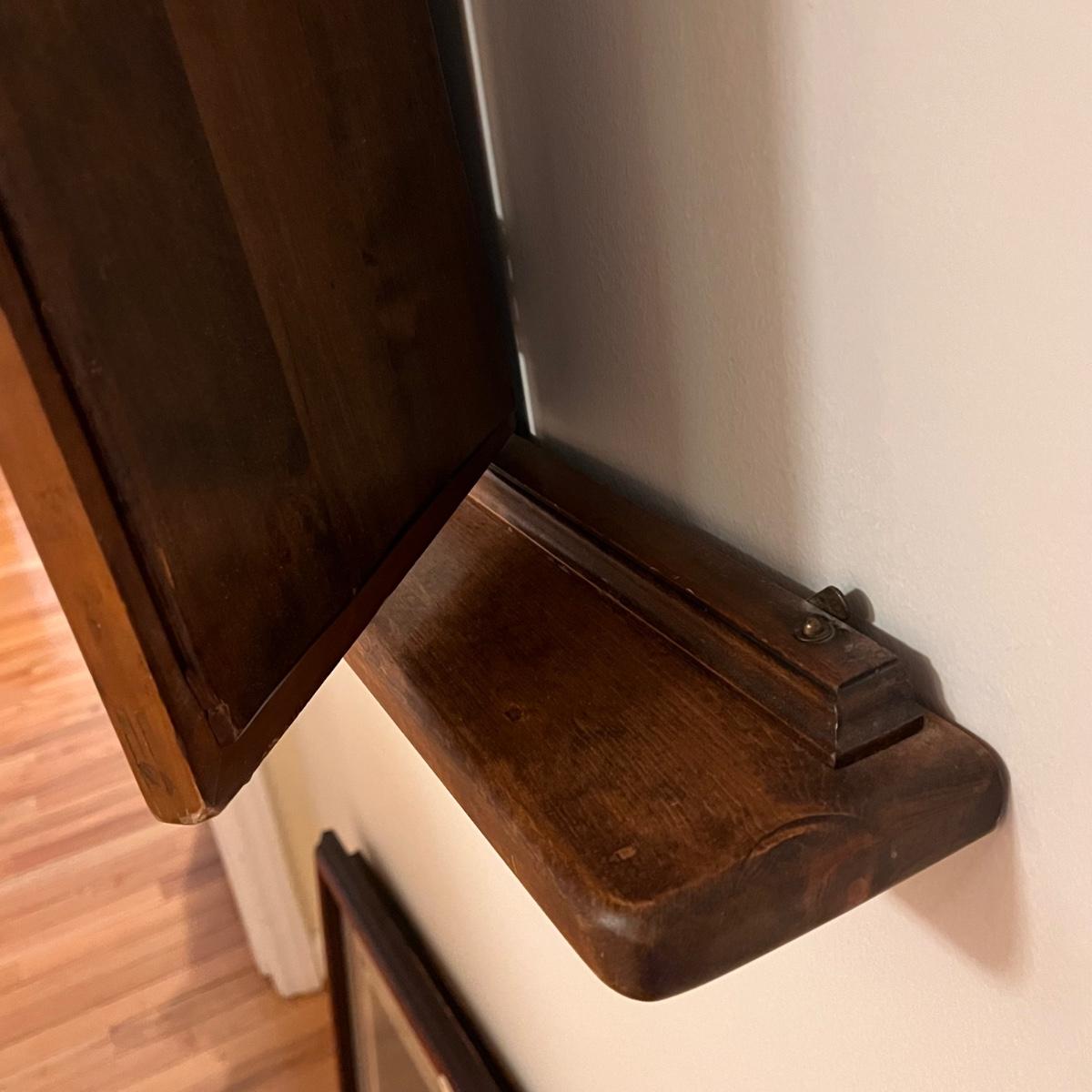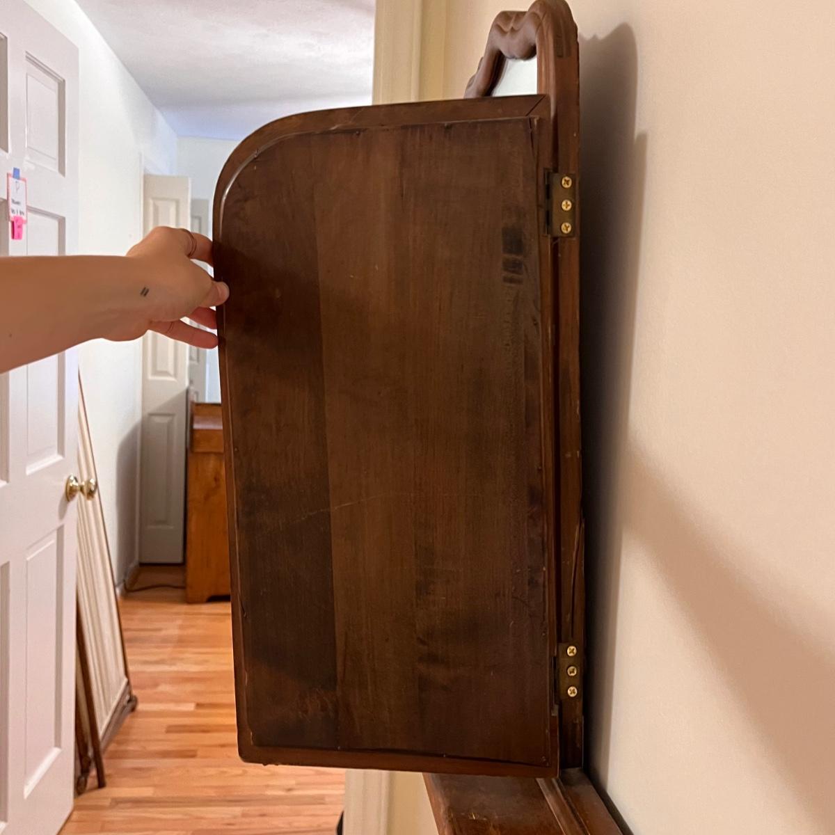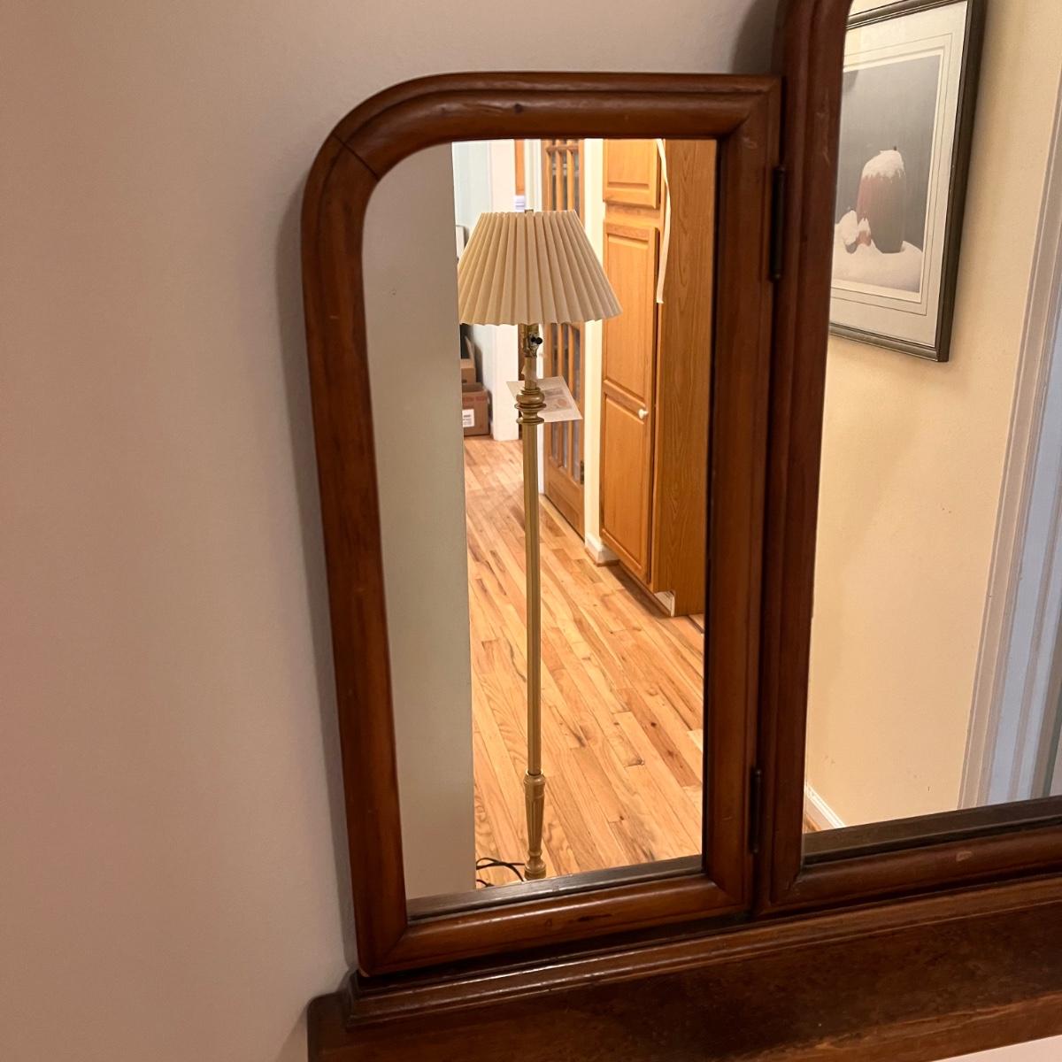 This lot included one mid century trifold mirror with a shelf. The mirror extends on both sides - see pictures included. The left mirror was replaced recently according to previous owners. When the mirror is fully opened, it measures 36” x 27”H. Winning bidder must remove the mirror from the wall and that will require a Phillips head screwdriver. Shipping available.