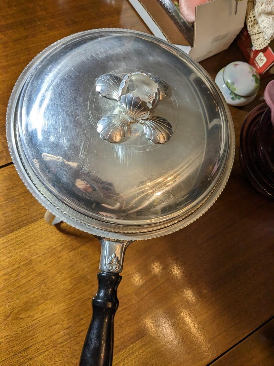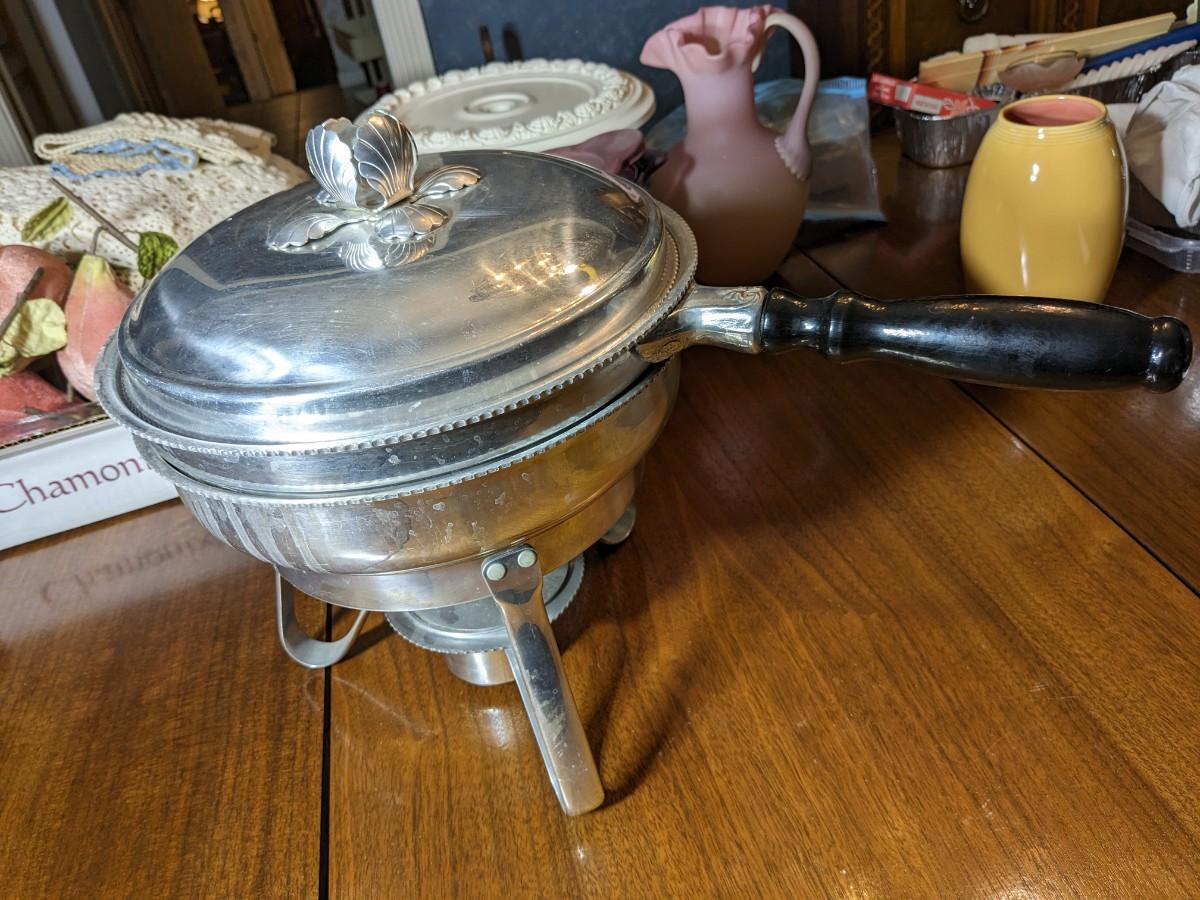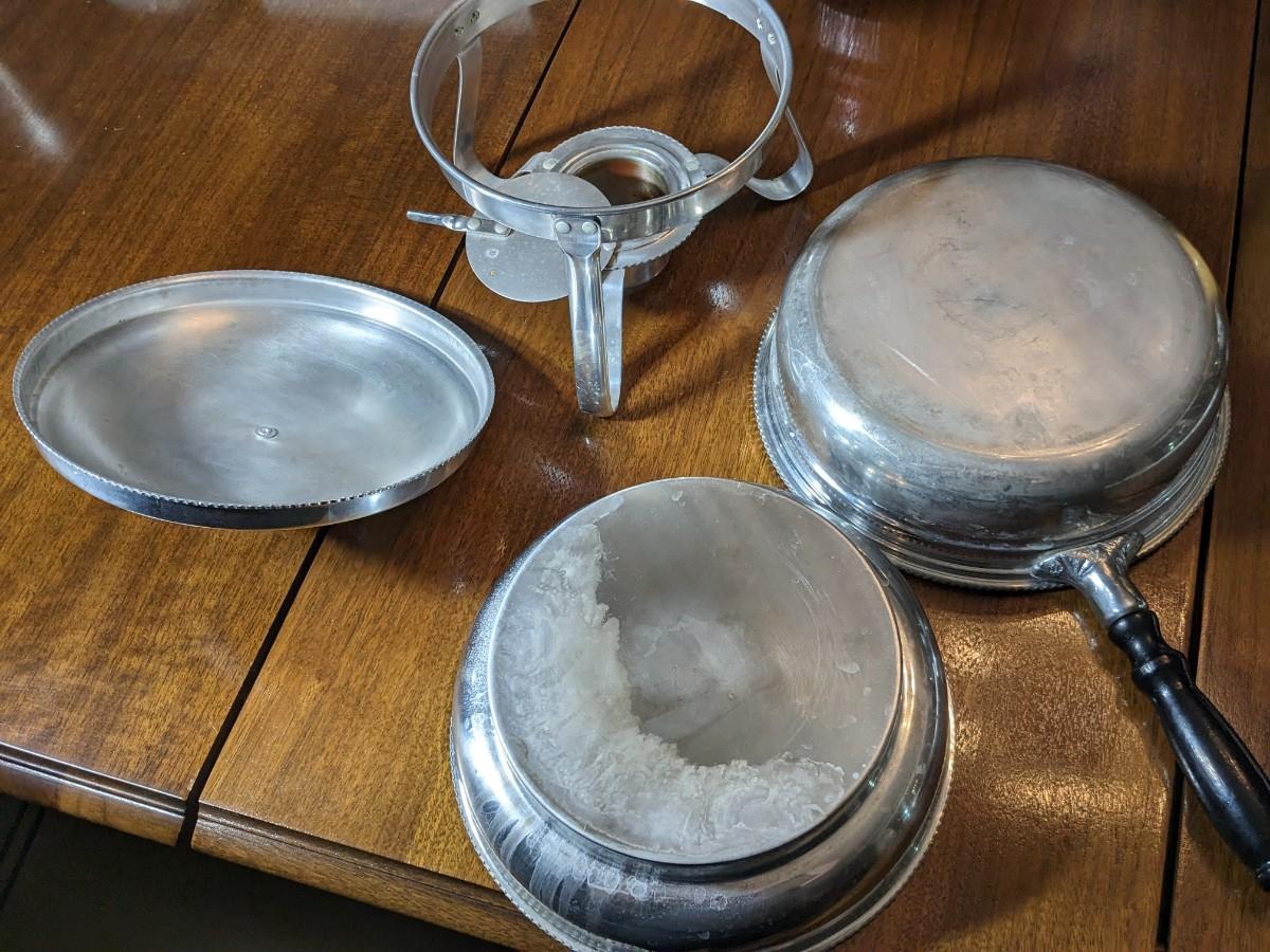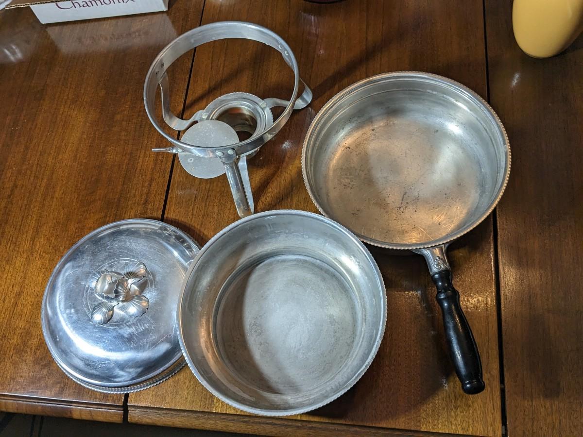 MID CENTURY VINTAGE 12" ROUND ALUMINUM CHAFING DISH & STAND STERNO