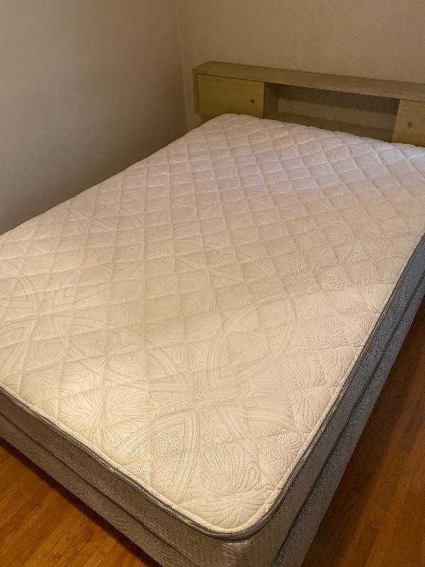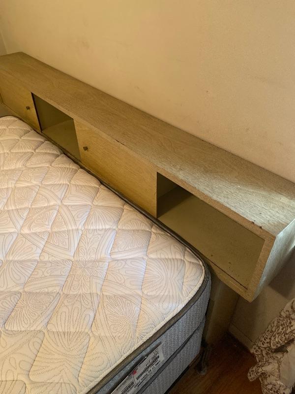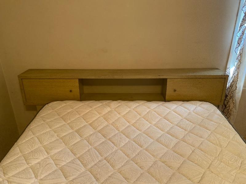 Full size vintage headboard with newer bed. Headboard has sliding doors on each end. Signs of wear on surface and edges. Mattress is in good condition no spots or stains. Headboard measures 64”x7.5” and 34” tall.