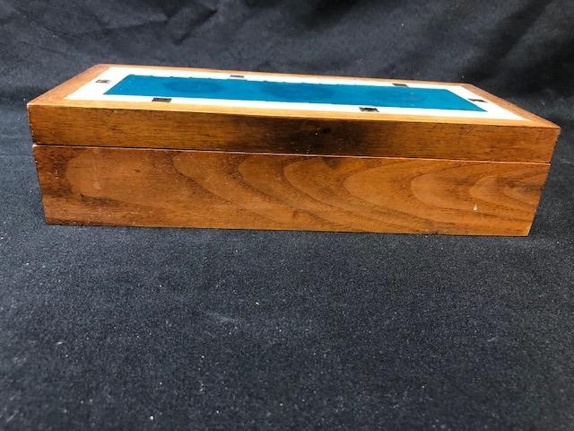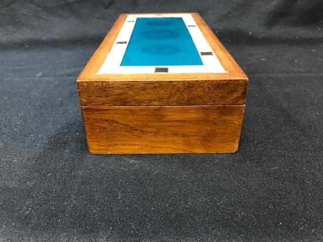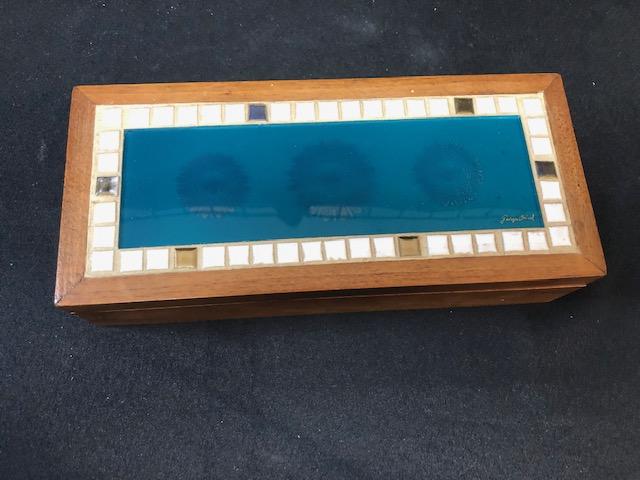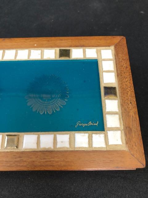 Wood Trinket Box by Mid Century artist Georges Briard. Mosaic tile and glass inlaid design. Great condition. Faded gold Regalia pattern on blue glass center.
