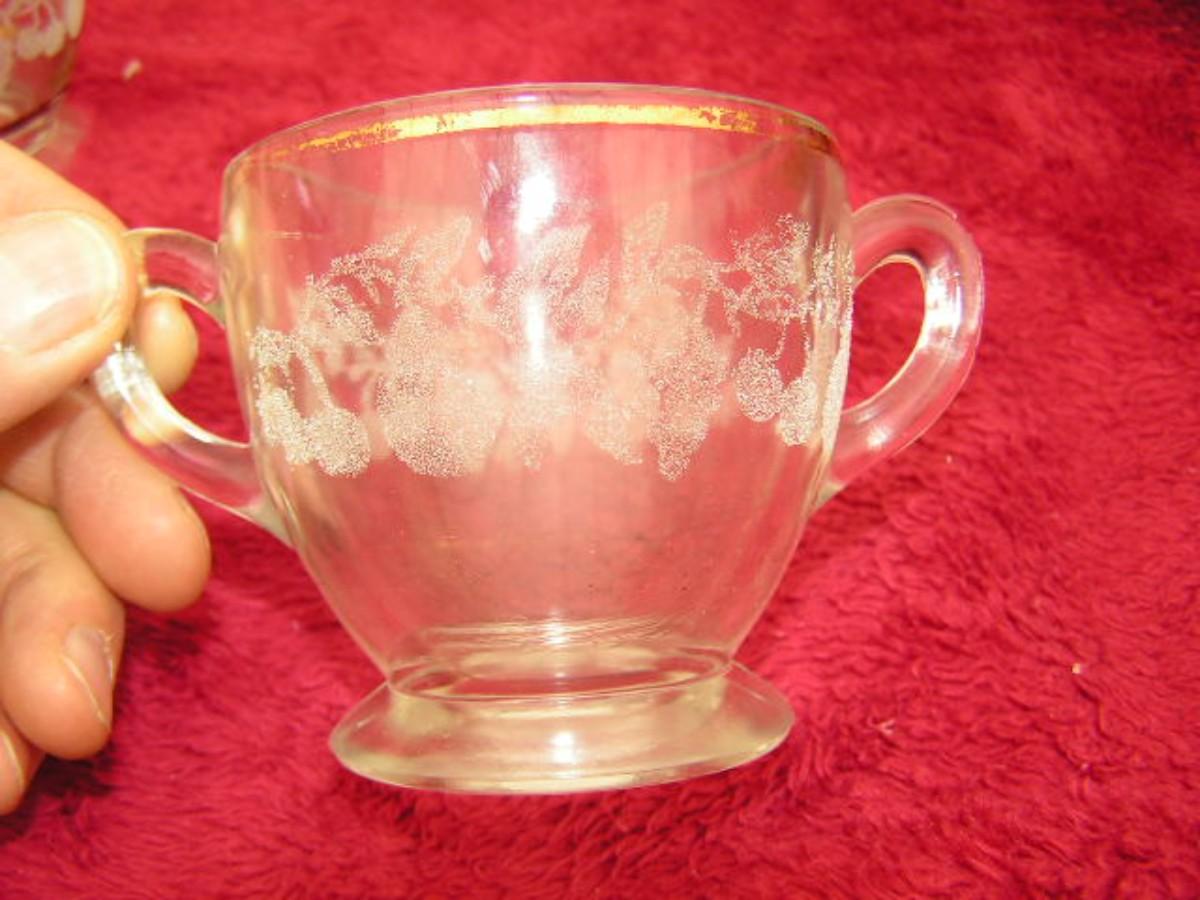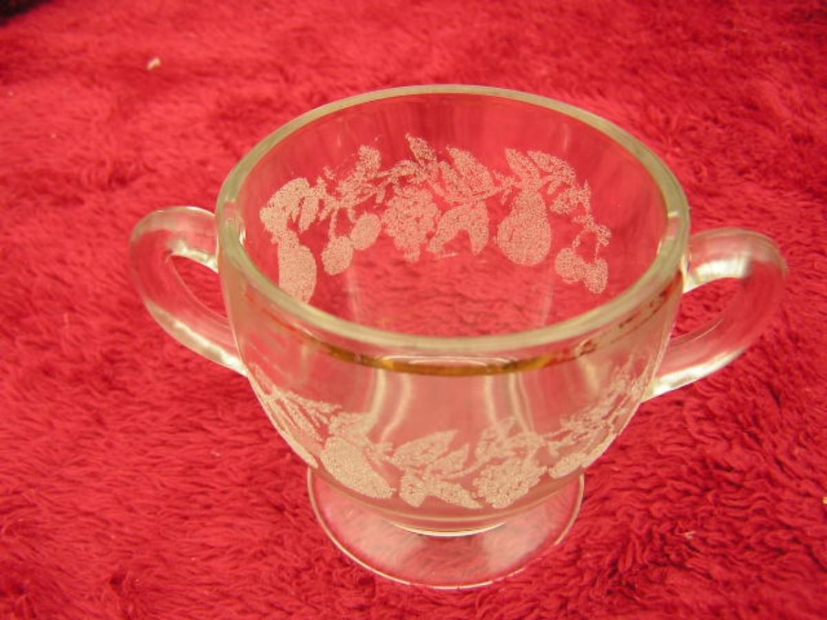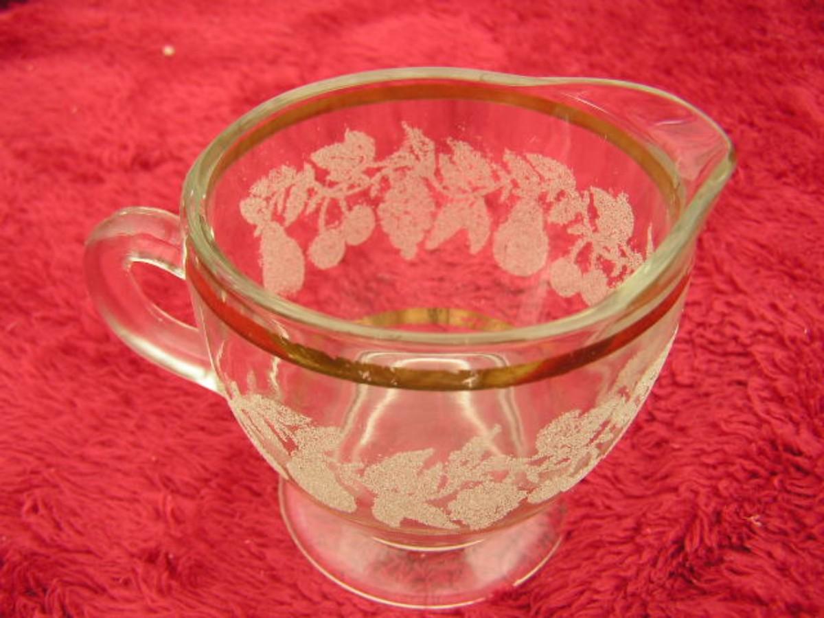 (2of2) Mid-Centruy Bartlett-Collins creamer & sugar bowl. C. 1940s-50s. Etched glass w/gold trim. Fair condition, gold trim deteriorated.