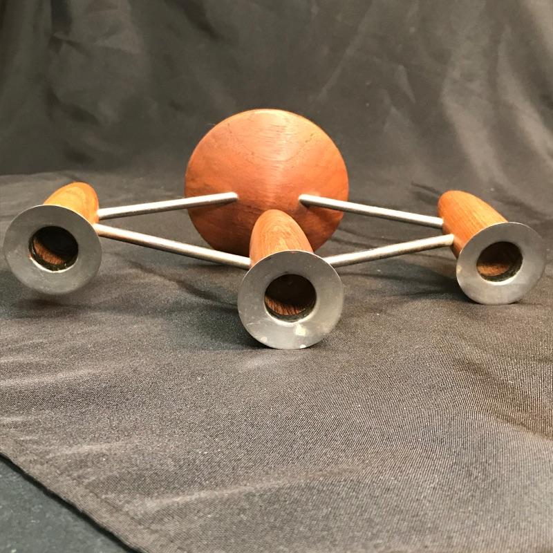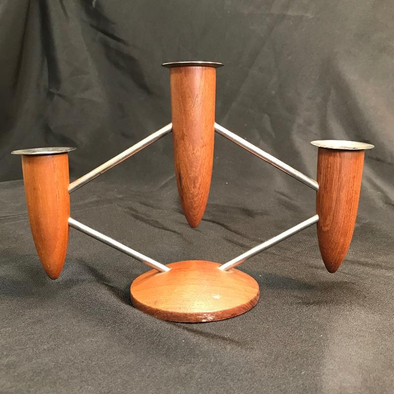 Teak and chrome Mid-Century Modern MCM 3-Slot Candle Holder