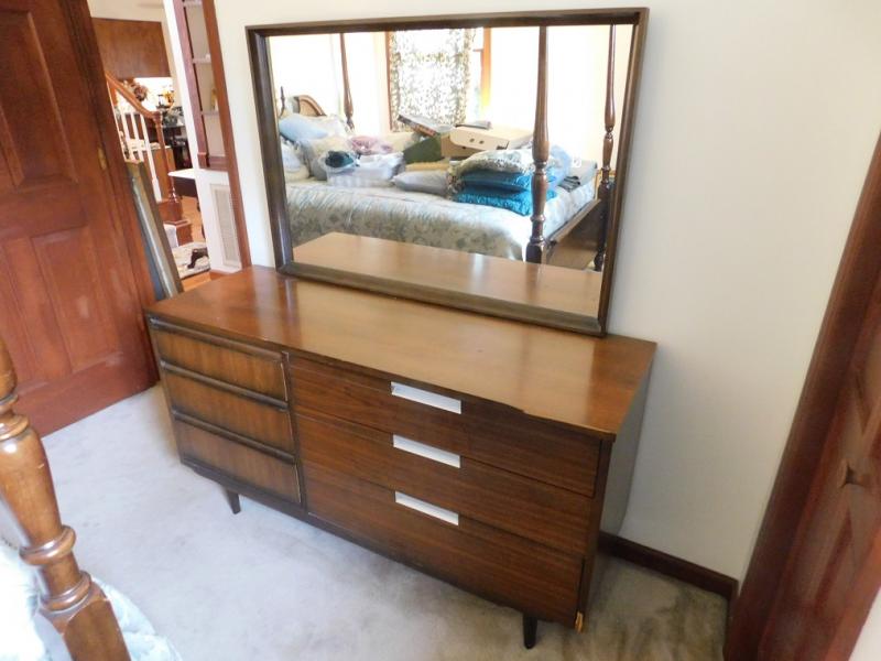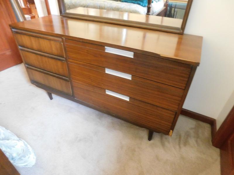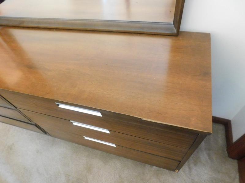 Mid-Century 6 Drawer Dresser with Mirror has some delamination to the surface at one or two place. but has appealing look.