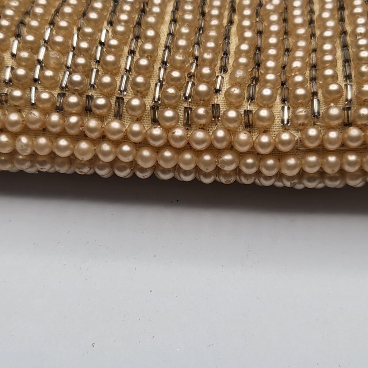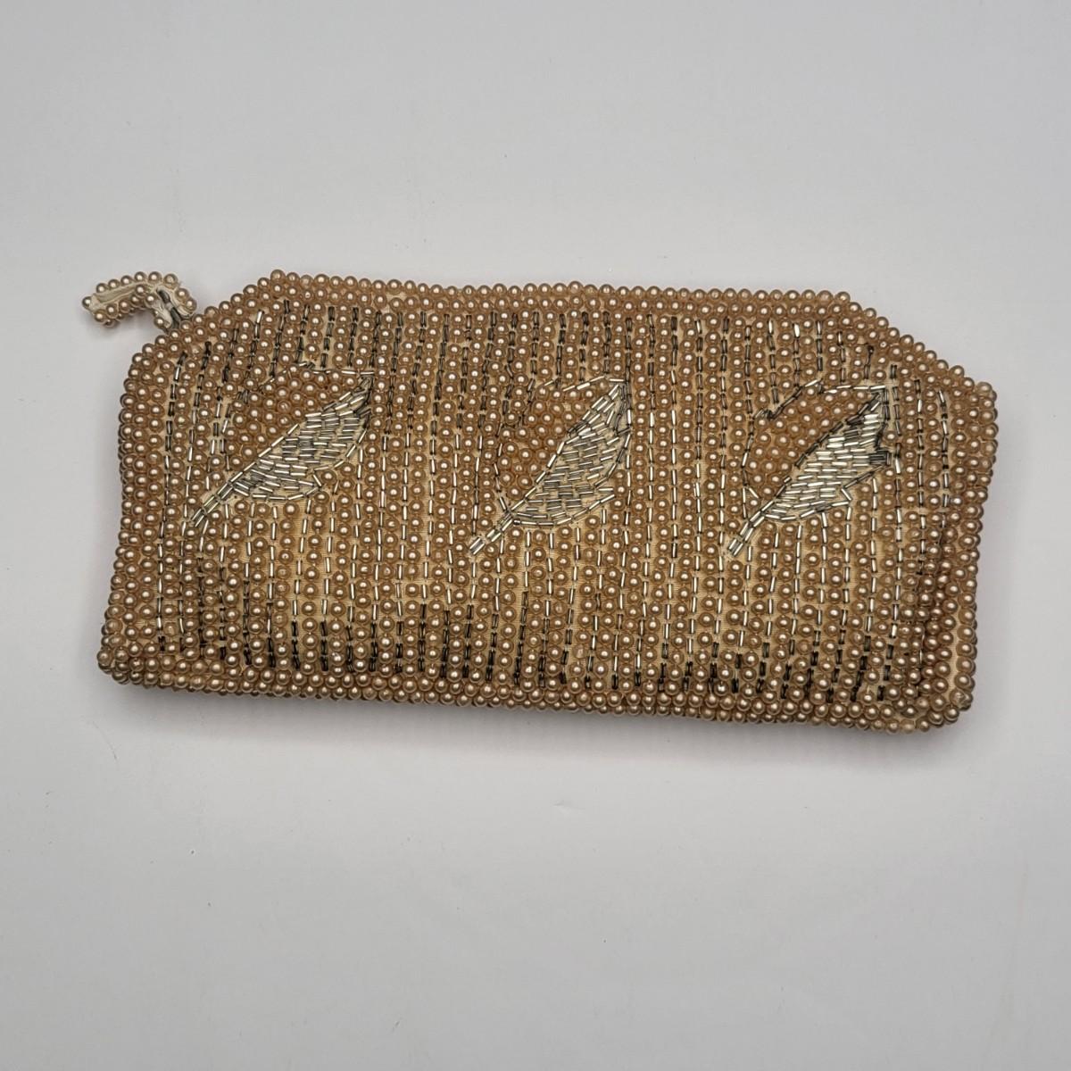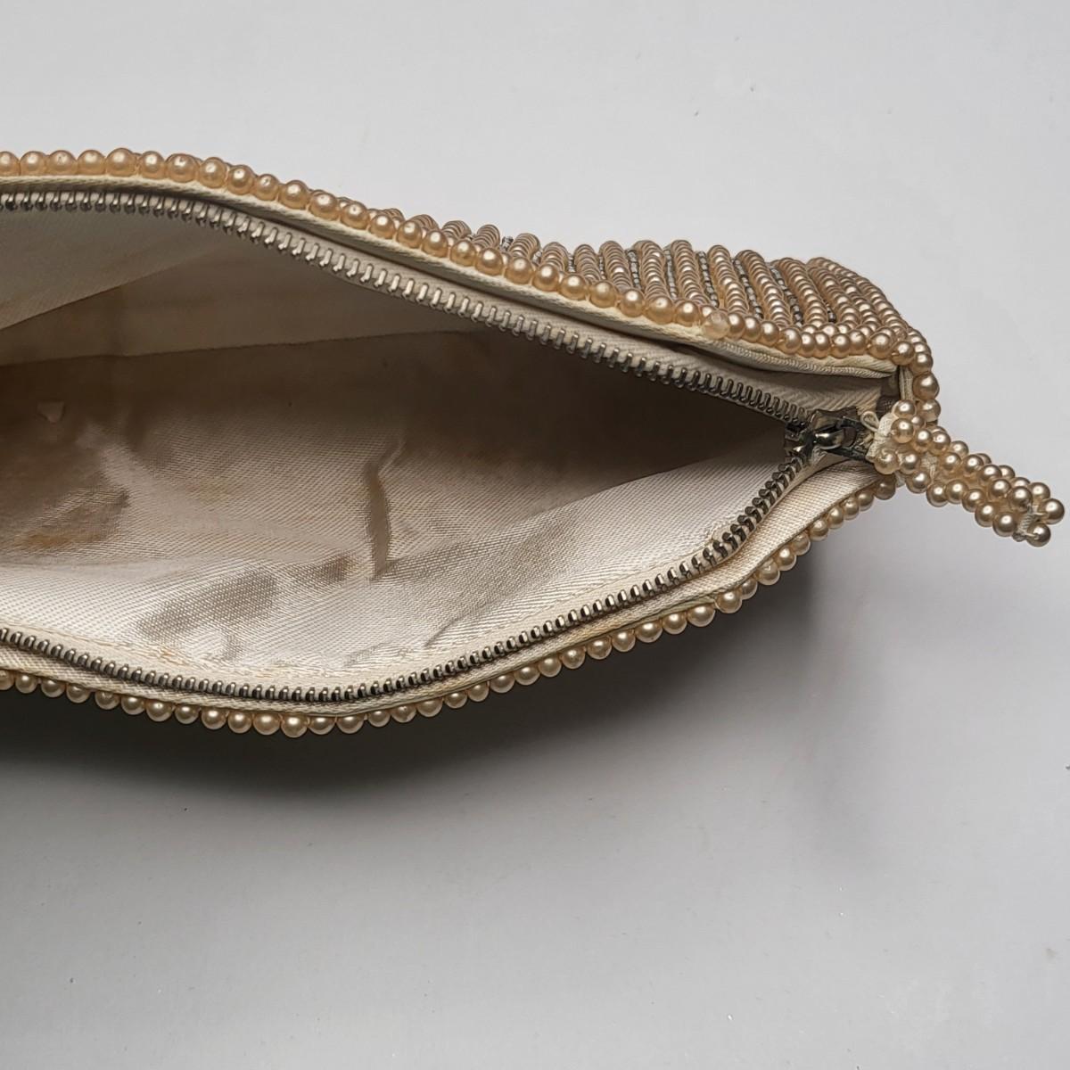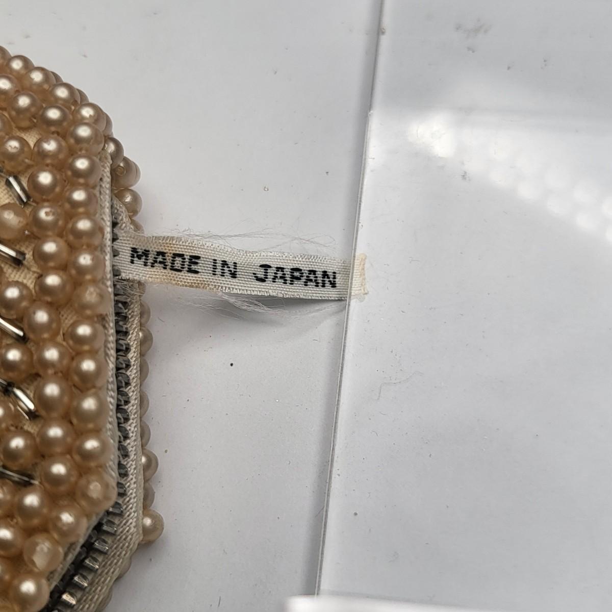 Faux pearl and silver colored glass beaded zipper top bag. Made in Japan. Measures 7.5" L x 4" T