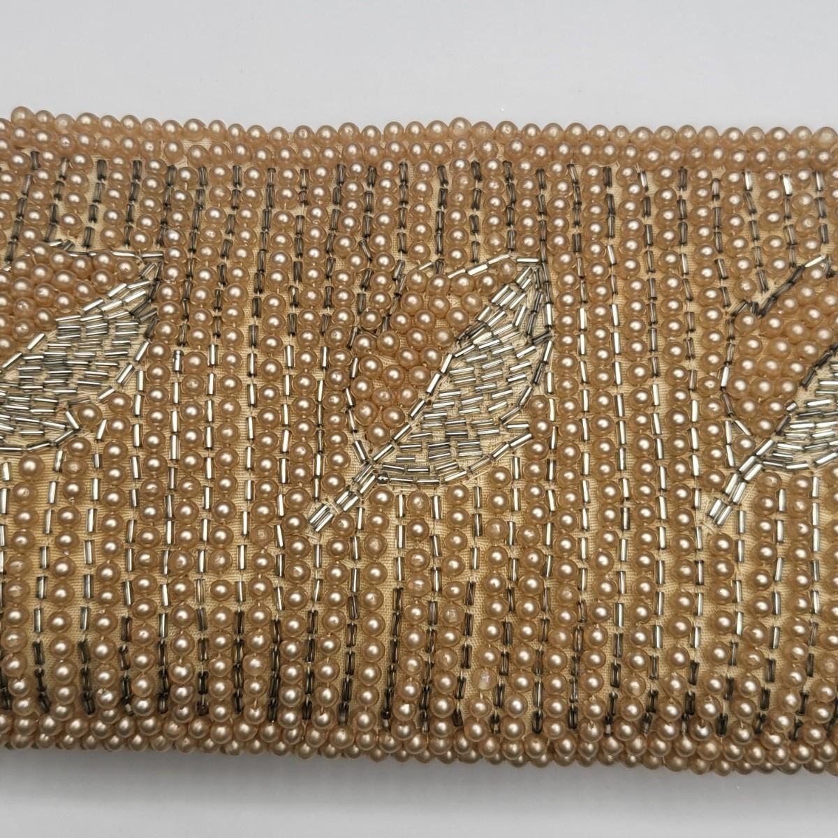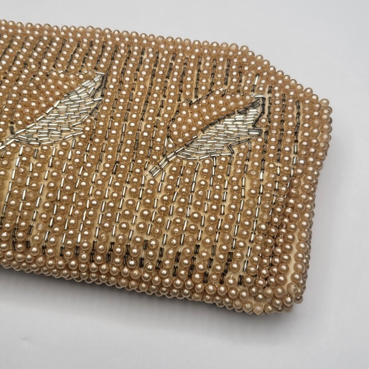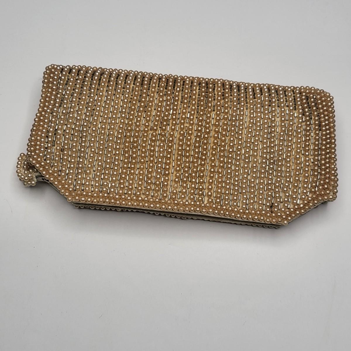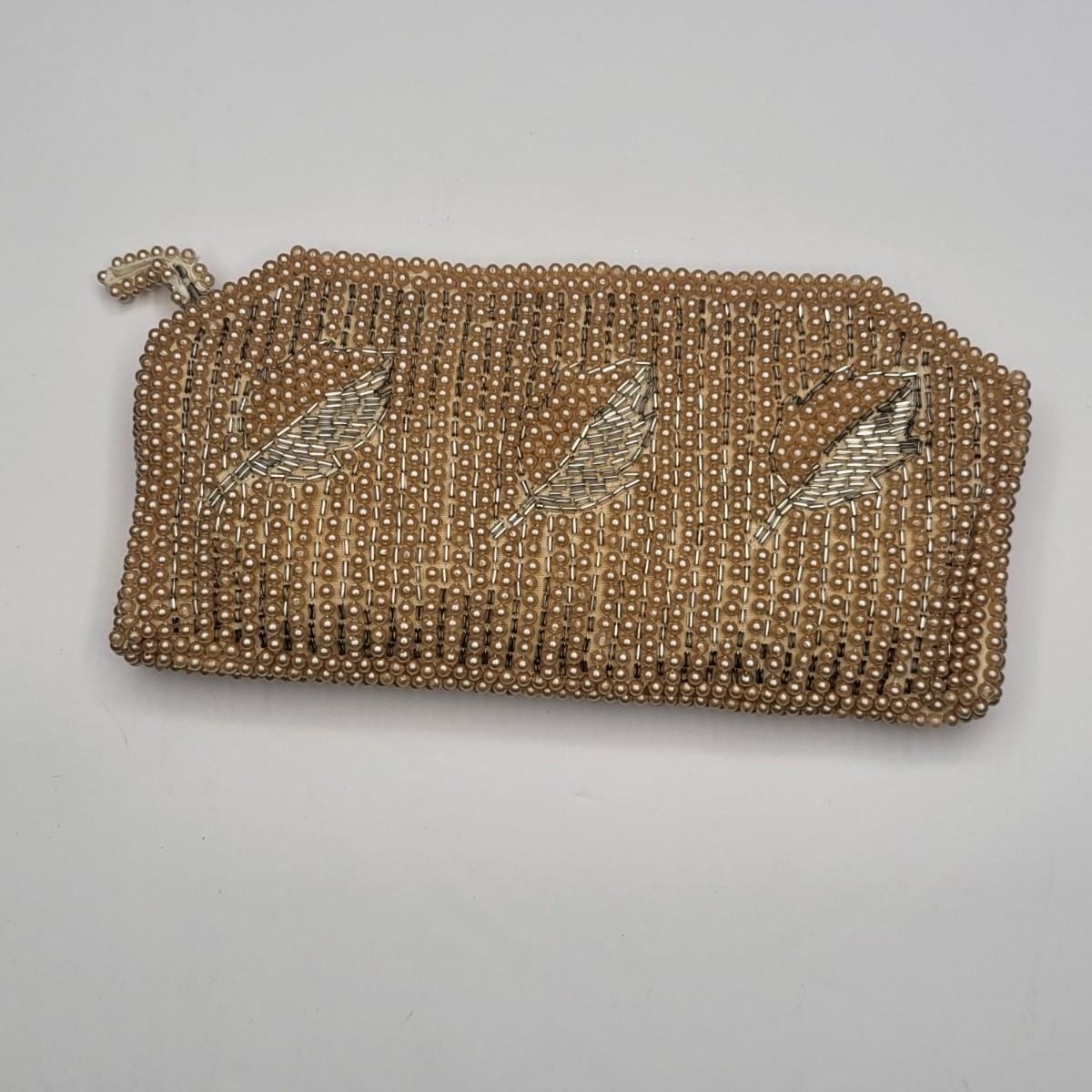 Faux pearl and silver colored glass beaded zipper top bag. Made in Japan. Measures 7.5" L x 4" T