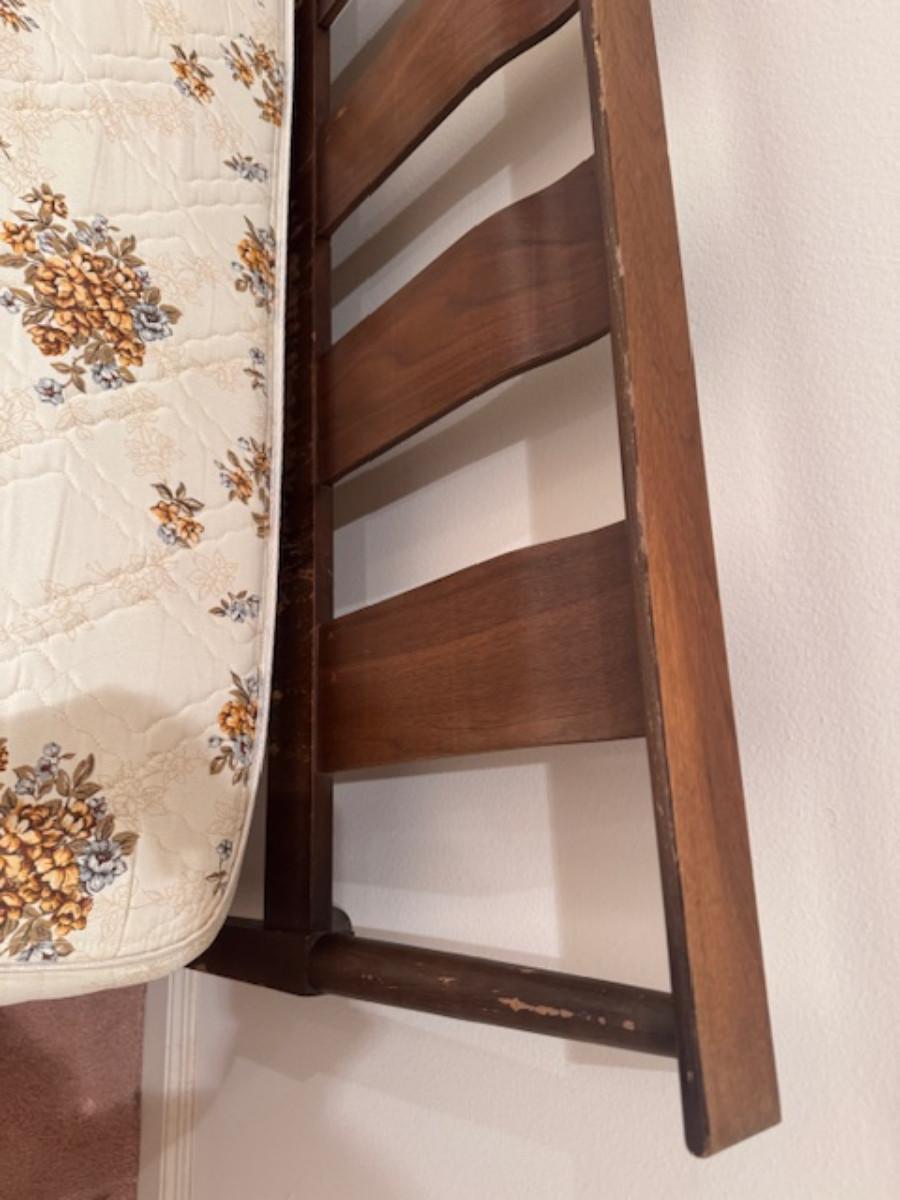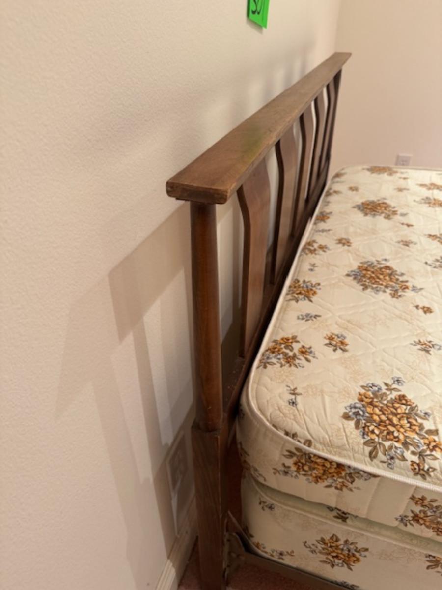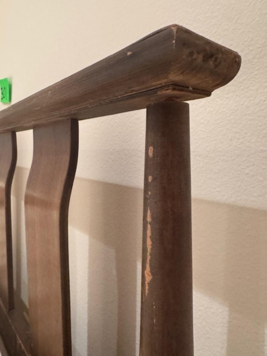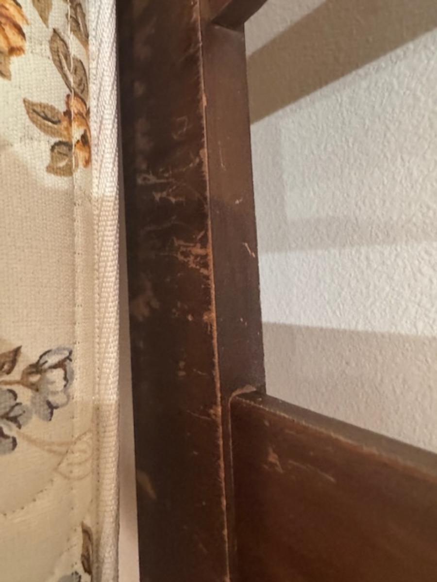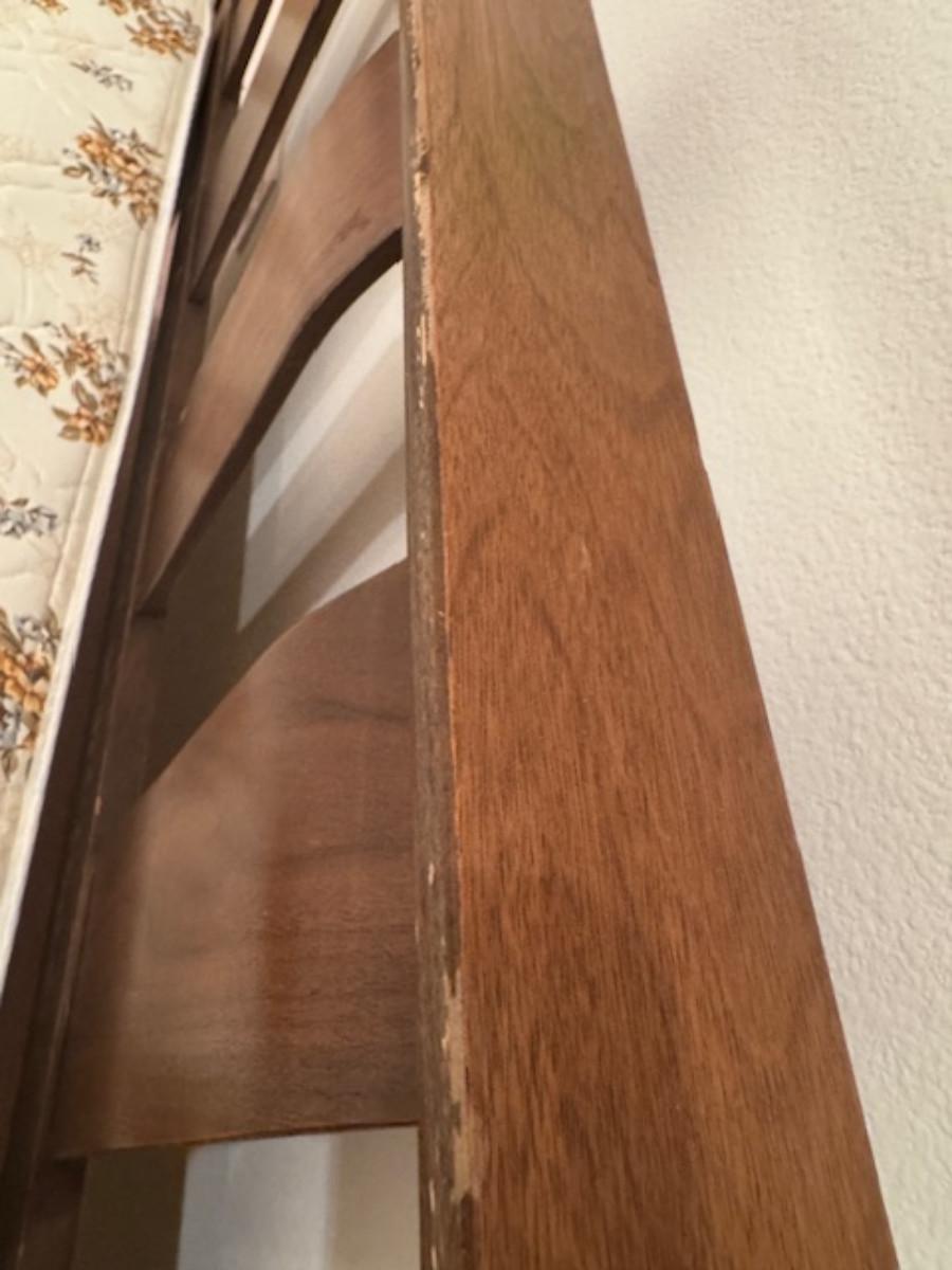 bed frame is as is condition many scratches and right side of head board is slightly coming apart - see pictures