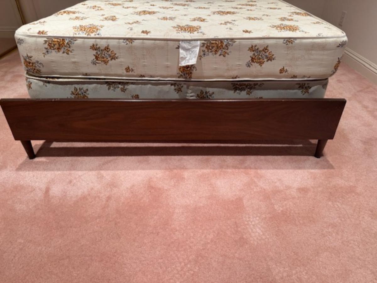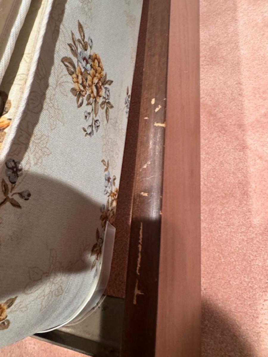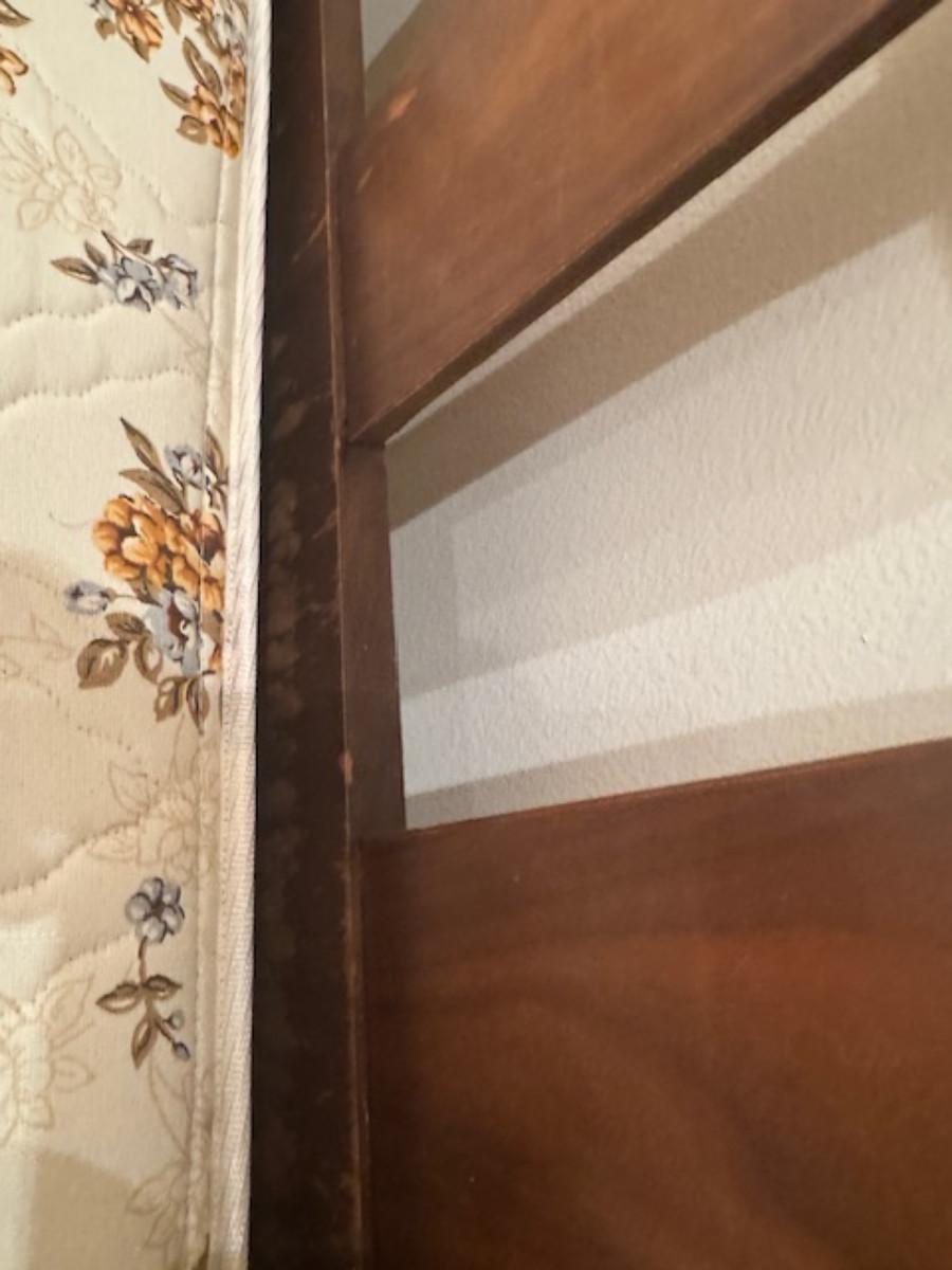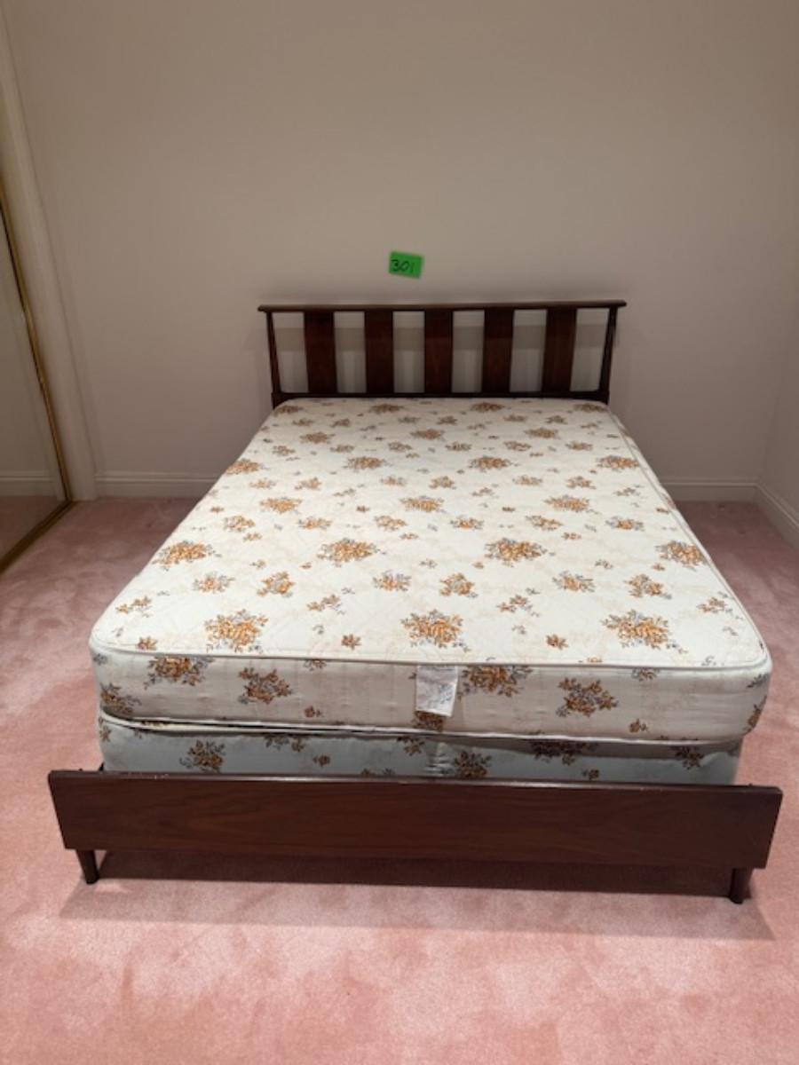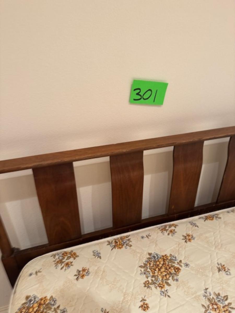bed frame is as is condition many scratches and right side of head board is slightly coming apart - see pictures
