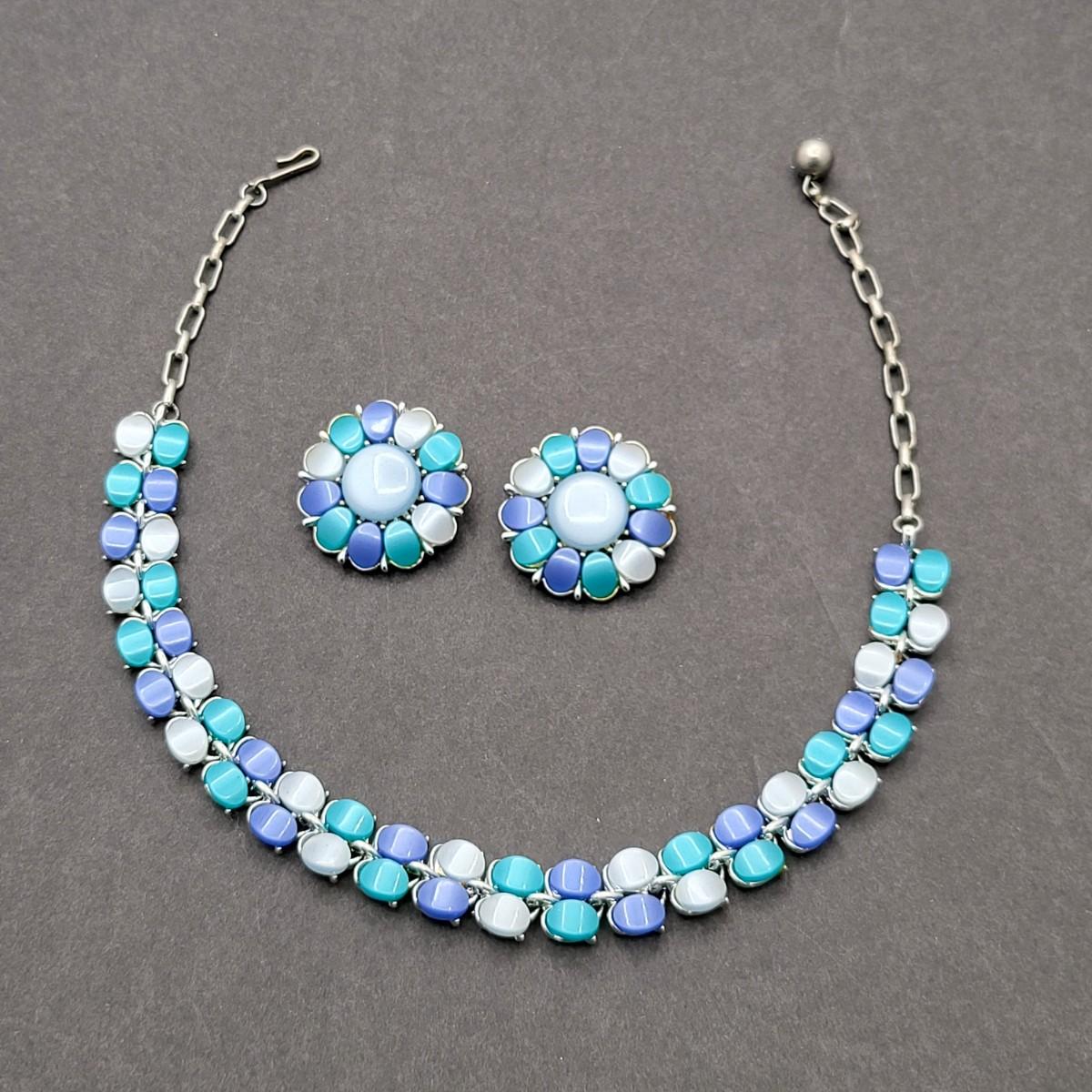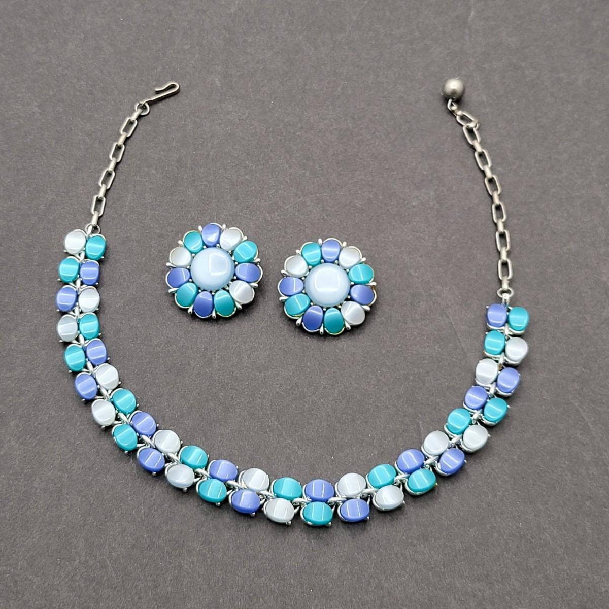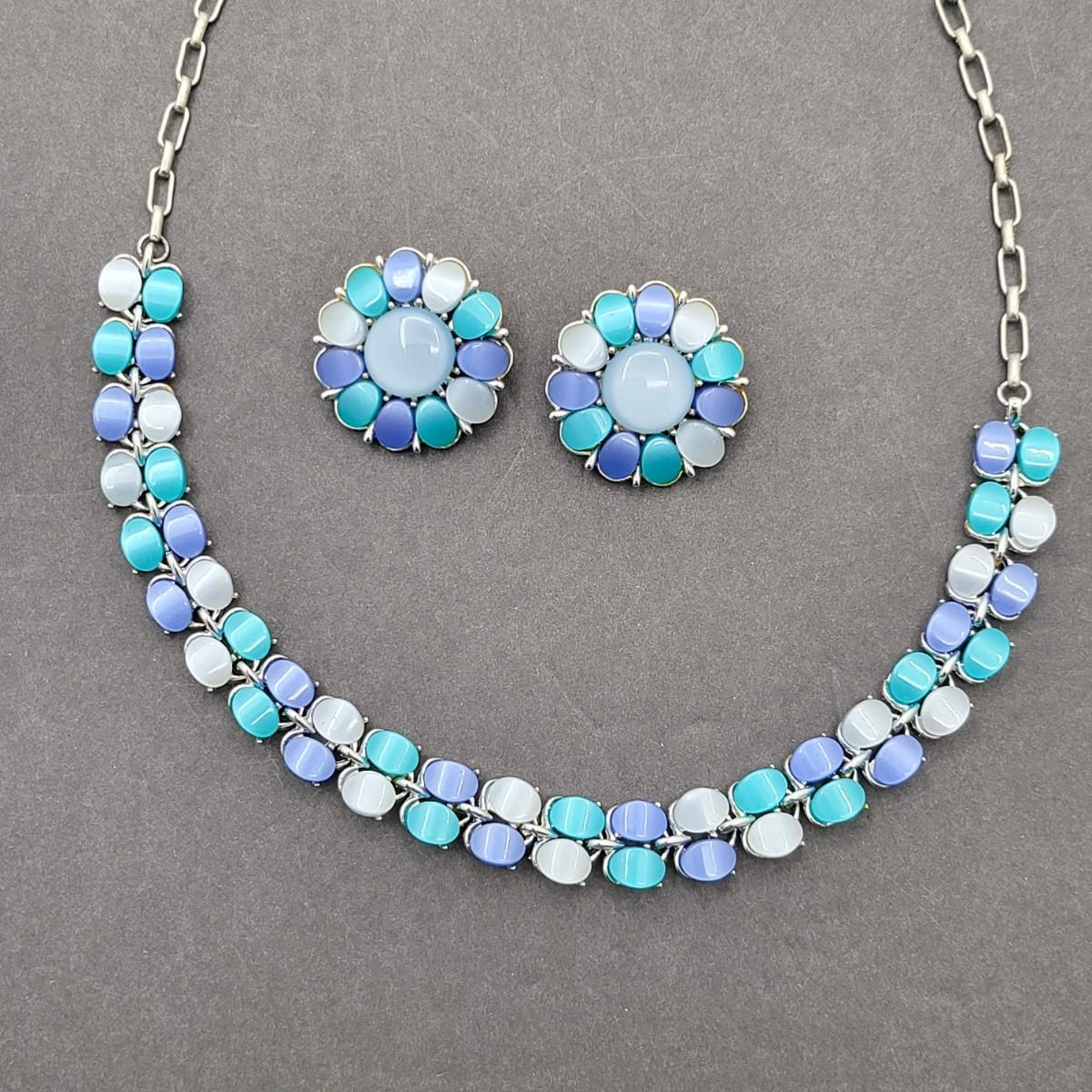Mid-Century Blue Hues Thermoset Necklace & Clip Earrings Set