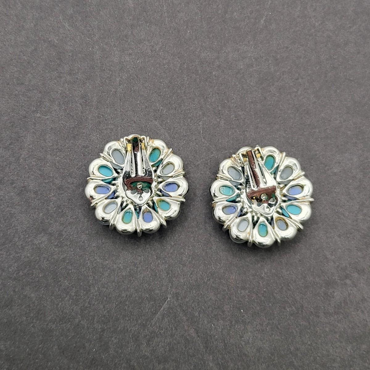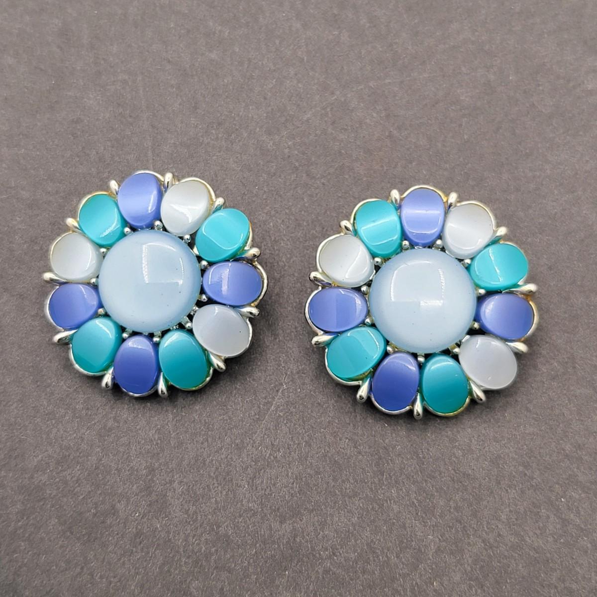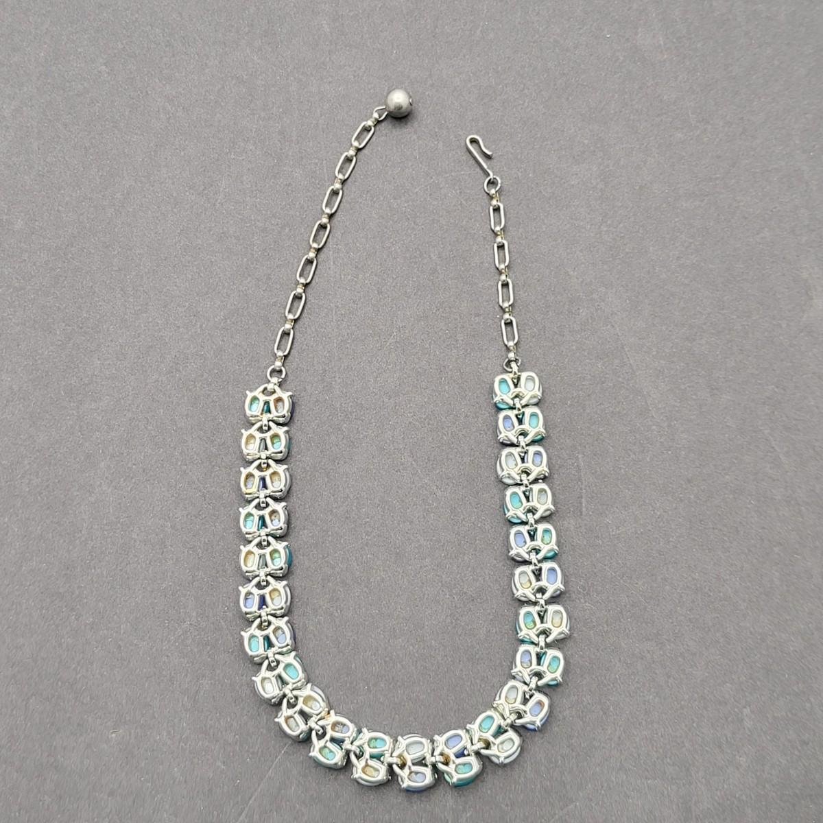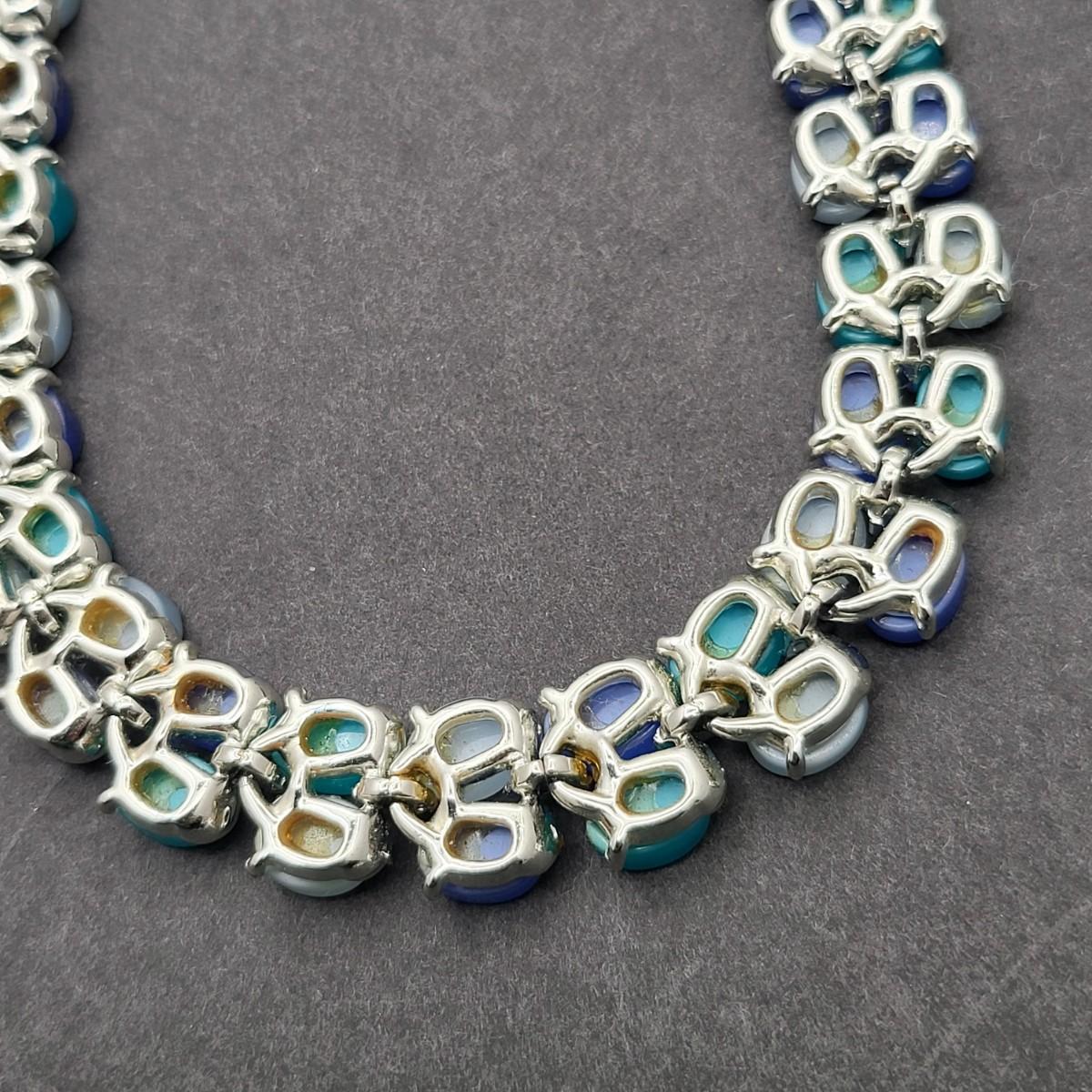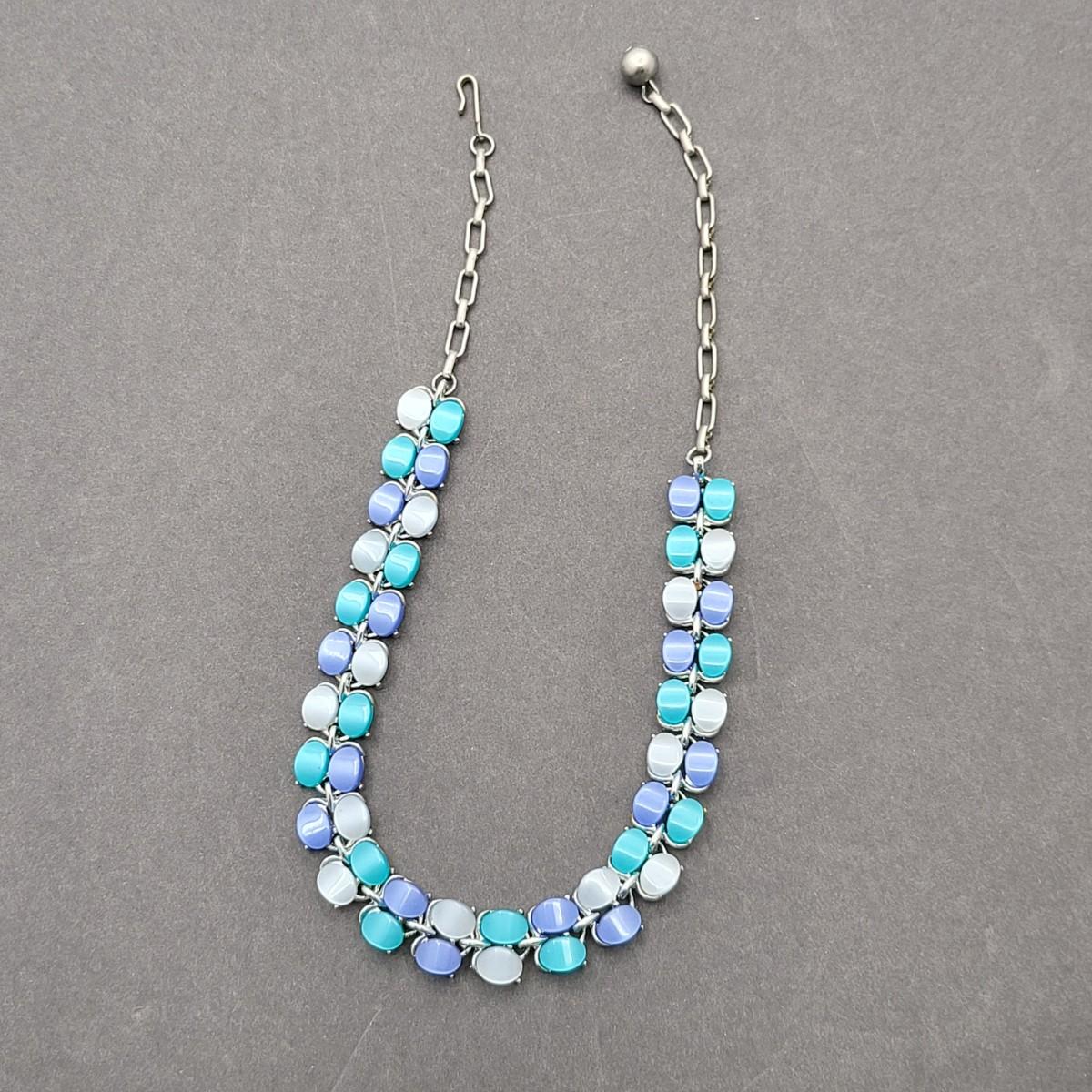 Gorgeous unsigned blue hues, thermoset 15" necklace and 1.25" matching clip earrings. Possibly Coro or Lisner.
