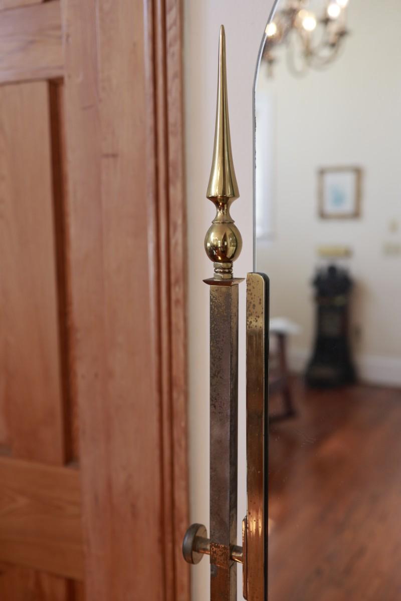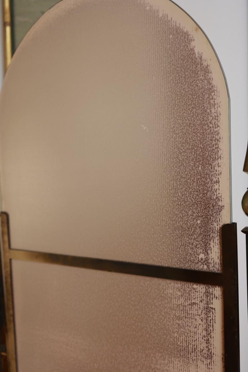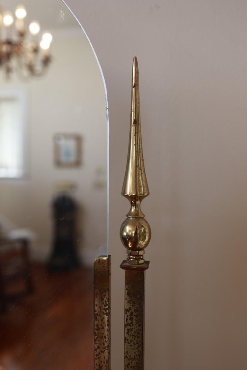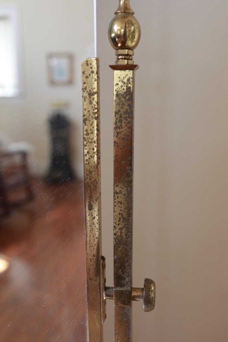 Glass can slide out of the top to safely transport. Please see detailed photos for condition of brass frame.