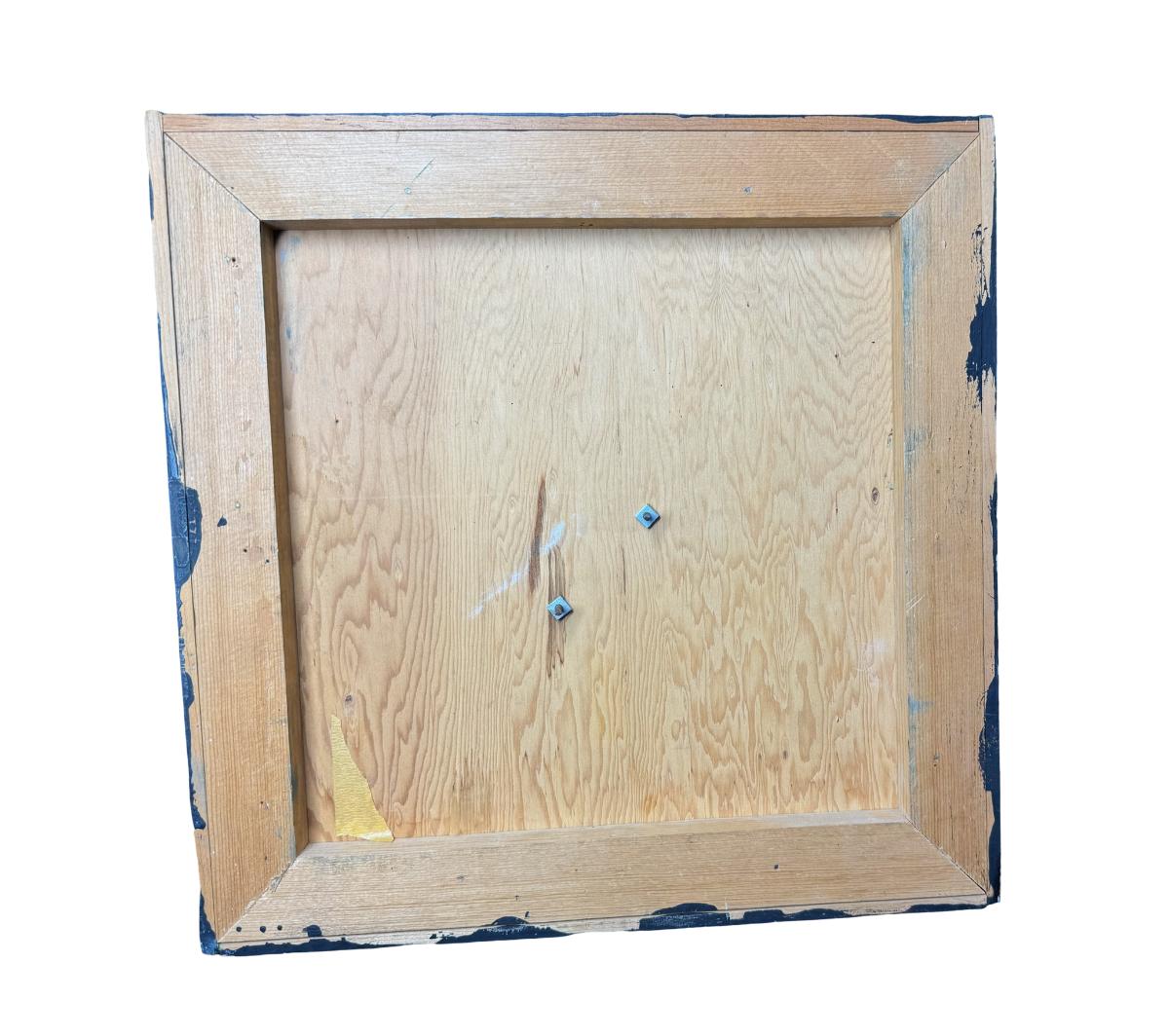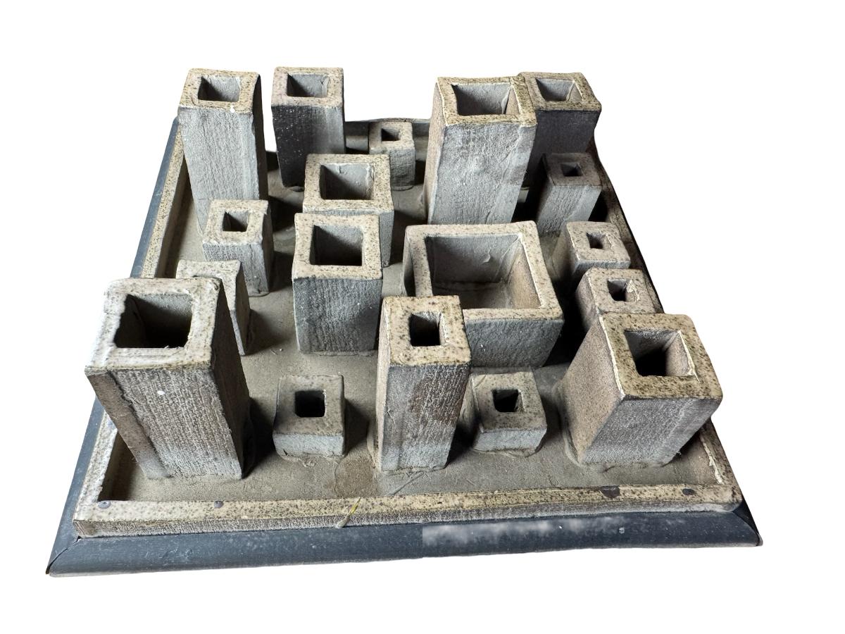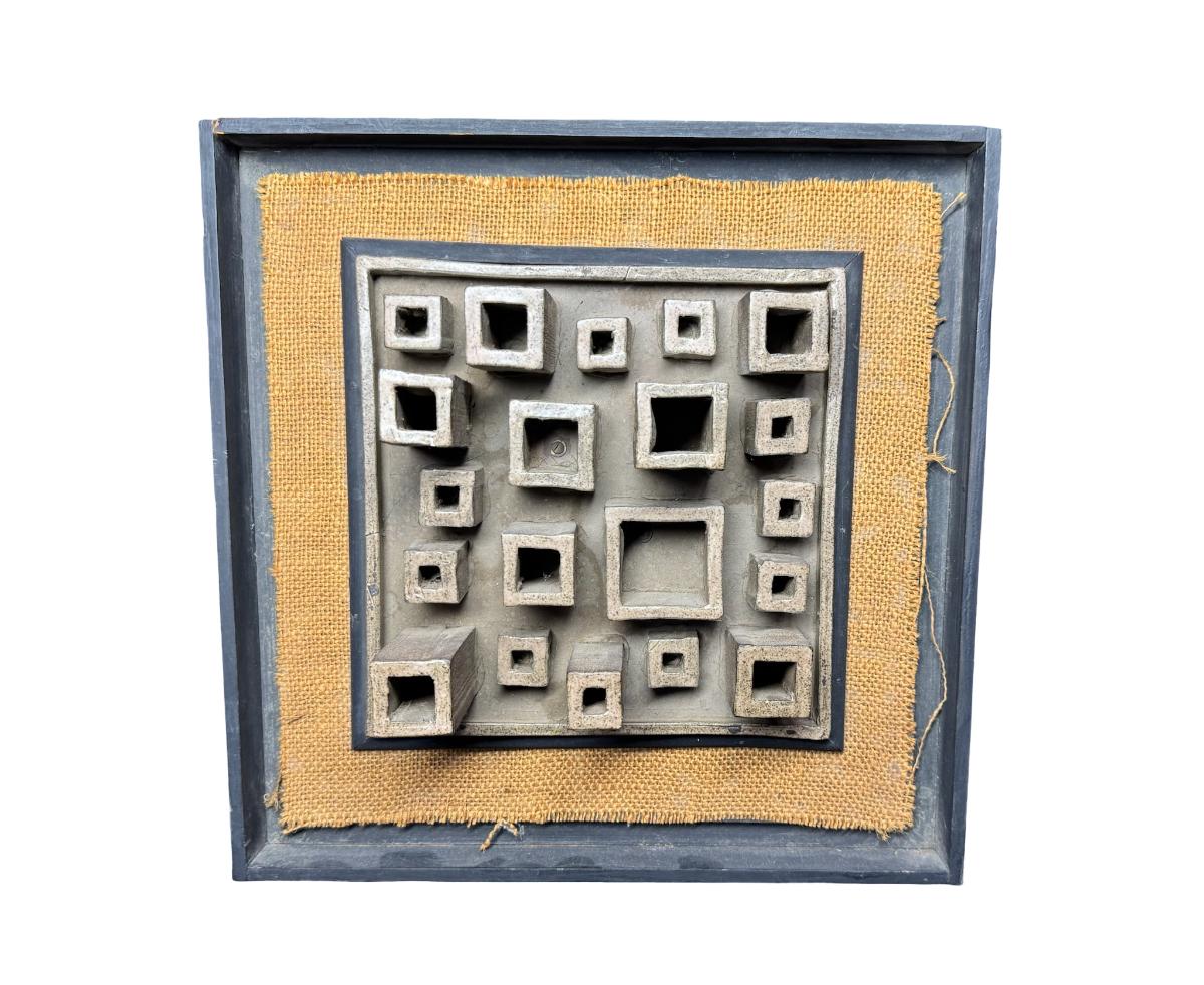 This period piece features raised ceramic columns of geometric forms. The varying heights of the columns represent a city skyline or abstract architecture. This is a heavy framed piece. Measurement: 13” x 13”. [JL]