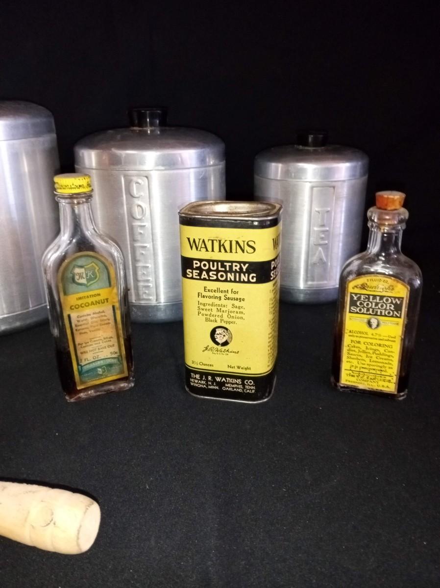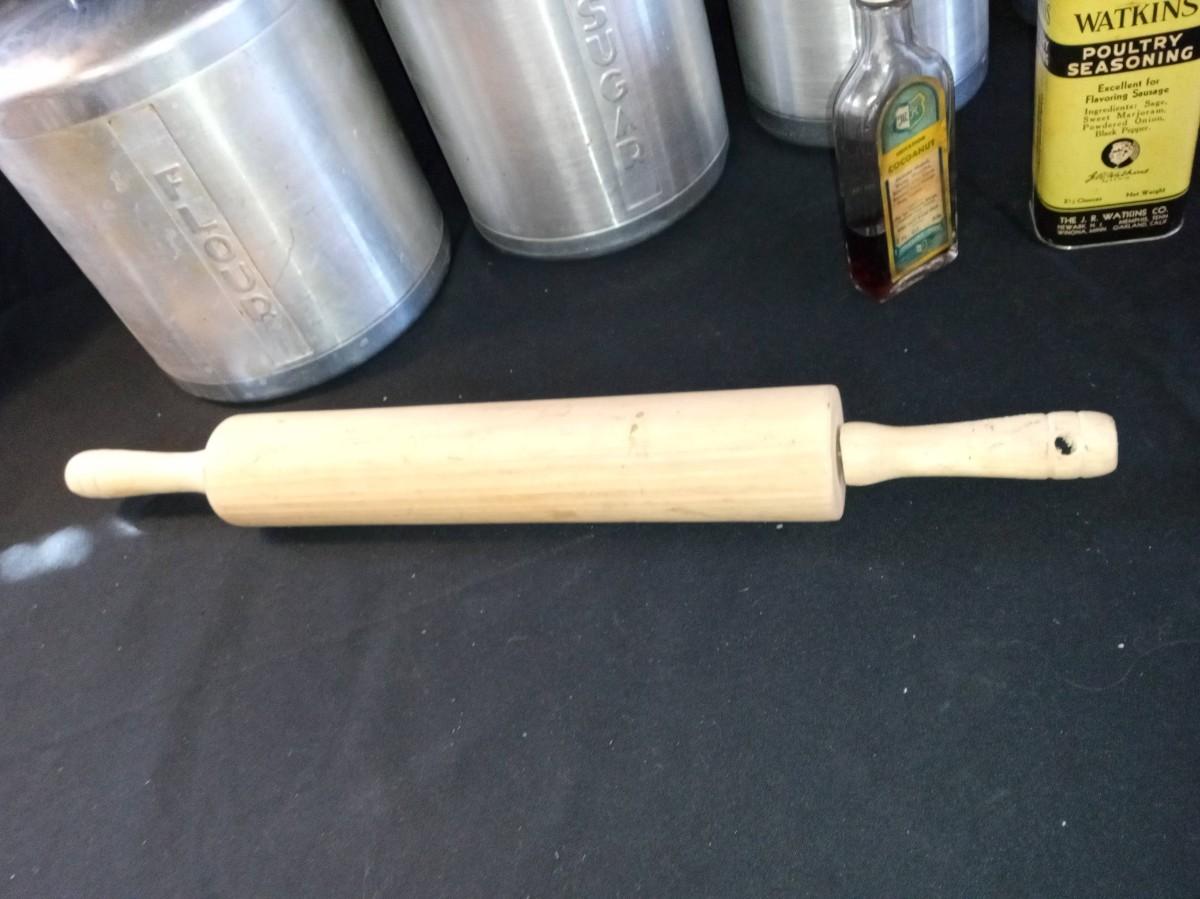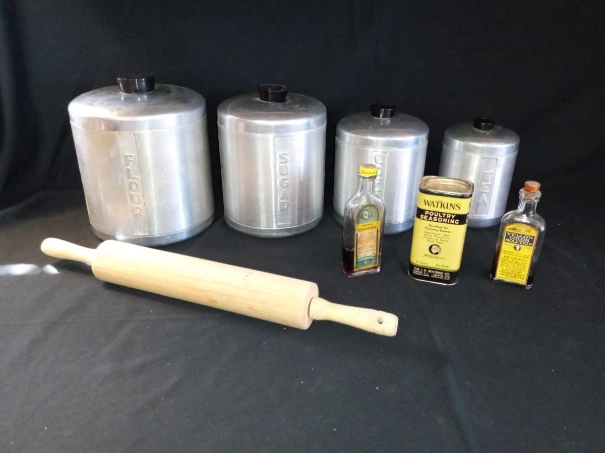 MID-CENTURY CANISTERS, SPICE CONTAINERS AND WOODEN ROLLING PIN