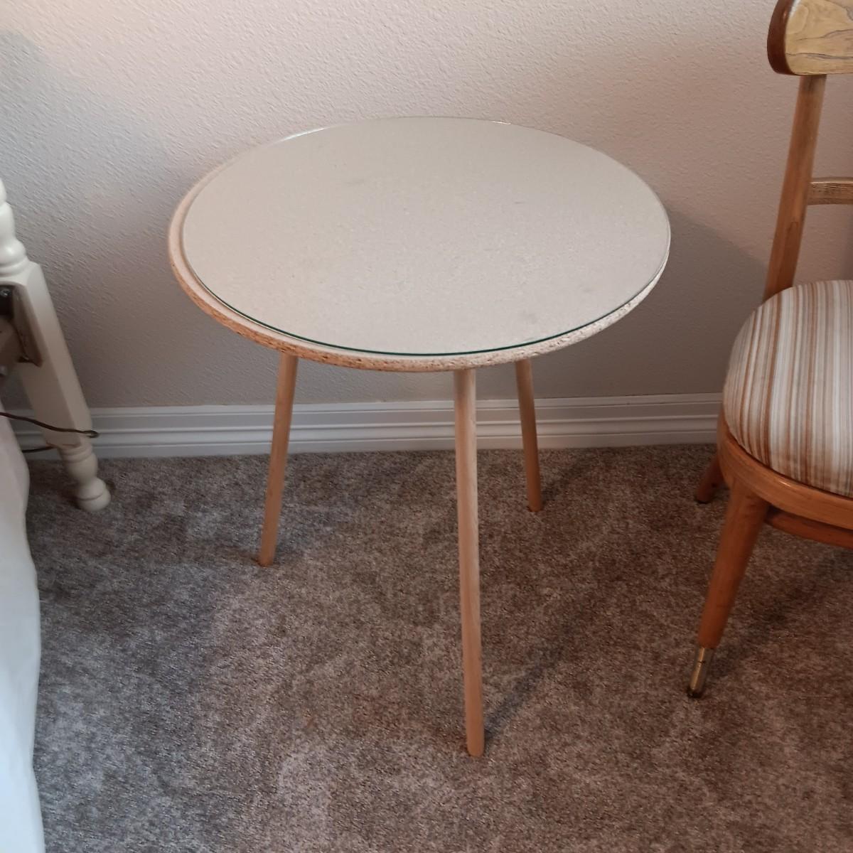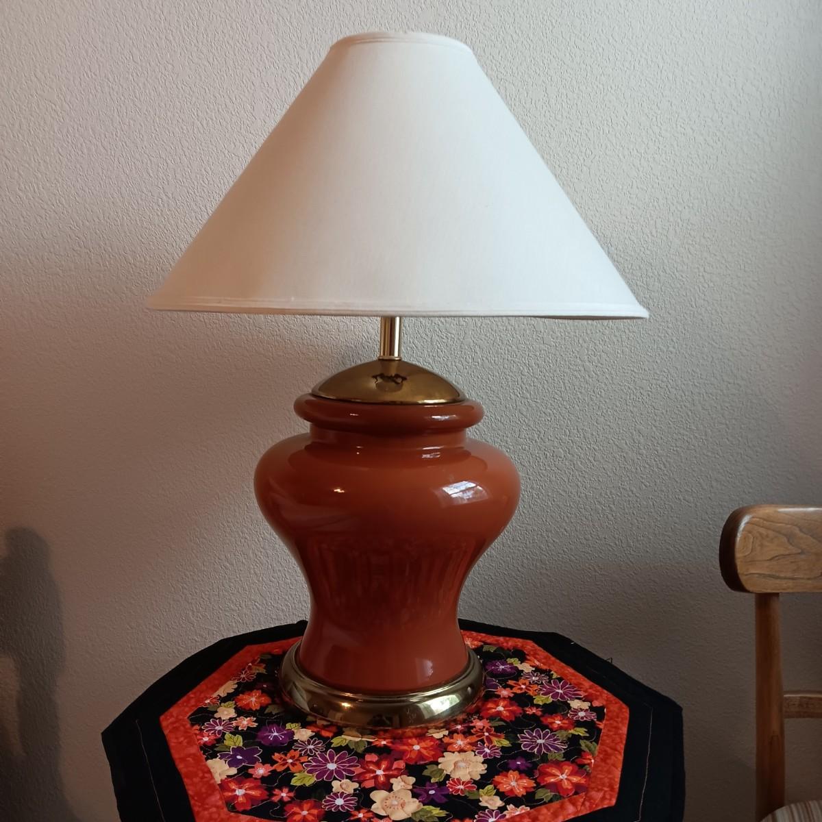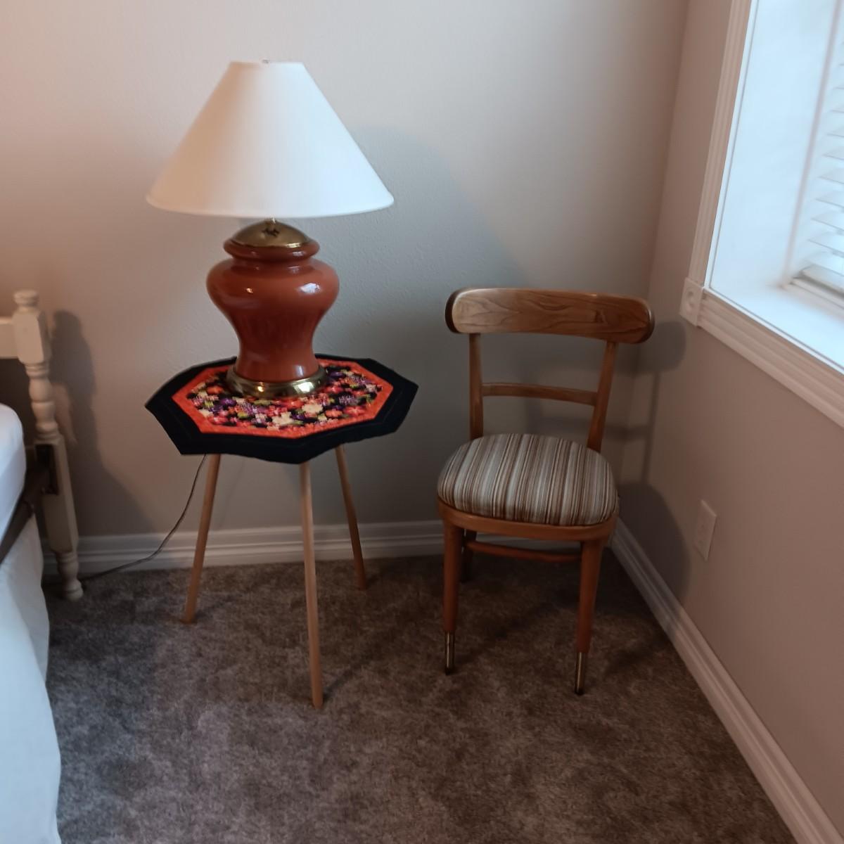 MID-CENTURY CHAIR, BURNT ORANGE LAMP, ROUND TABLE W/QUILTED PIECE