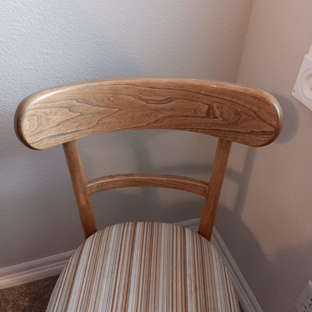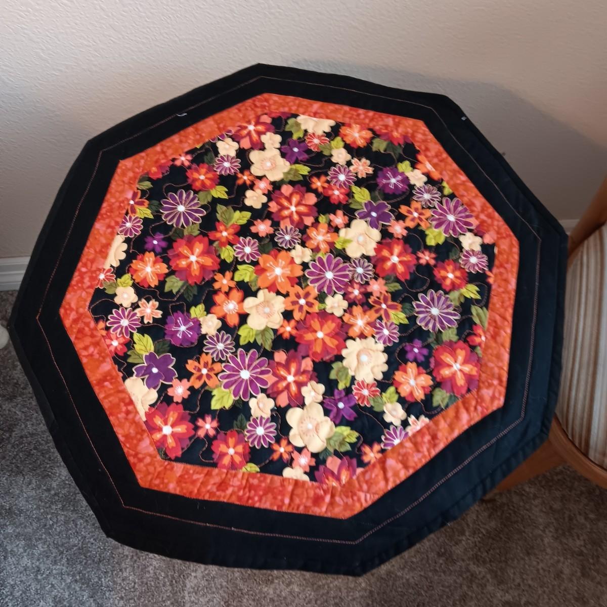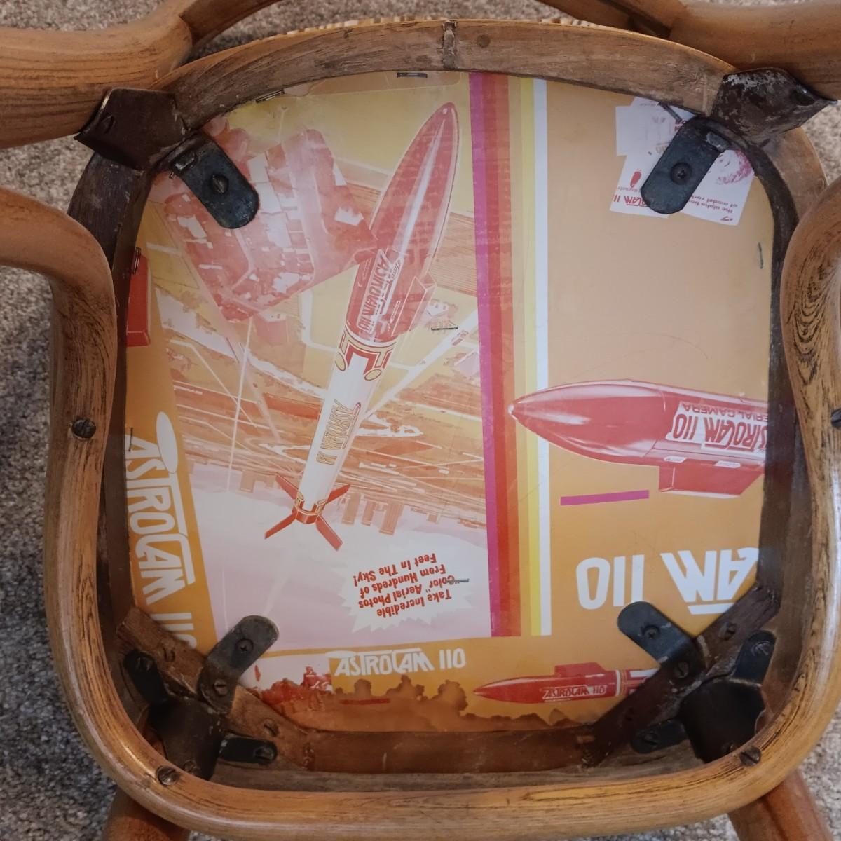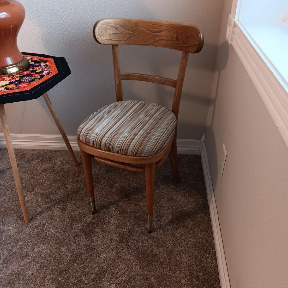 MID-CENTURY CHAIR, BURNT ORANGE LAMP, ROUND TABLE W/QUILTED PIECE