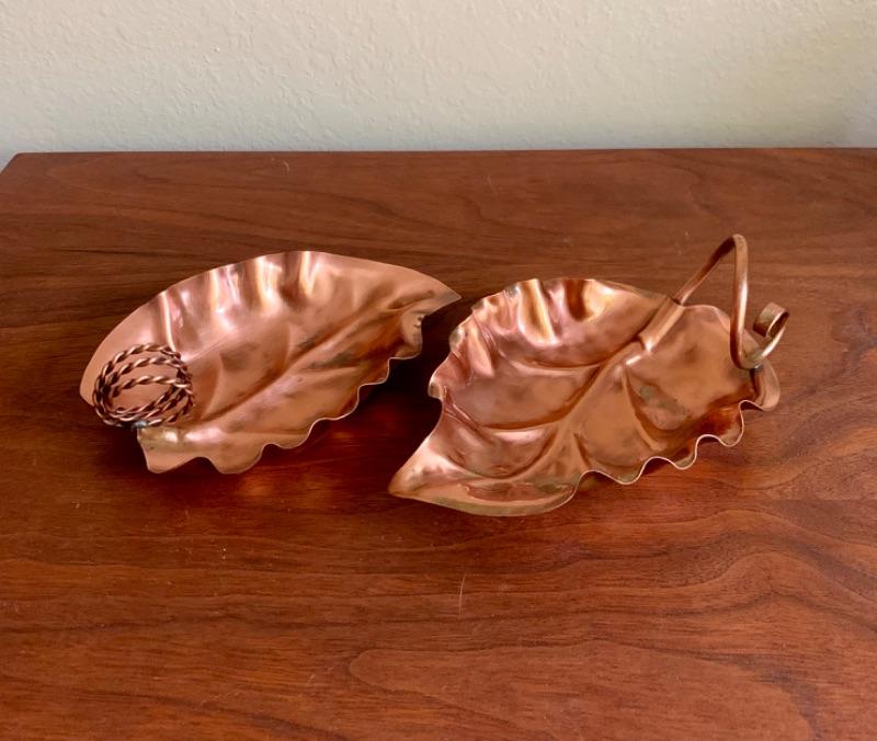 Set of 2, MCM solid copper nut /candy /trinket dishes. One has “Gregorian Copper” and “227” etched on bottom. The other is unmarked. Measures 6 1/2” x 4 1/2.”