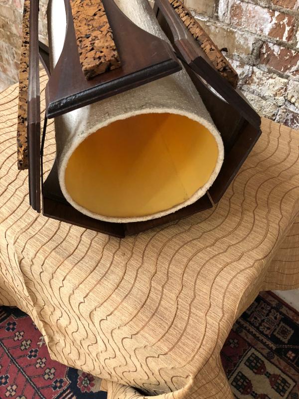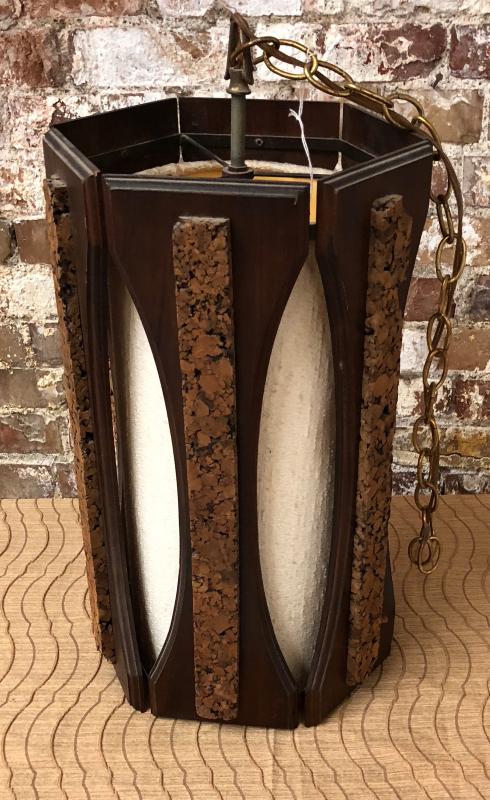MCM swag light with cork and walnut, needs new cord and chain. 11" diameter, 18" tall.