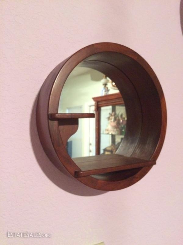 Vintage round mirror made in Denmark in circa 1950. The frame, tapered at a point at the front, is made of seven sections of teak joined through finger joints. It hangs, In excellent condition. less