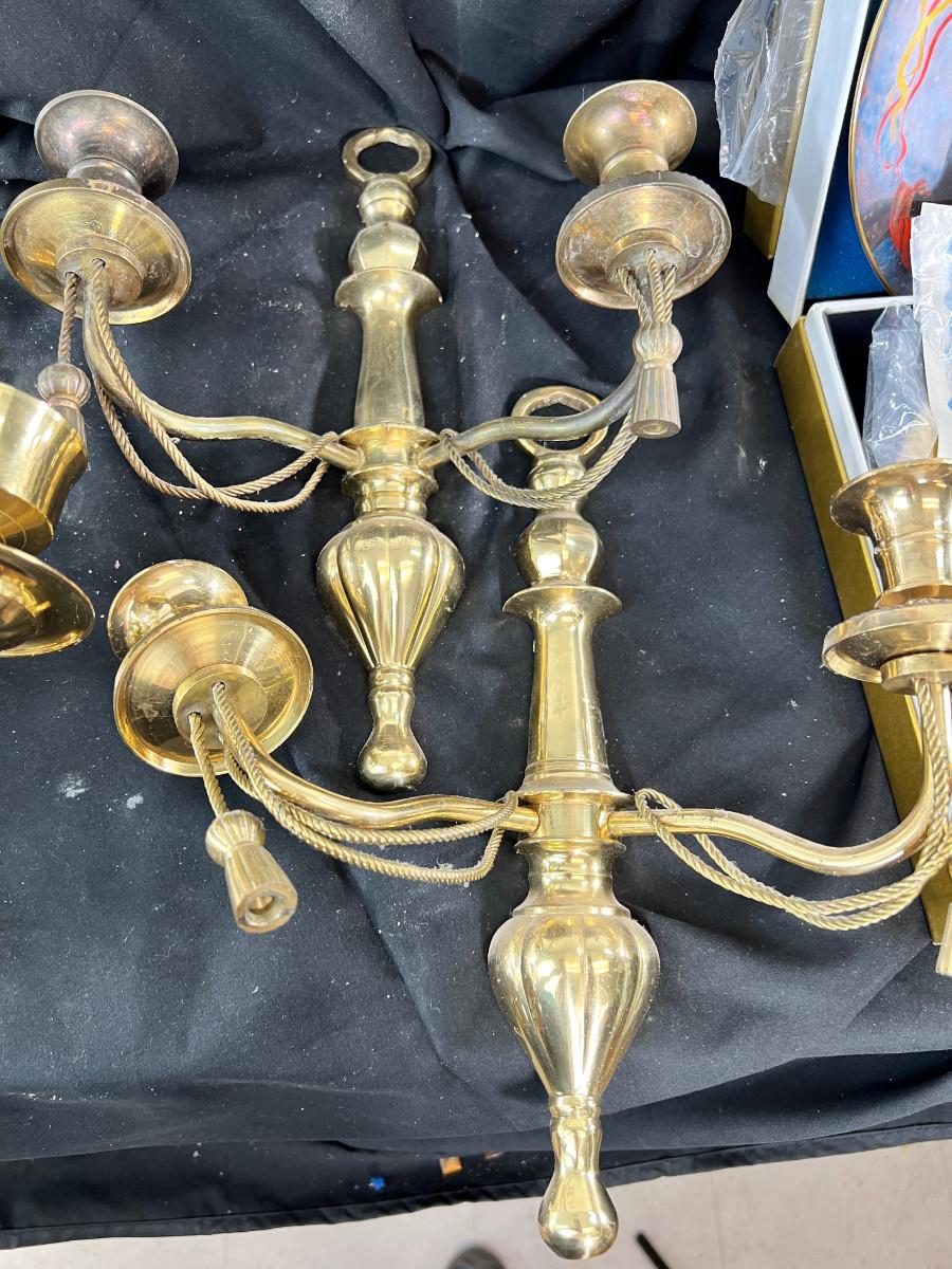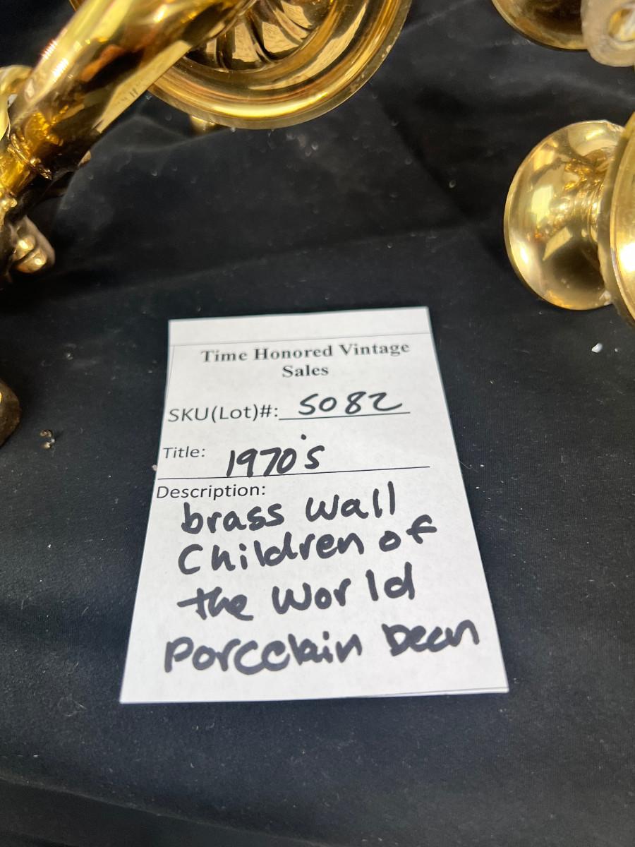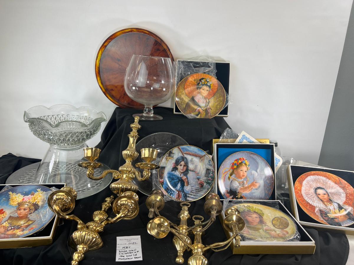 Decorative Plates from the "Children of the World" series with COA and boxes. MCM cast brass wall sconces with glass candle holders. Hobnail fruit bowl with plate. Resin round tray.. 1 Large clear glass Fruit bowl , Beta fish bowl.
