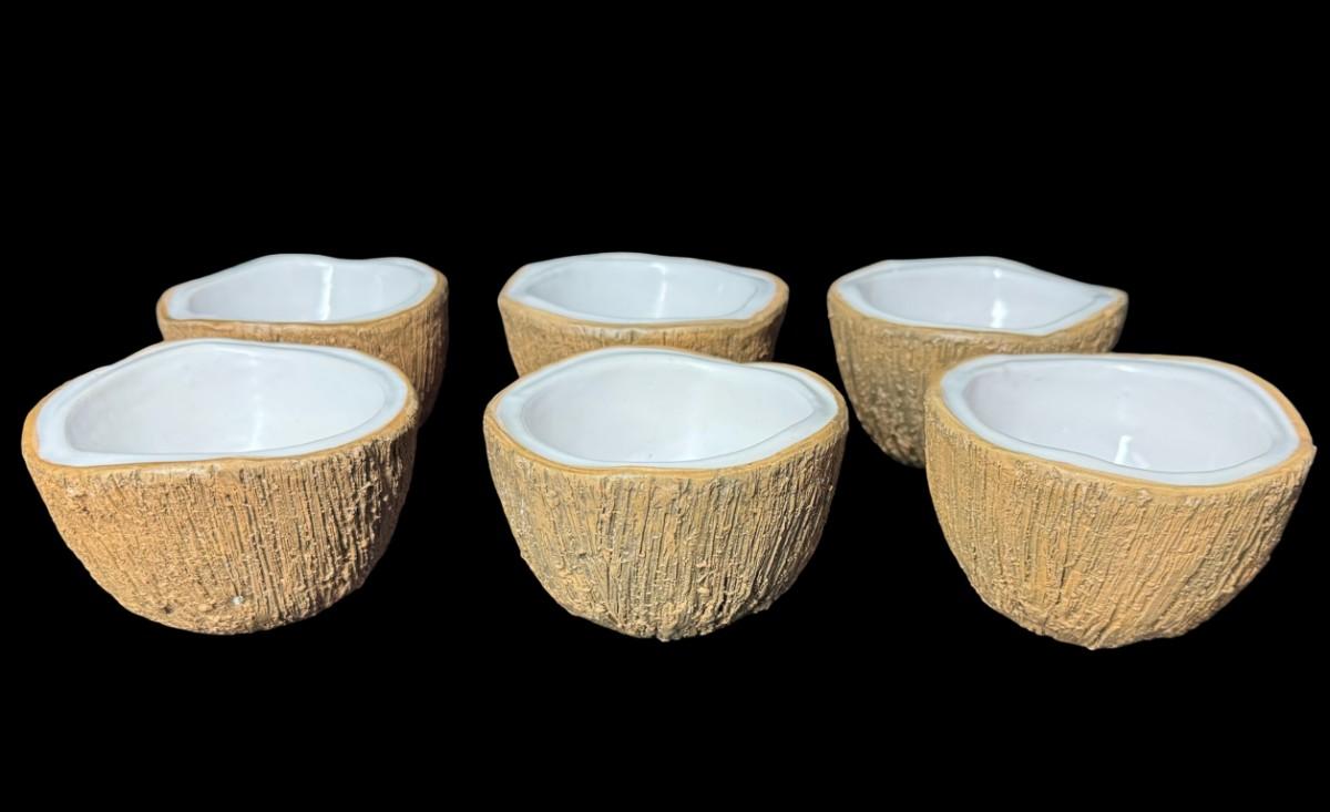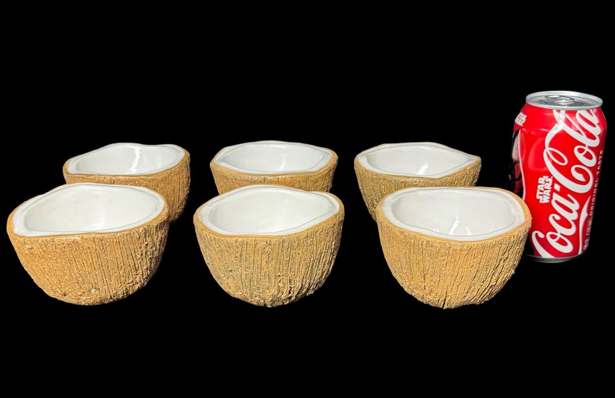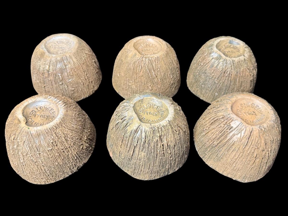 Made in Italy. These have a rough brown exterior, like that of real coconuts. Total of six pieces. No obvious chips or cracks. Measurement: 2.5”H x 4” Diameter (each). Pre-auction estimate: $75-$150. [KD]