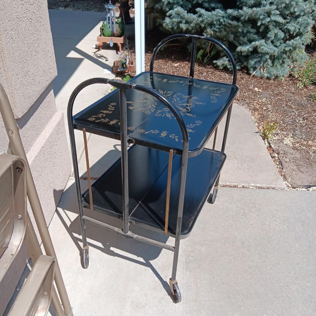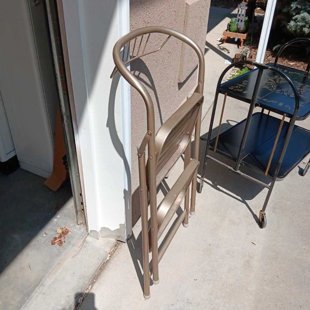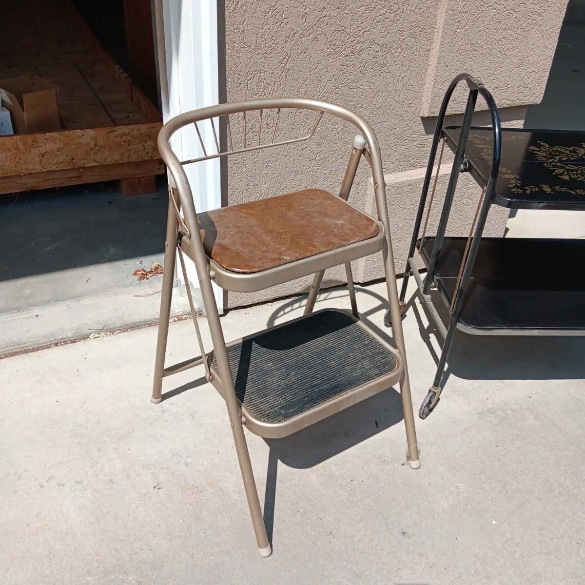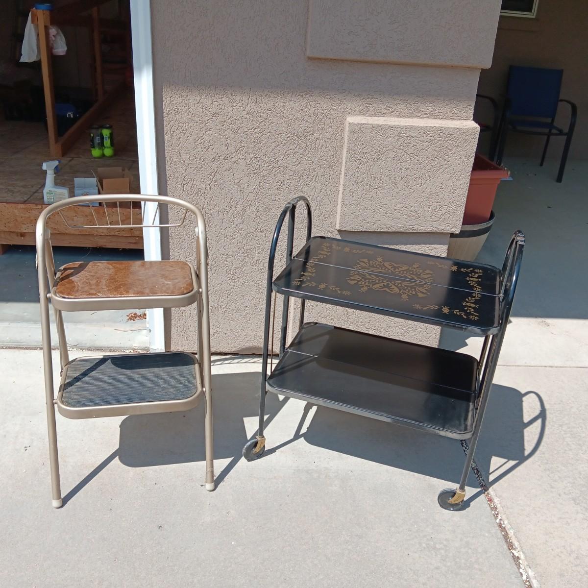 MID-CENTURY FOLDING 2 TIER CART ON CASTERS AND A FOLDING STEP STOOL
