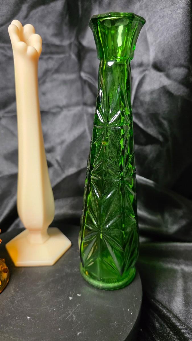 Mid-Century Glass Bud Vase Trio – Amber Hobnail Fenton, Satin Hand Westmoreland, and Emerald Starburst Anchor Hocking Set