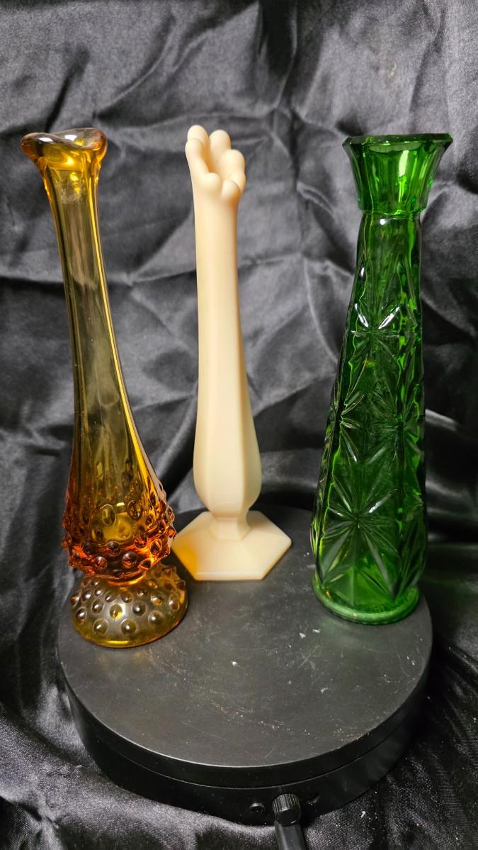 A striking trio of mid-century glass artistry, this bundled set captures three distinct expressions of American decorative design from the golden era of pressed and blown glass. Each vase stands as its own sculptural statement, yet together they create a curated composition of color, texture, and form that instantly elevates any vignette, shelf, or tabletop. Collected as a set, they tell the story of post-war optimism, when glassmakers pushed playful silhouettes and bold finishes into everyday décor.