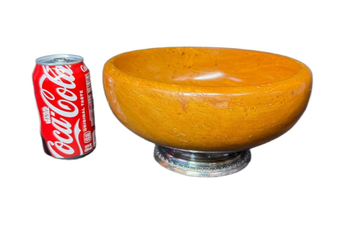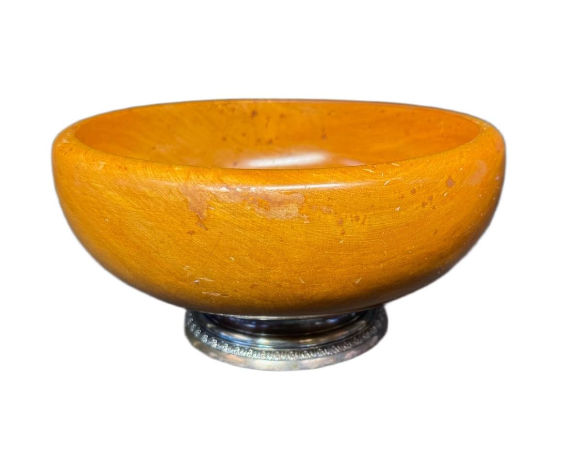 This bowl features a birch wood bowl on a sterling silver base. Age related wear. Measurement: 10” Diameter. [CS]