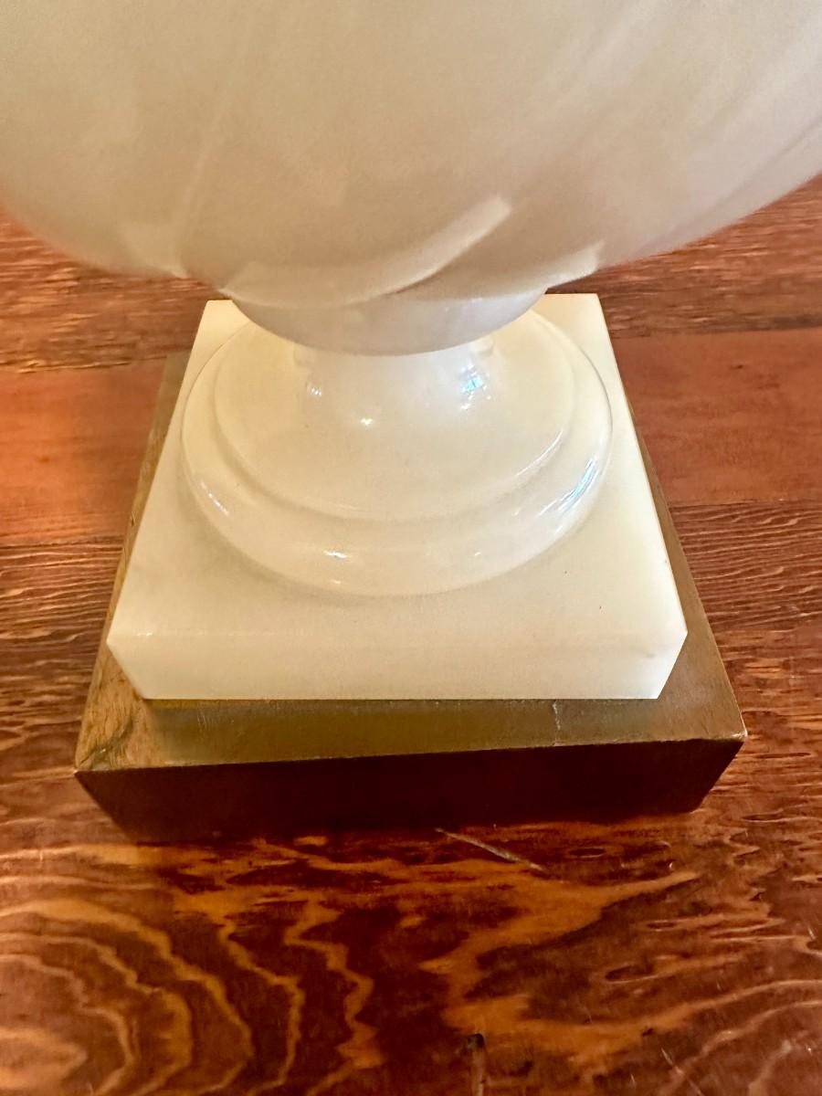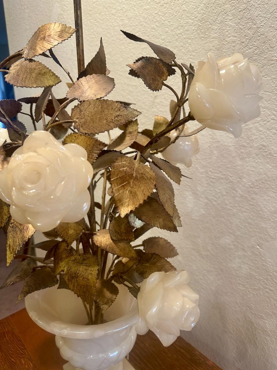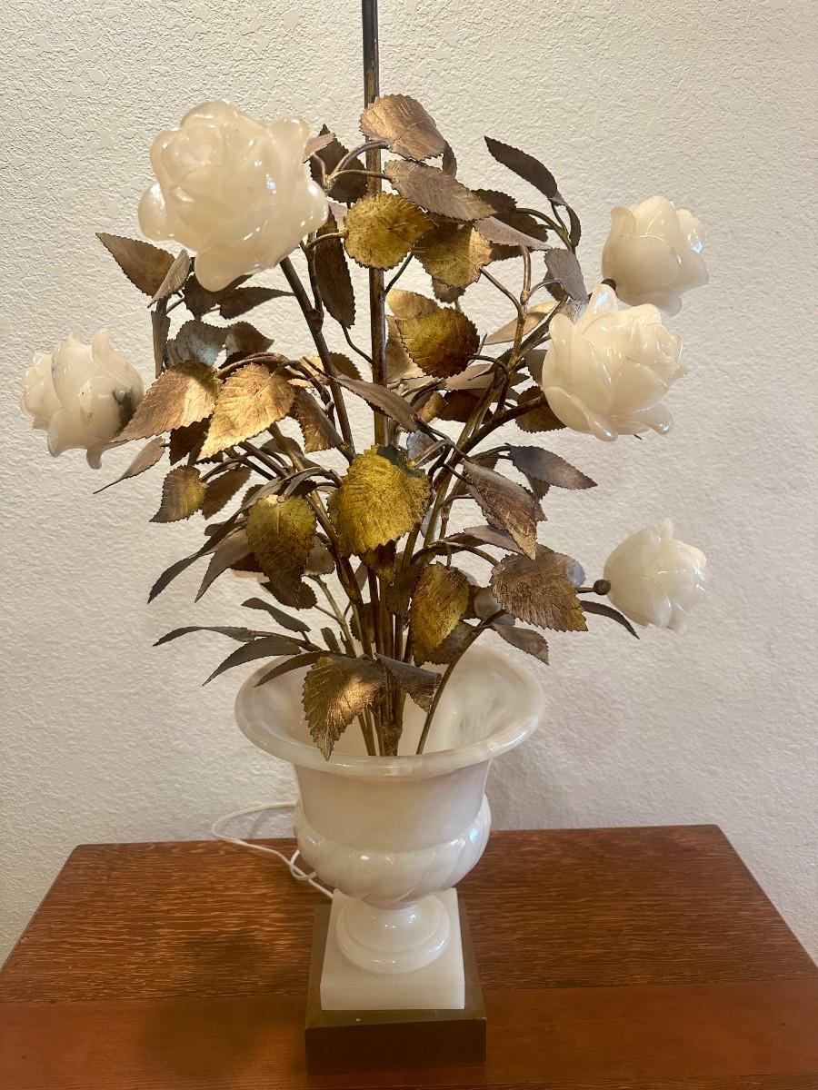 This is a stunning 1950's Hollywood Regency Alabaster lamp in rare style of carved roses and bronze stems & leaves in alabaster urn. Dual light bulbs and pull string light in working order This piece is in beautiful condition.