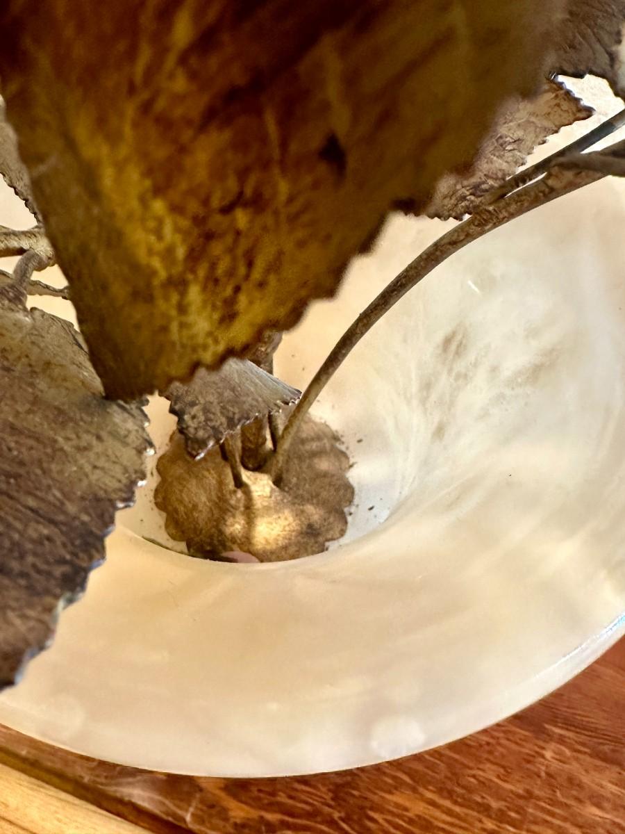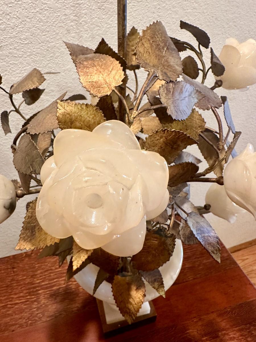 1950's Mid-Century Hollywood Regency Alabaster Lamp; Carved Roses & Bronze Foliage