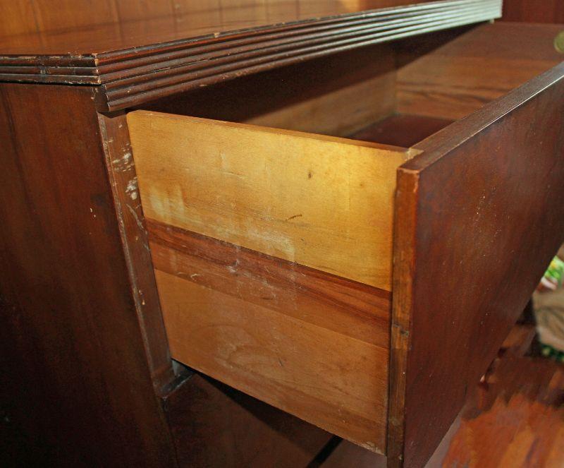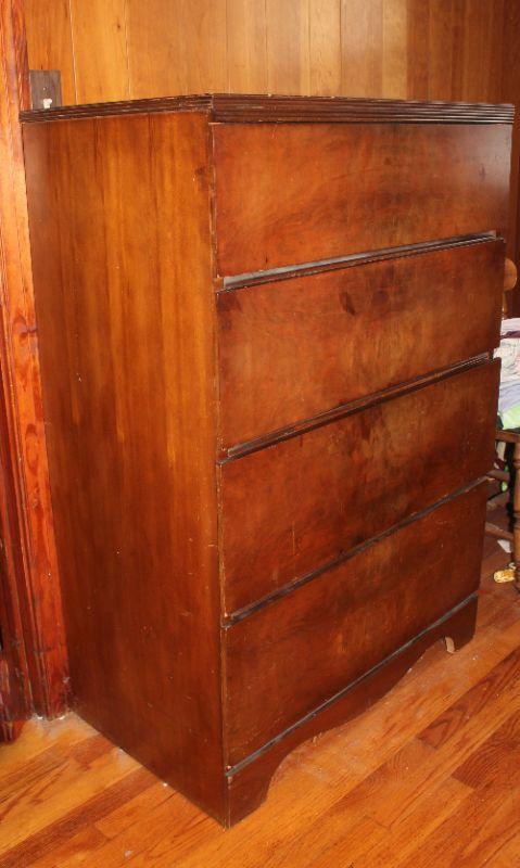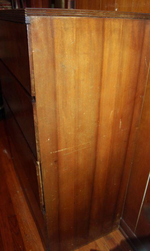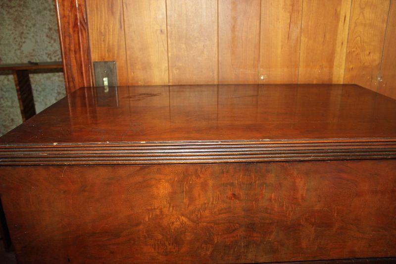 This chest is solid! While the bones are great, there are some gouges in the top and some it needs a good cleaning. It stands 49" high, is 34" from side to side, and 19" from front to back. Please listing for the matching vanity.