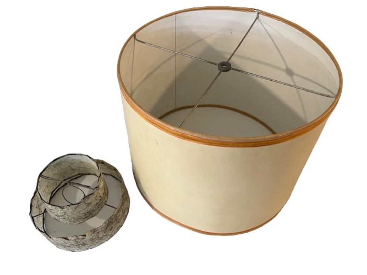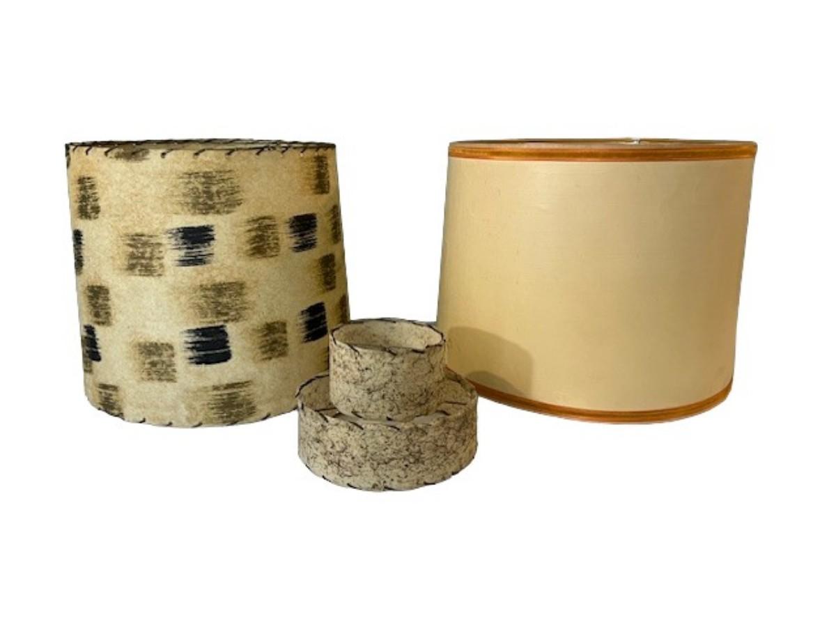 Two are fiberglass. One is a drum shade. Total of 3 pieces. Measurement of largest: 16" diameter.