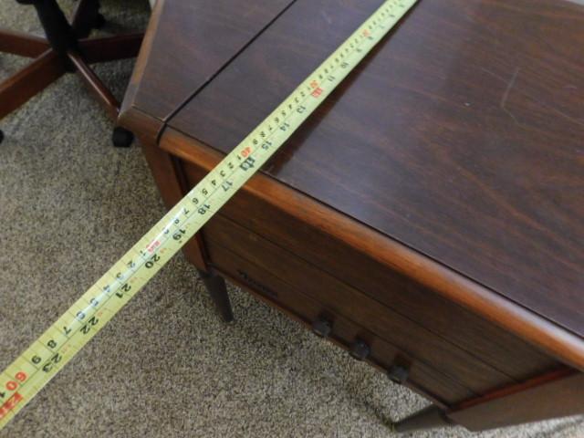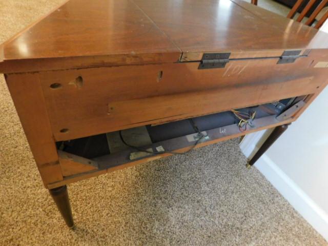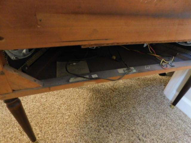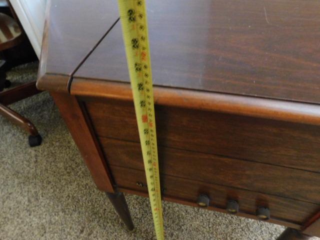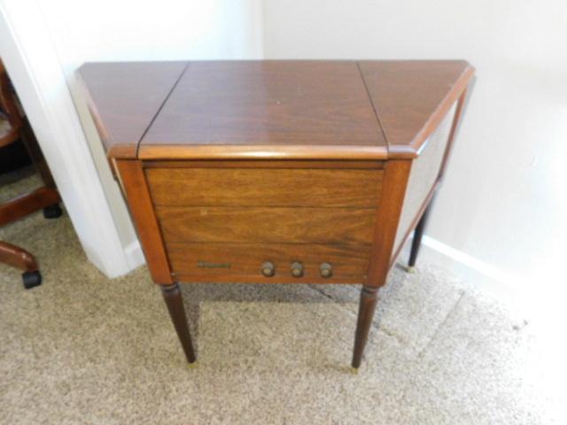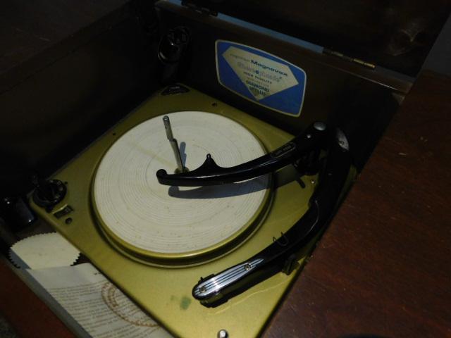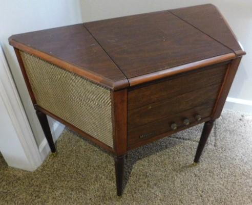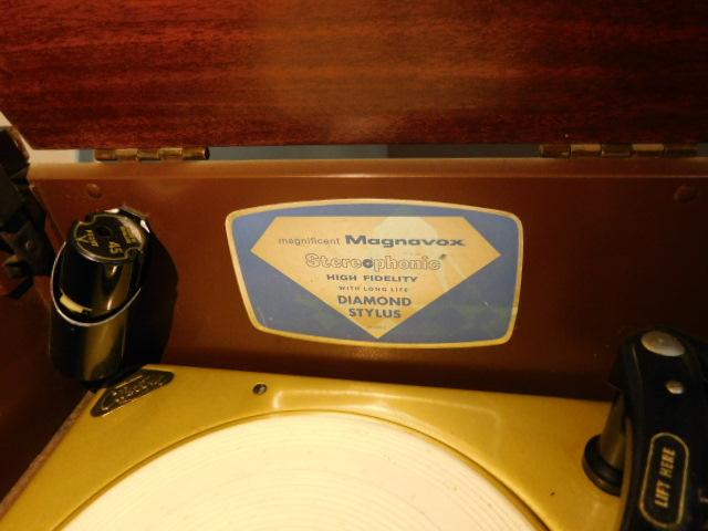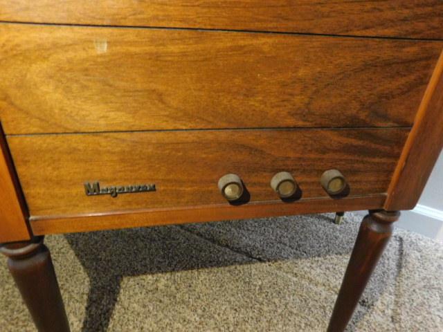 Mid-Century Magnificent Magnavox Sterophonic High Fidelity Turntable has some wear or scratches. One leg is a little loose. Component will need servicing. This is a rare trapezoid cabinet design and has a terrific visual appeal.