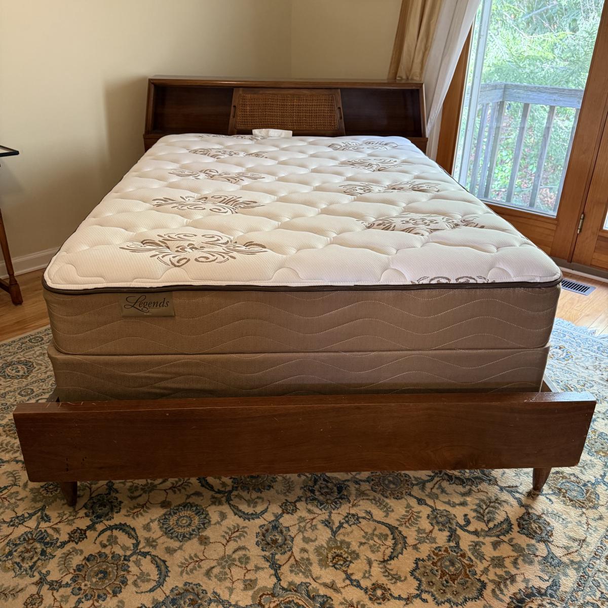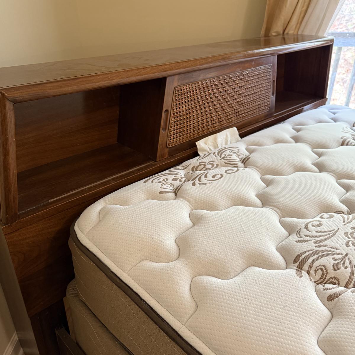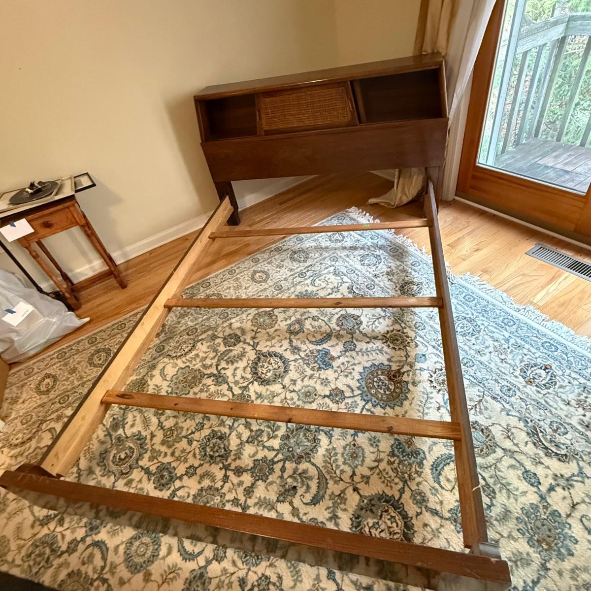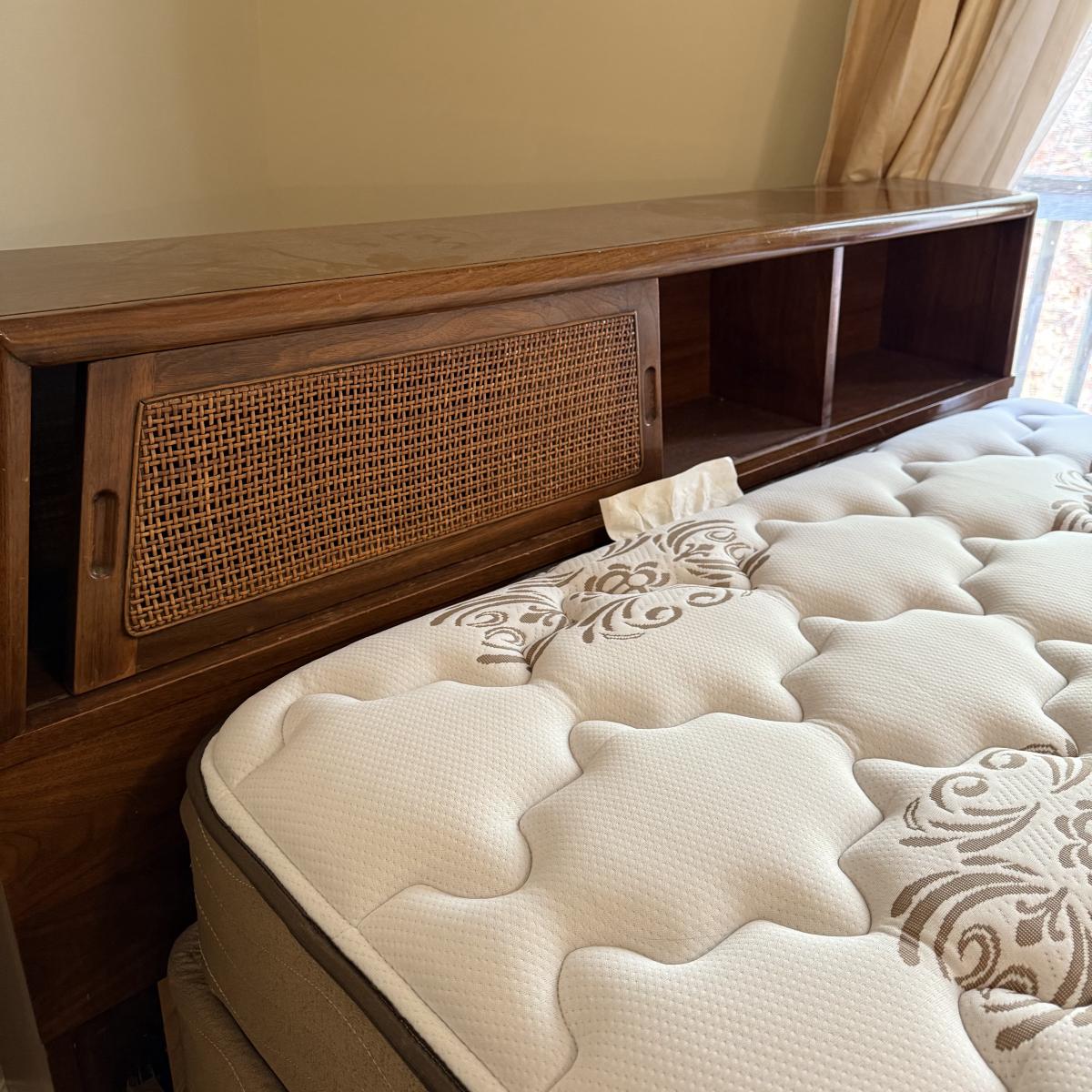 This lot contains a groovy mid-century modern full bed frame. The frame itself is made out of wood and the headboard has a shelf with a sliding wicker screen. Top of headboard has a few scratches and surface scuffs and a small area of veneer is peeling from the side panel as shown. The frame measures 57” x 88” x 36.5”H, headboard and the mattress with box spring sits 25”H. The mattress and box spring are Legends by Babcock and measure 53” x 74” and has 18”H with box spring. There does not appear to be a need for tools to break down the frame, it seems to pop in and out of itself. See pictures for details. The mattress is available to the winning bidder if desired, but the winning bidder is not required to take it. Local pick up only. Winning bidder must bring assistance to help move and load this item due to its weight and/or size.