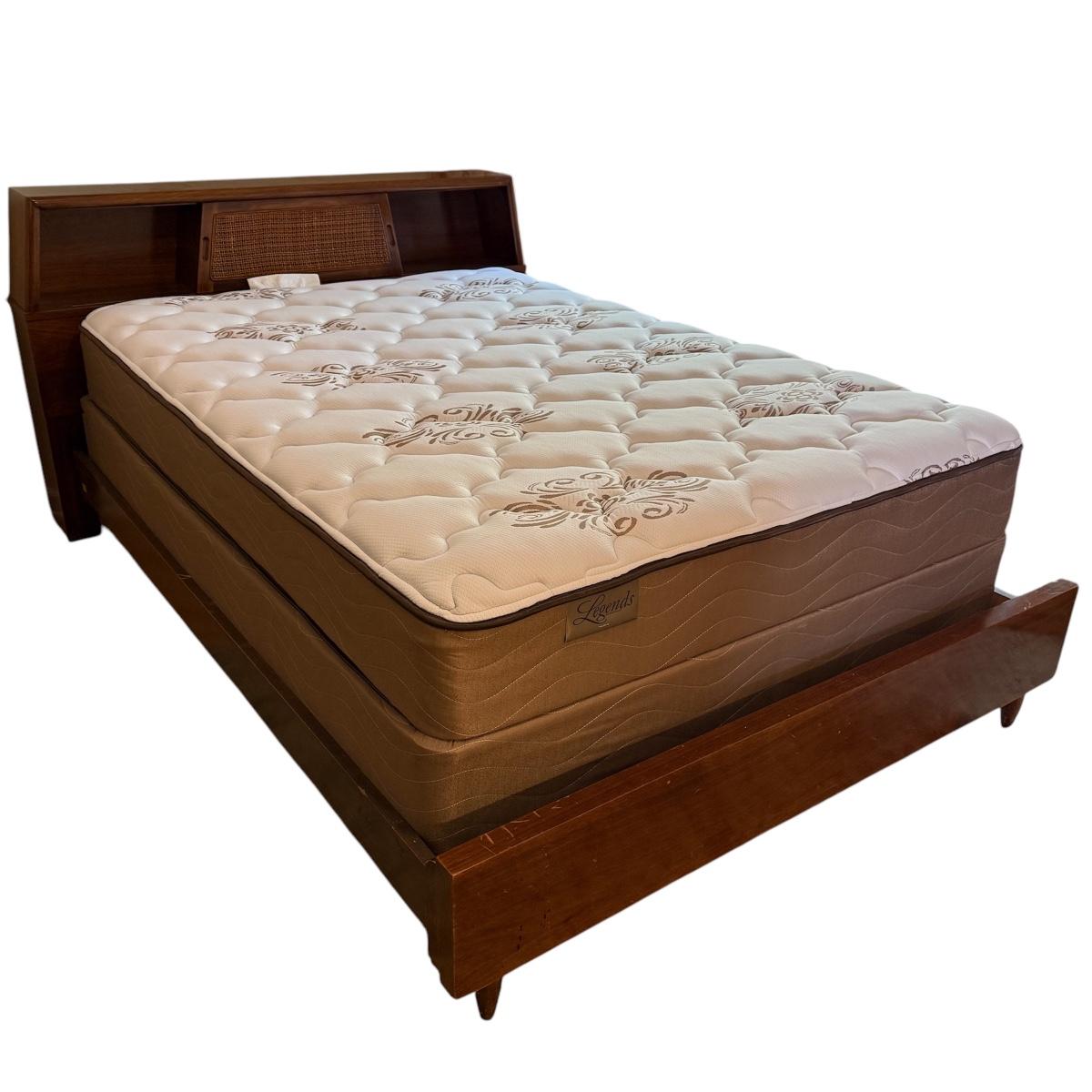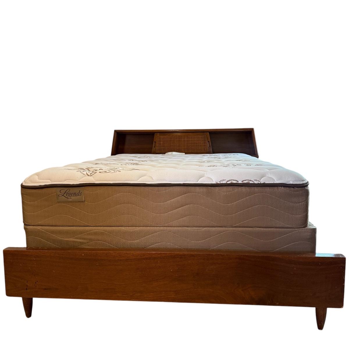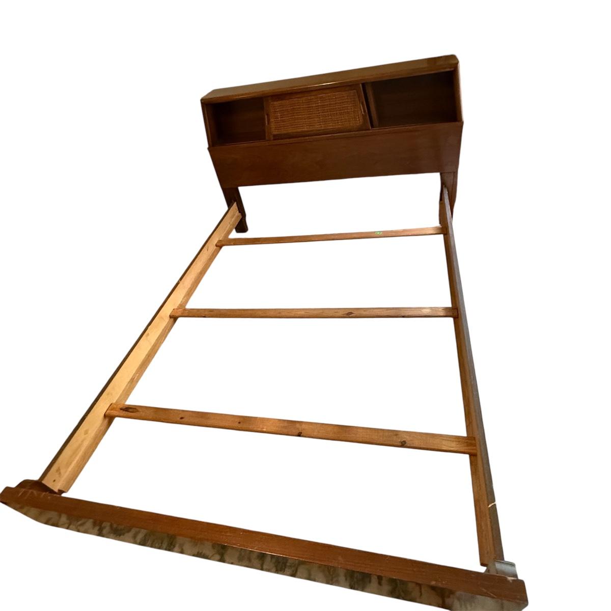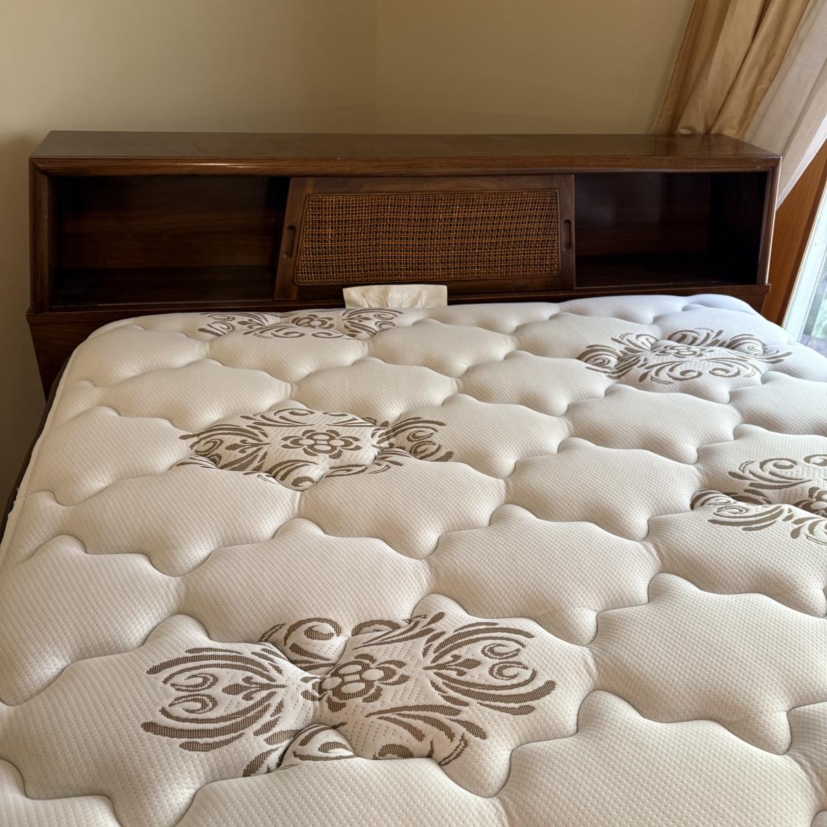 This lot contains a groovy mid-century modern full bed frame. The frame itself is made out of wood and the headboard has a shelf with a sliding wicker screen. Top of headboard has a few scratches and surface scuffs and a small area of veneer is peeling from the side panel as shown. The frame measures 57” x 88” x 36.5”H, headboard and the mattress with box spring sits 25”H. The mattress and box spring are Legends by Babcock and measure 53” x 74” and has 18”H with box spring. There does not appear to be a need for tools to break down the frame, it seems to pop in and out of itself. See pictures for details. The mattress is available to the winning bidder if desired, but the winning bidder is not required to take it. Local pick up only. Winning bidder must bring assistance to help move and load this item due to its weight and/or size.