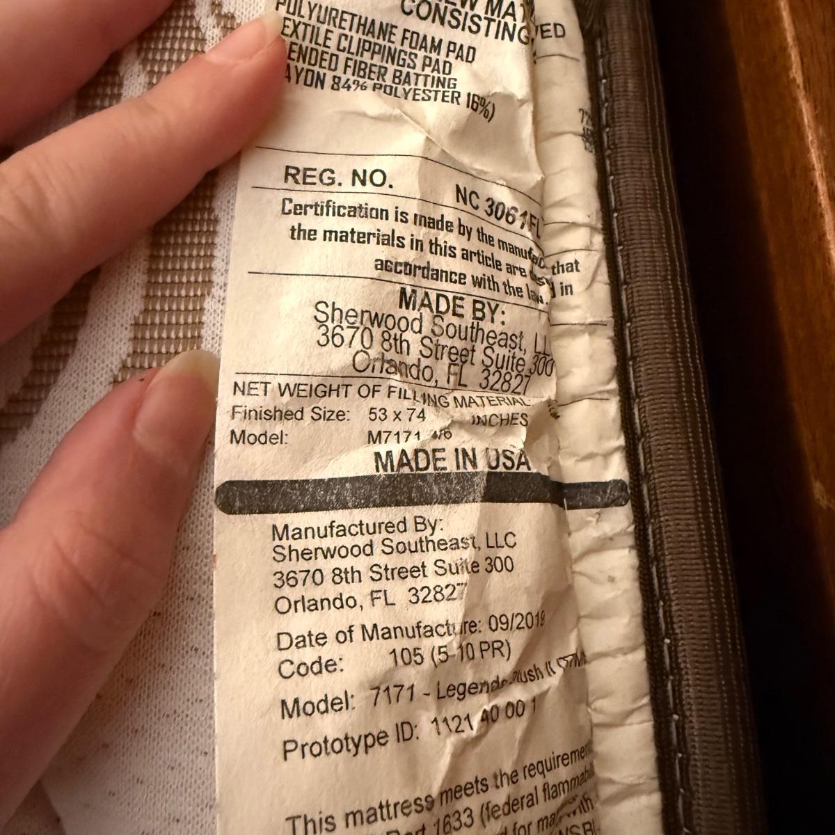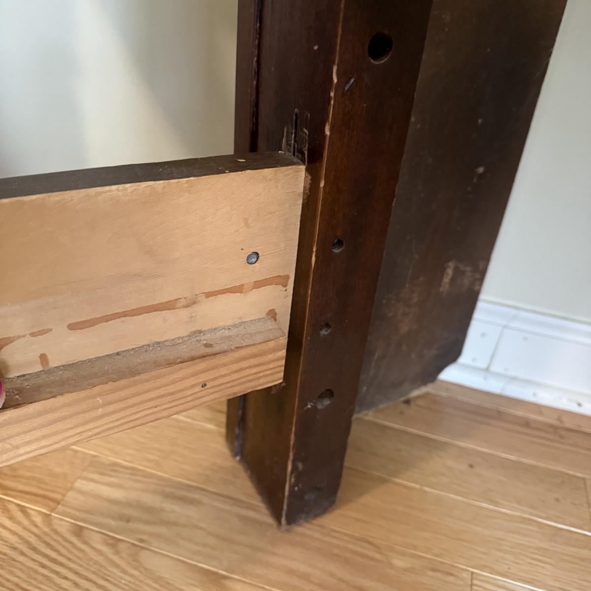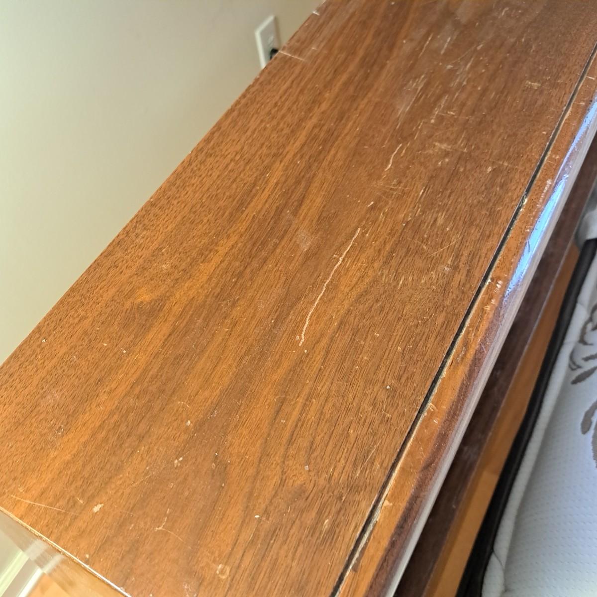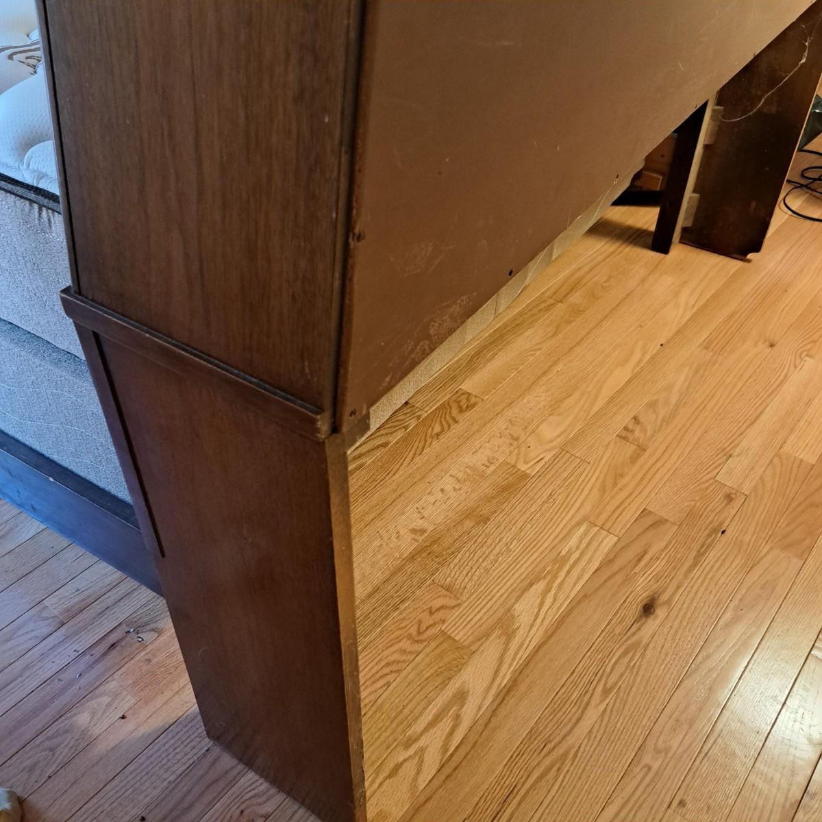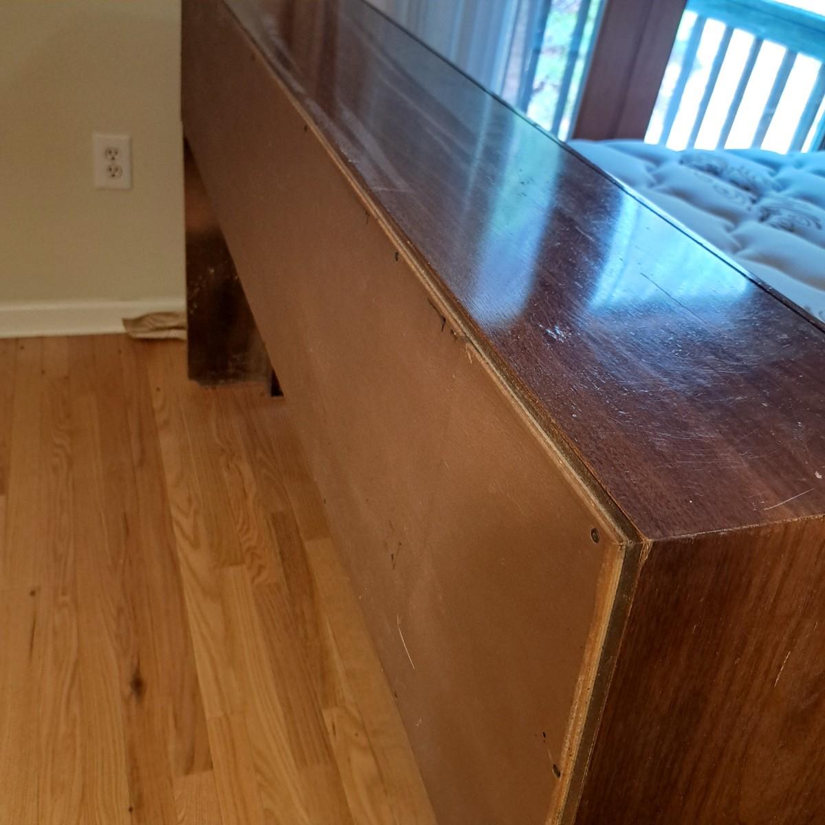 This lot contains a groovy mid-century modern full bed frame. The frame itself is made out of wood and the headboard has a shelf with a sliding wicker screen. Top of headboard has a few scratches and surface scuffs and a small area of veneer is peeling from the side panel as shown. The frame measures 57” x 88” x 36.5”H, headboard and the mattress with box spring sits 25”H. The mattress and box spring are Legends by Babcock and measure 53” x 74” and has 18”H with box spring. There does not appear to be a need for tools to break down the frame, it seems to pop in and out of itself. See pictures for details. The mattress is available to the winning bidder if desired, but the winning bidder is not required to take it. Local pick up only. Winning bidder must bring assistance to help move and load this item due to its weight and/or size.