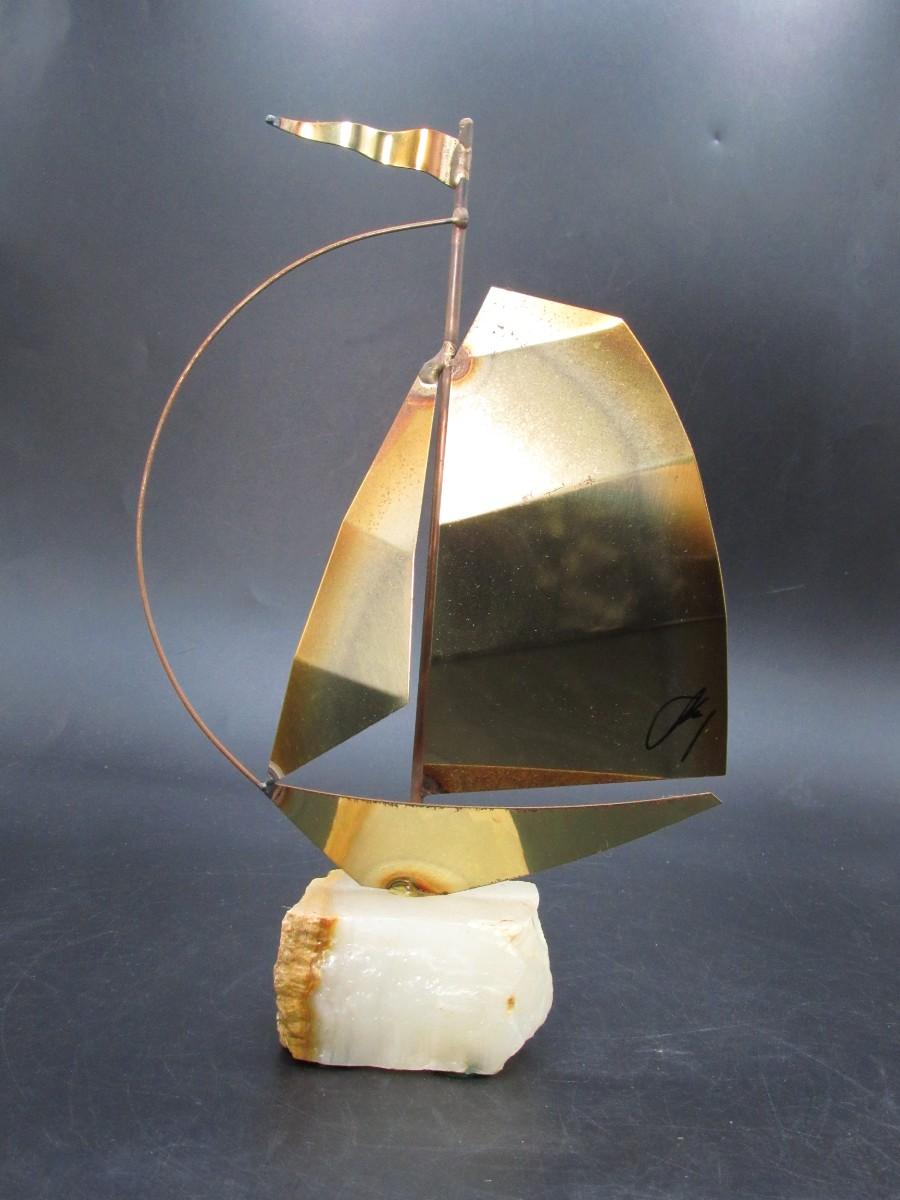 MID-CENTURY MODERN Brass METAL SAIL BOAT QUARTZ PEDESTAL, SIGNED Nautical