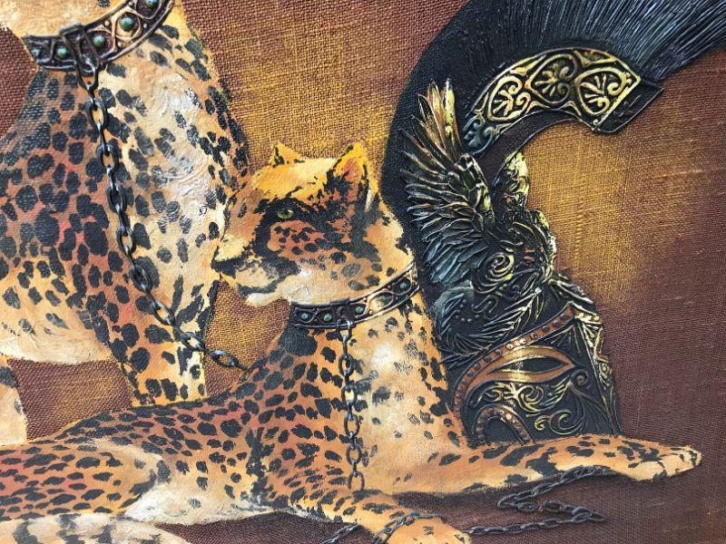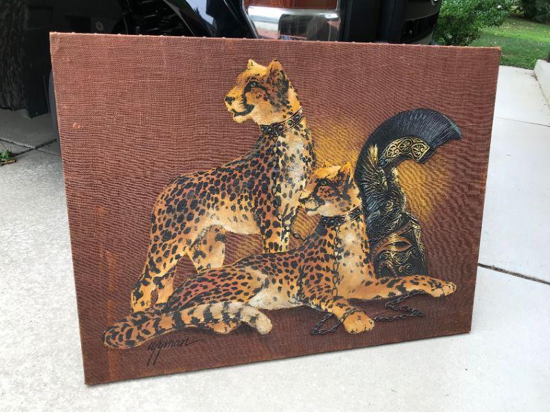 Roman Cheetah Oil Painting on Burlap Canvas. The textured brush strokes emphasize certain areas to add character to the piece. Signed by artist Wyman. 48" by 36" by 1.5 stretched over wood support frame. All items SOLD AS IS, AS SHOWN and subject to reserve bid. Unsold items will be relisted. Pick-Up only on Wednesday May 29th between 5-7 PM. Please read Shipping Terms